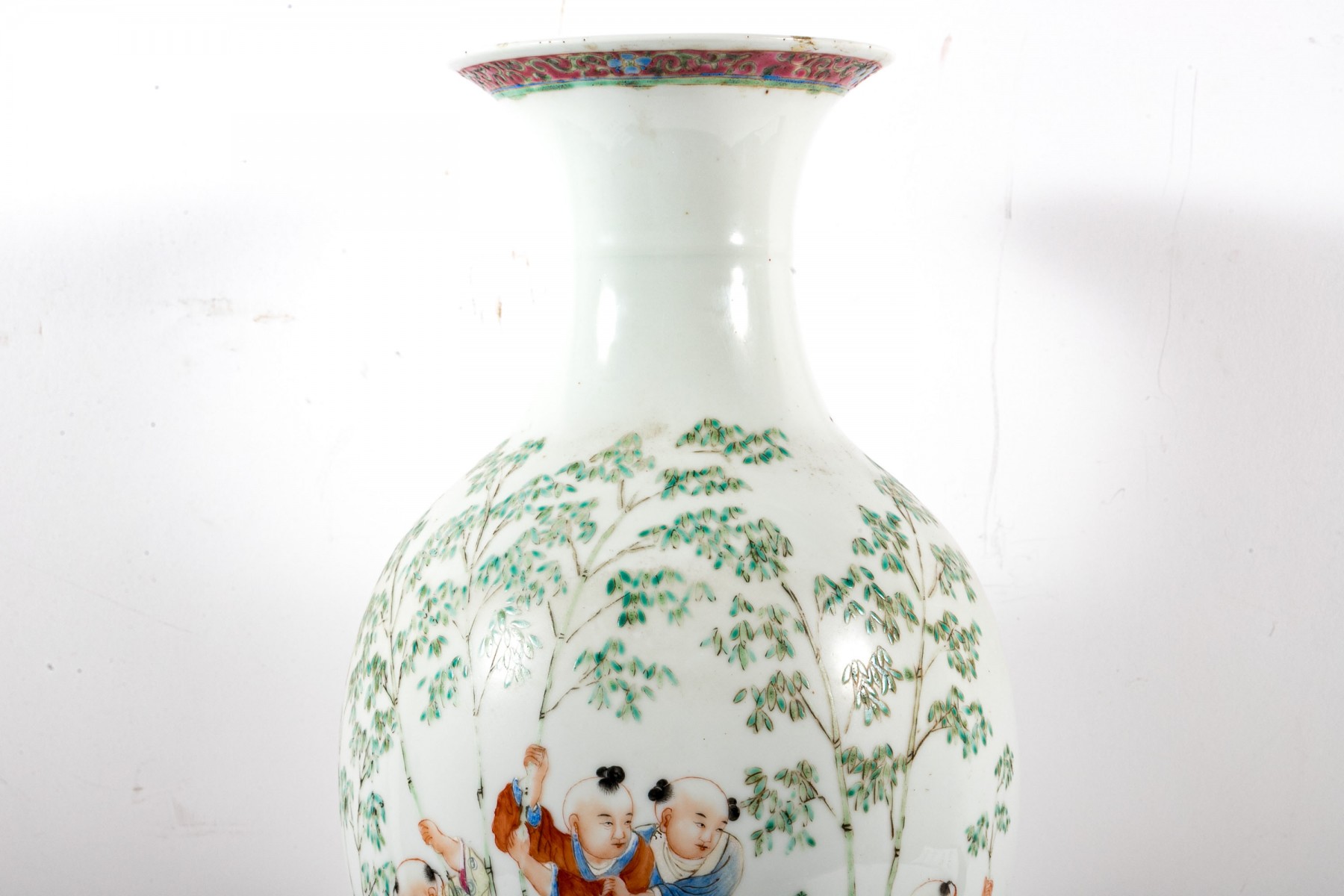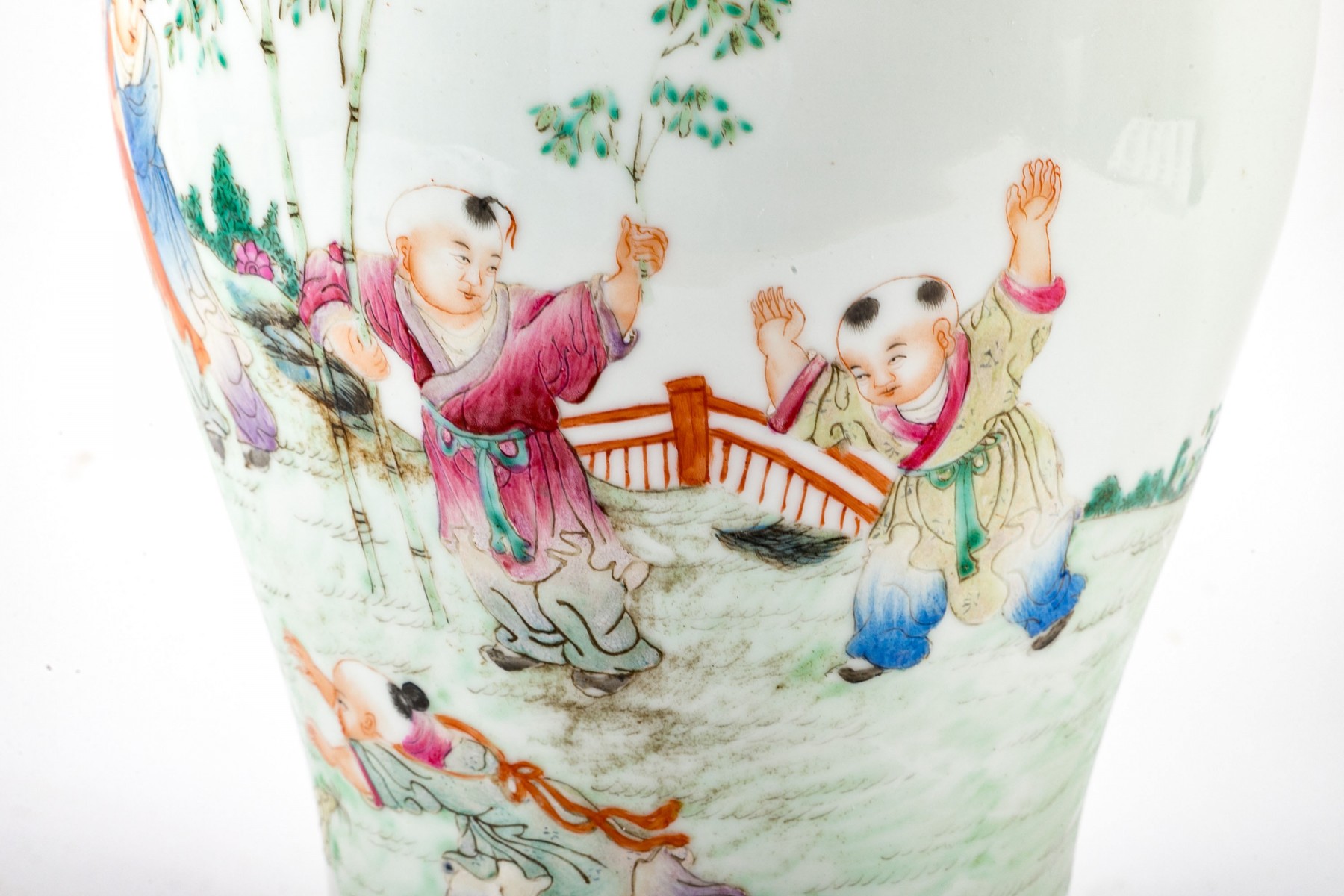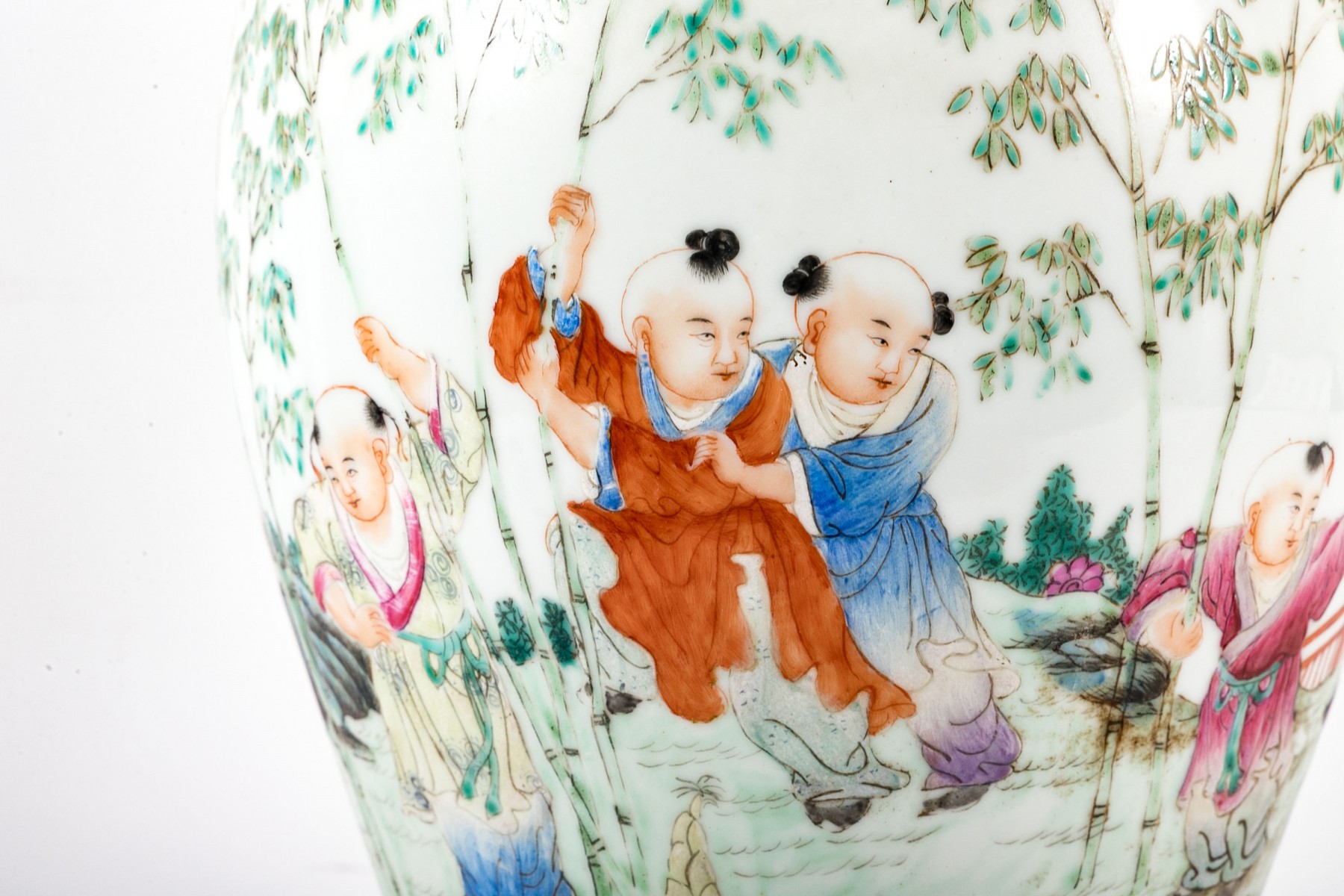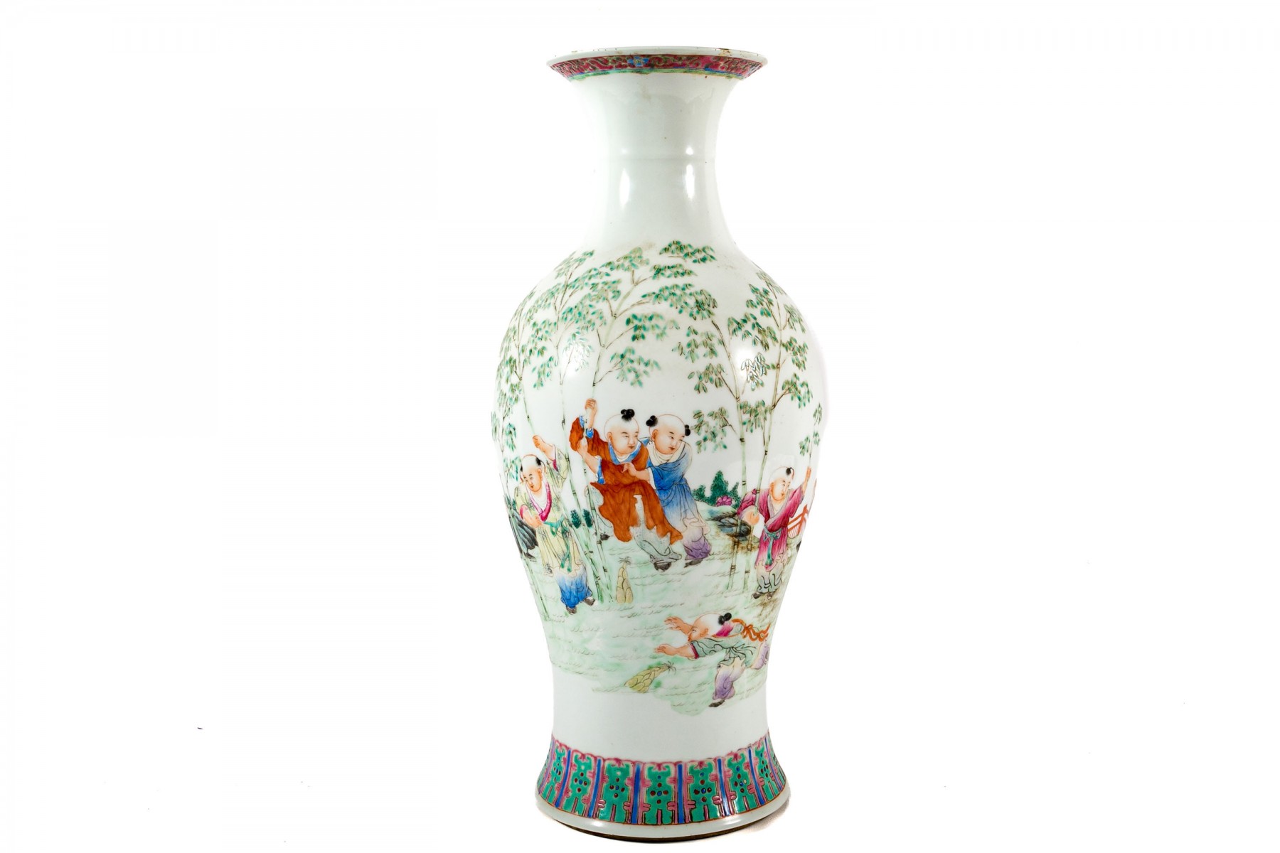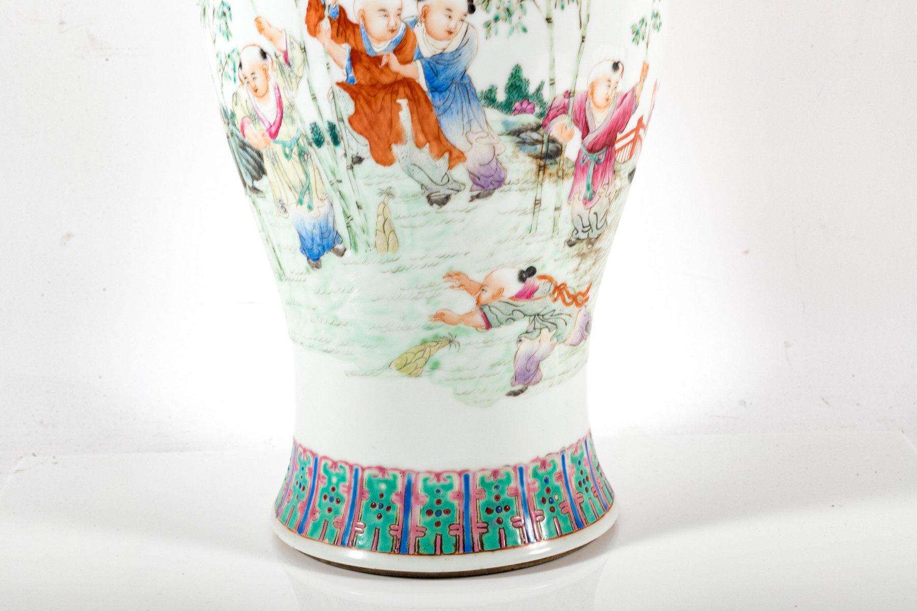 A lovely Chinese porcelain famille rose vase displaying a flared rim over a tall cylindrical neck leading to a baluster body. Decorated with scenes of boys playing in a field dotted with bamboo, short foliage, and rocky outcrops. The bottom has been drilled with a hole for use as a planter.