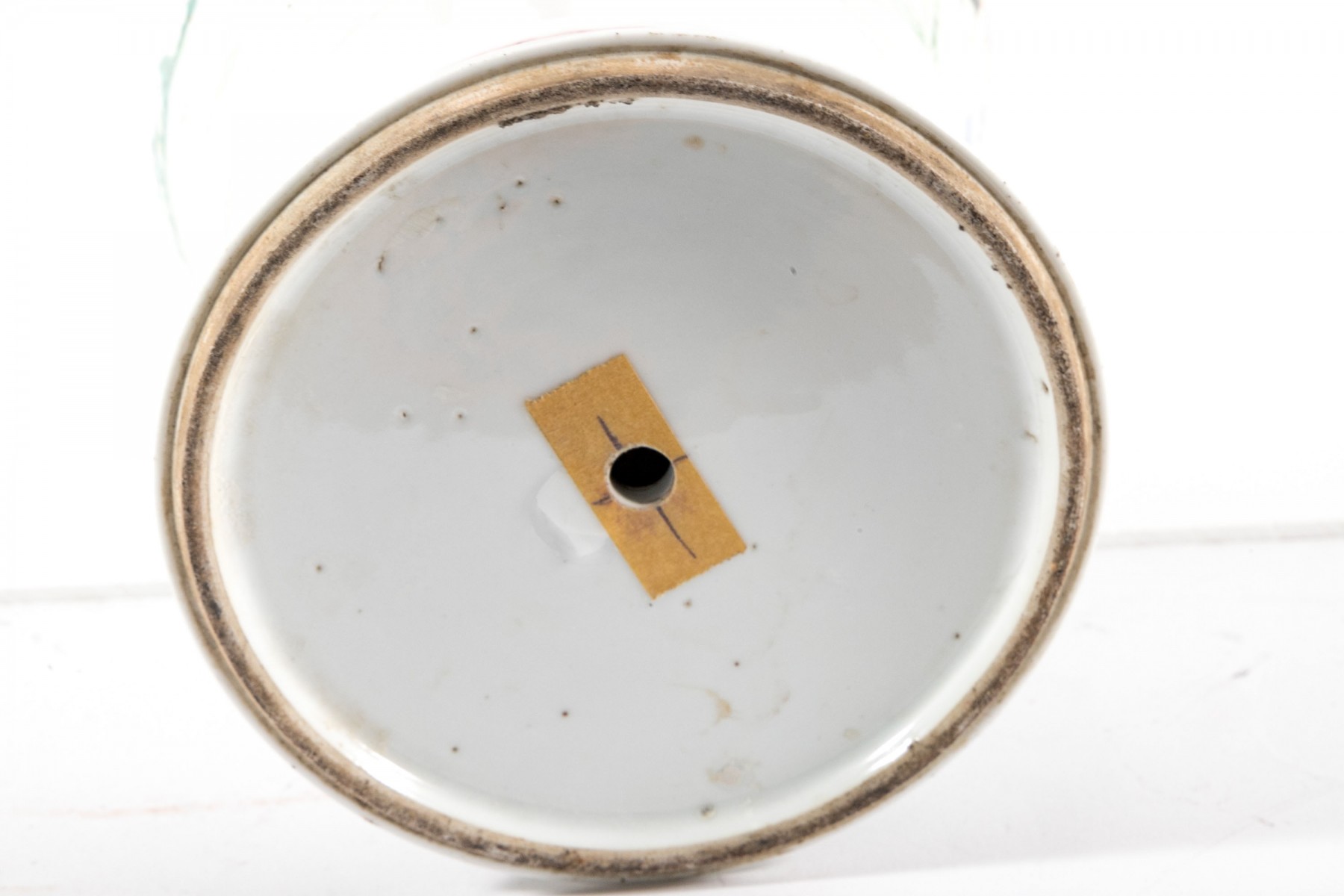 Displays well with minor finish wear, minor discoloration. Some small glaze pitting or iron oxide fleck around the rim. Some wear around the drilled hole to the underside that does not affect the outward appearance.