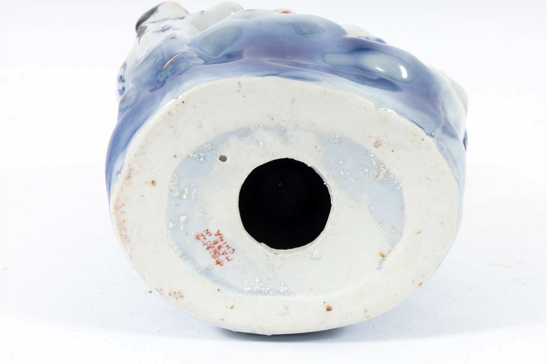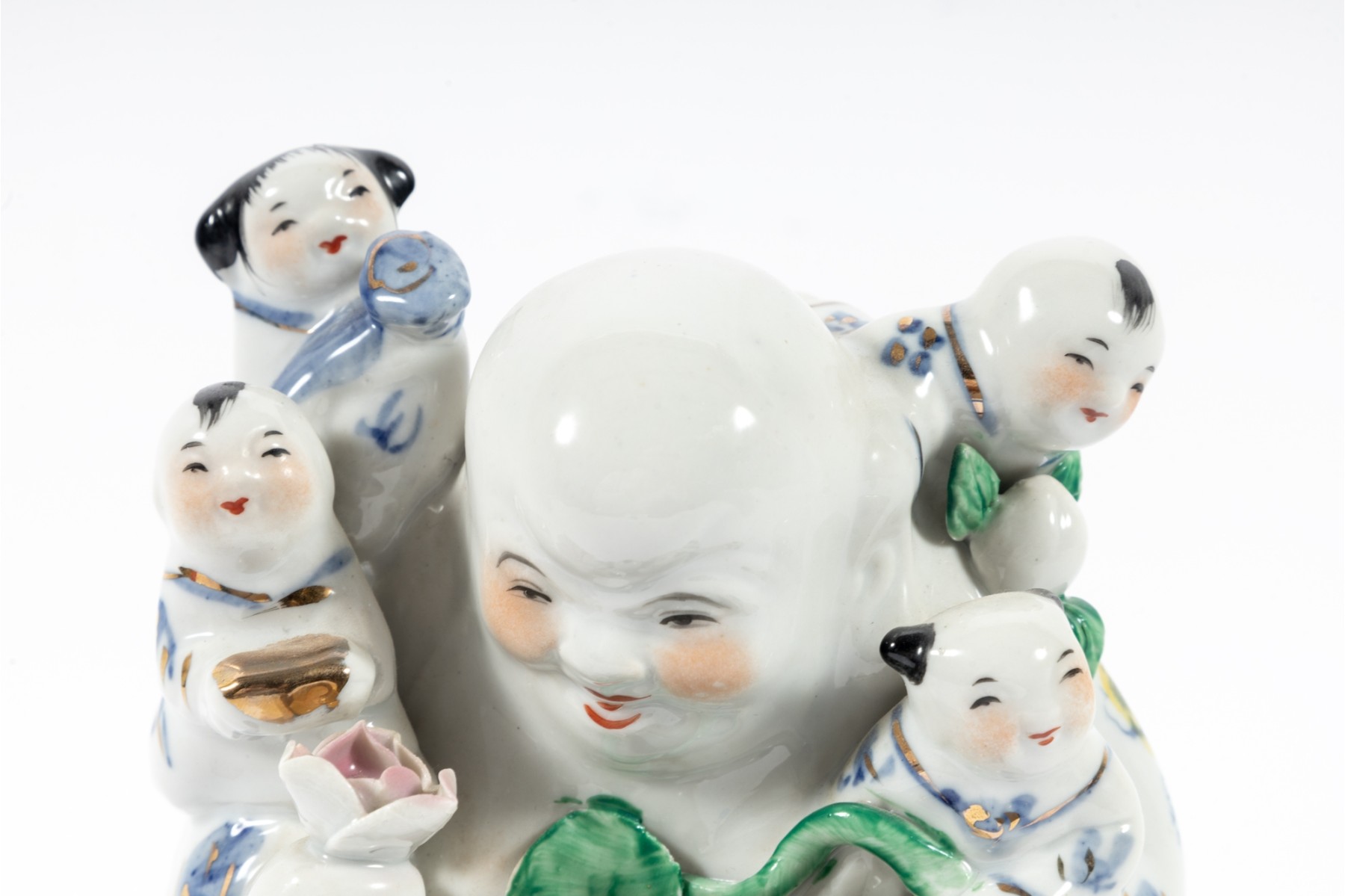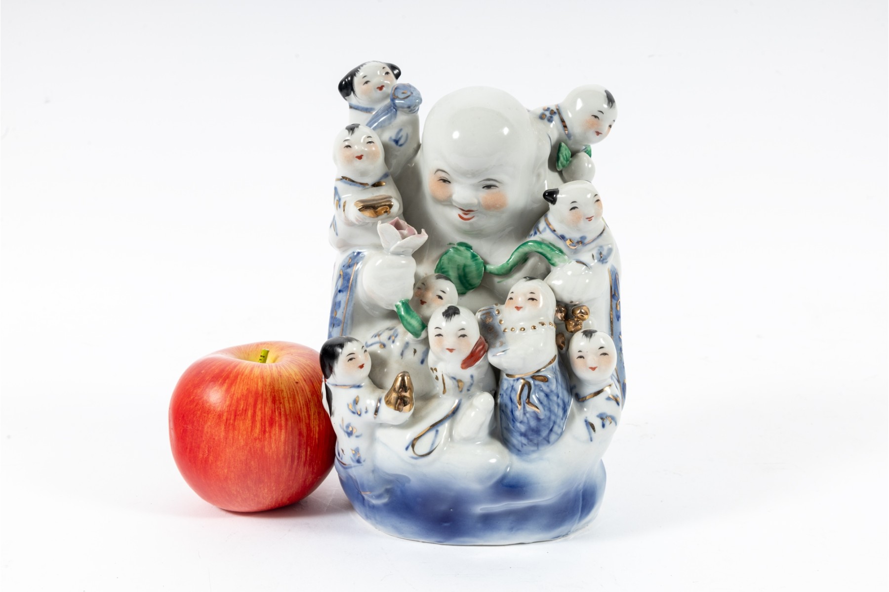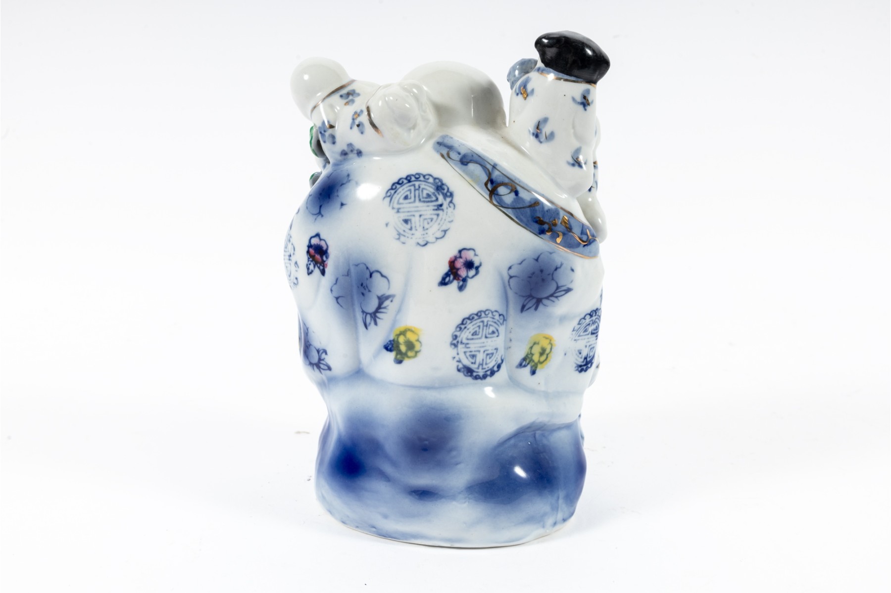 A small porcelain figure of Budai, the laughing/smiling Bhudda God of good fortune embellished with hand-painted details and gilt trim. Made in China.
