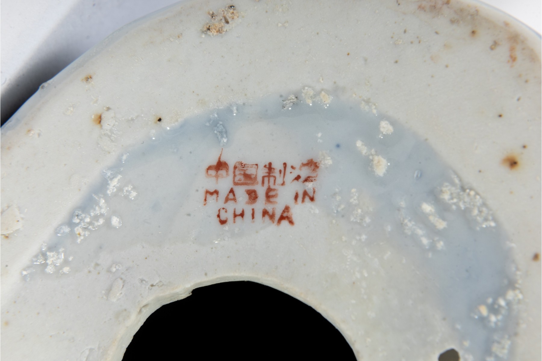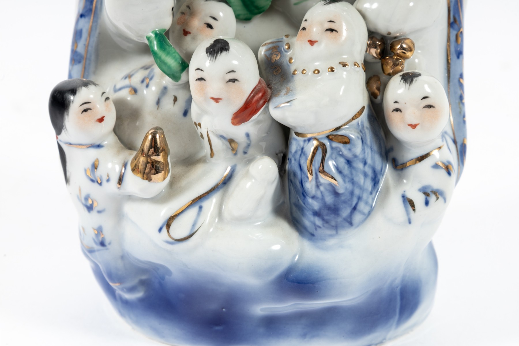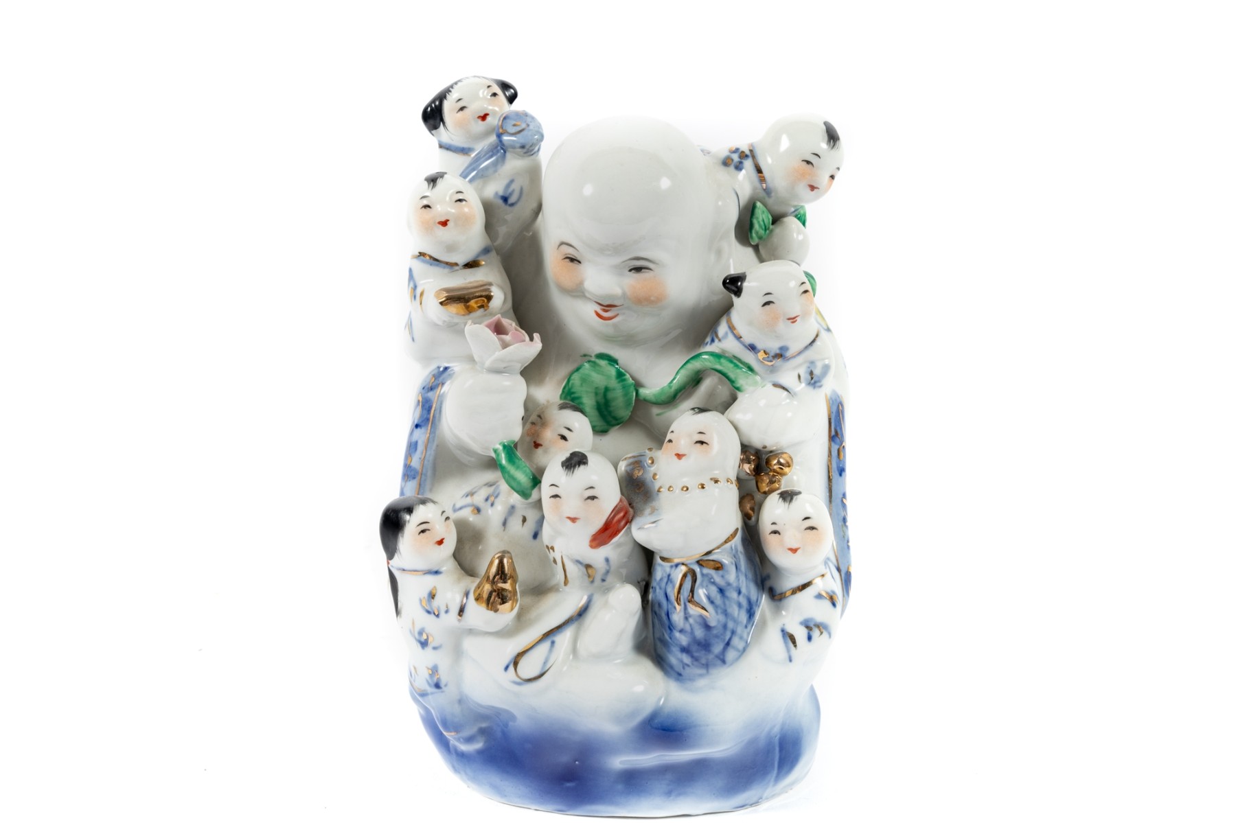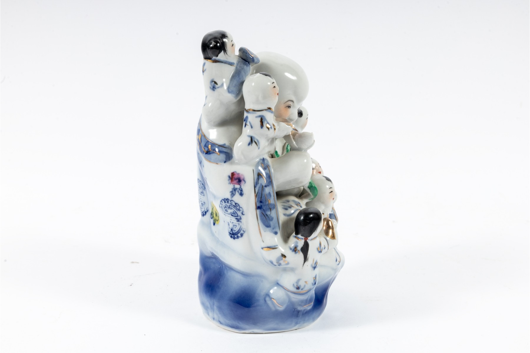 A small porcelain figure of Budai, the laughing/smiling Bhudda God of good fortune embellished with hand-painted details and gilt trim. Made in China.