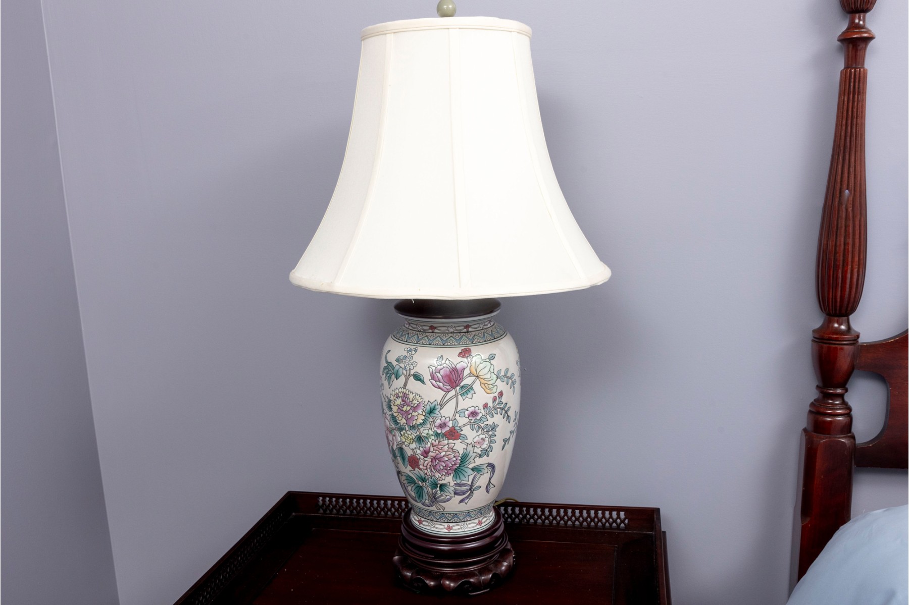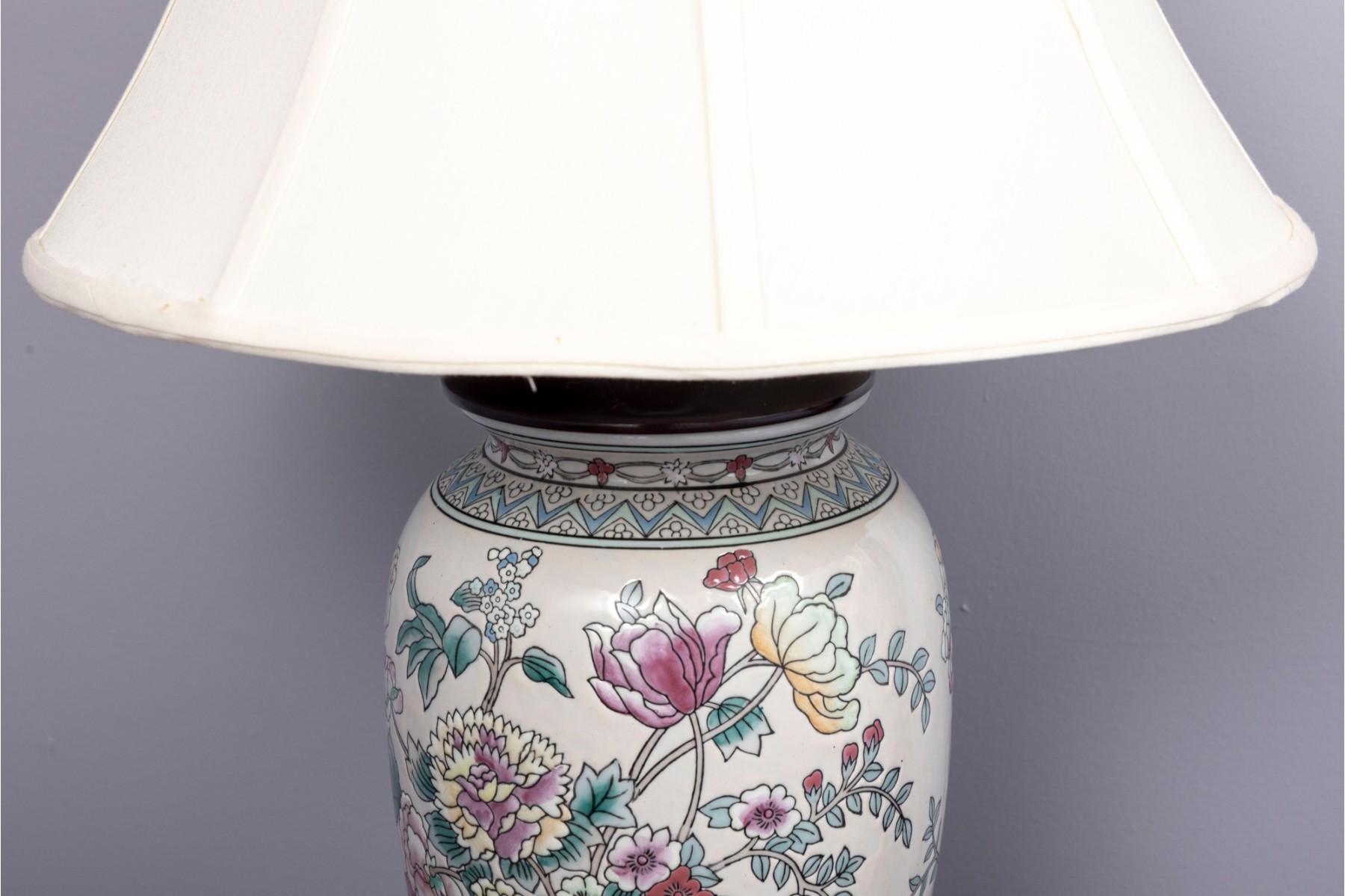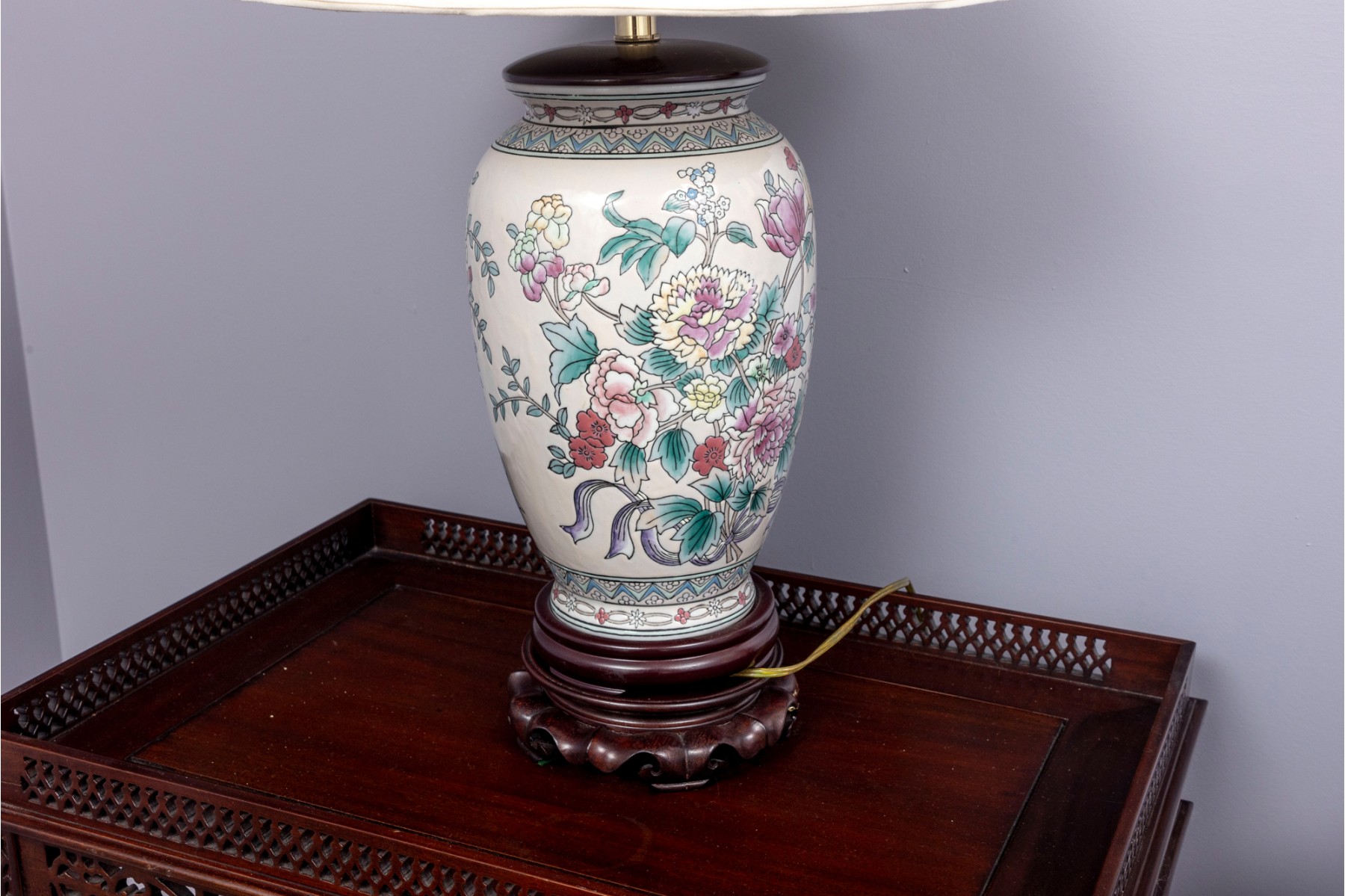 A lovely Chinese porcelain vase mounted as a table lamp, displaying famille rose florals in pretty pink, yellow, and green against a cream ground. Topped with a white fabric shade.
