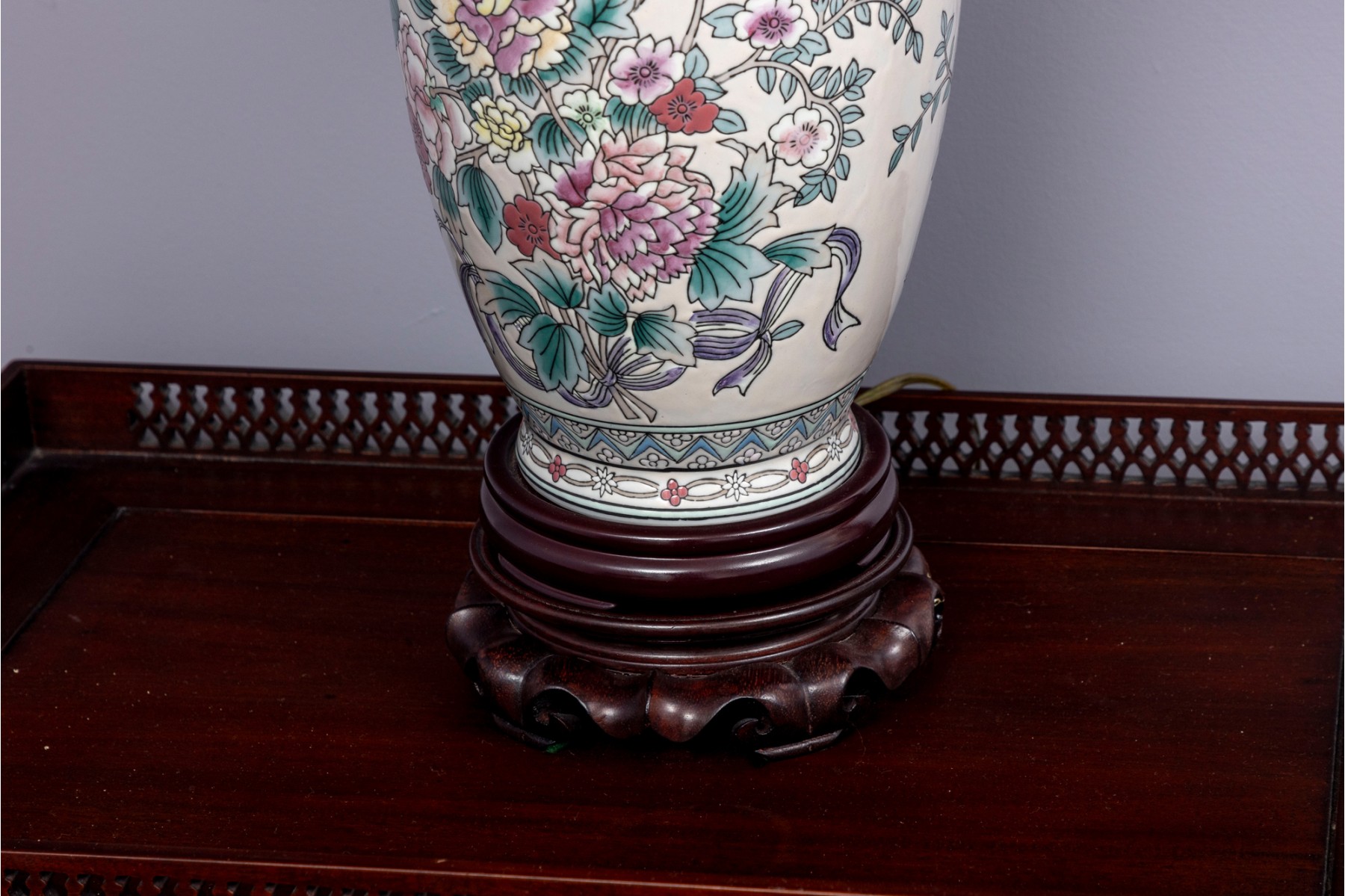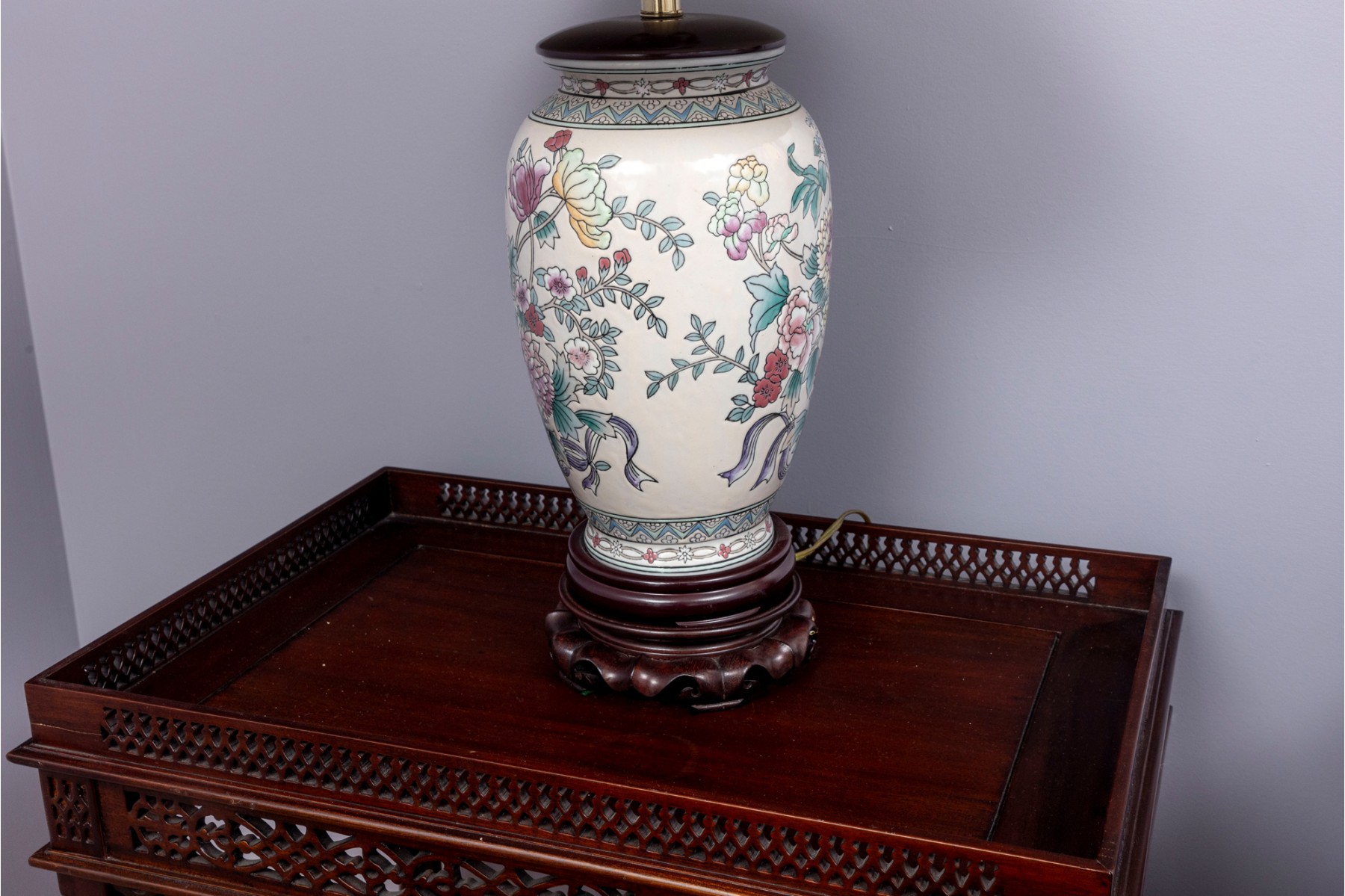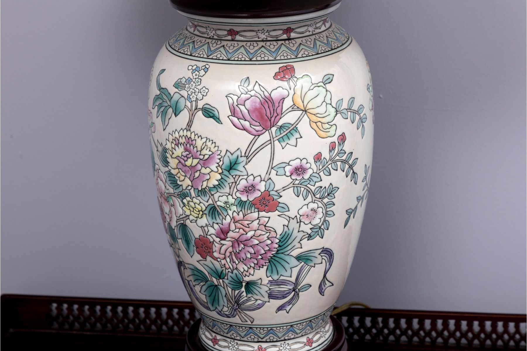 A lovely Chinese porcelain vase mounted as a table lamp, displaying famille rose florals in pretty pink, yellow, and green against a cream ground. Topped with a white fabric shade.