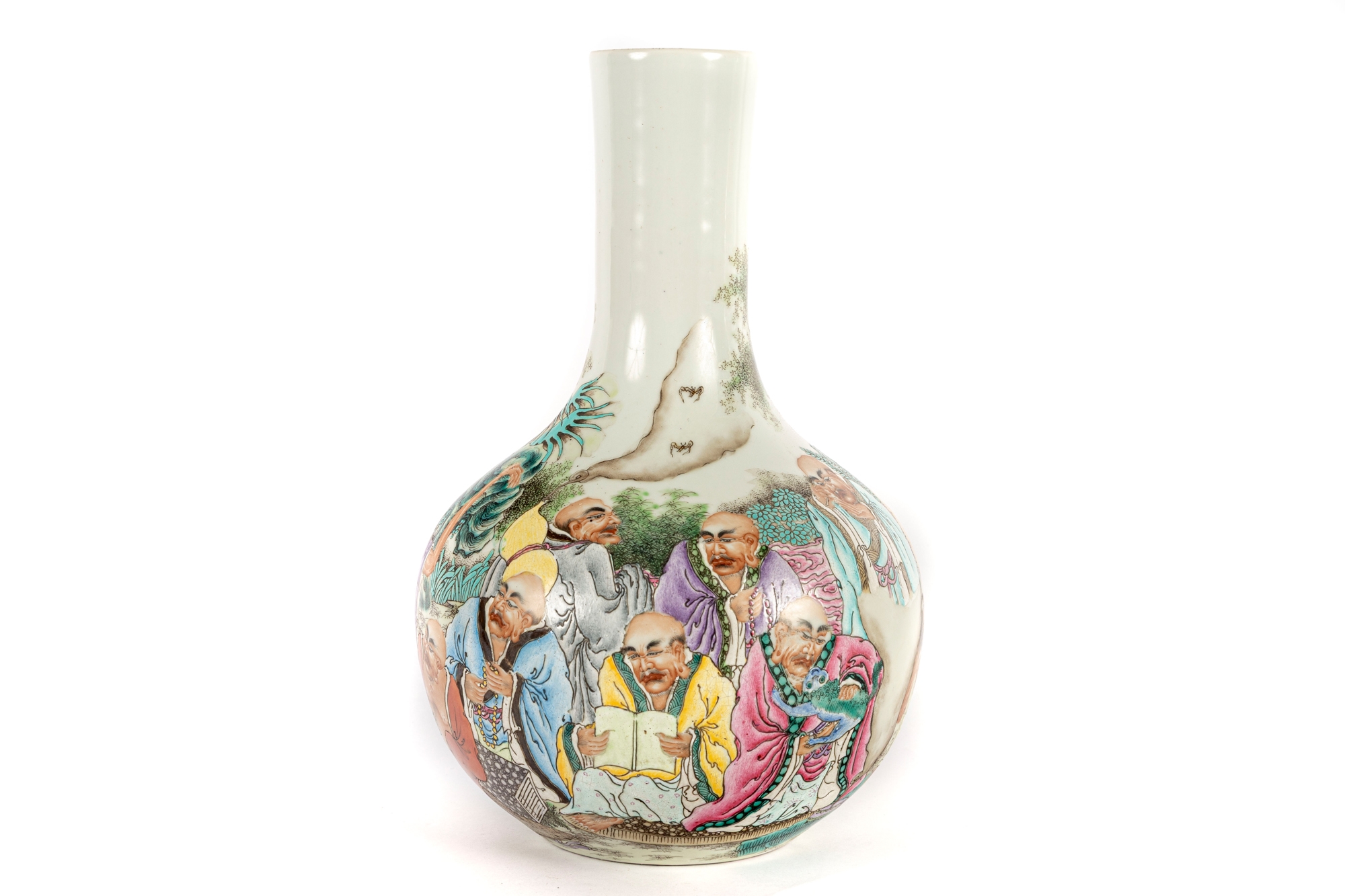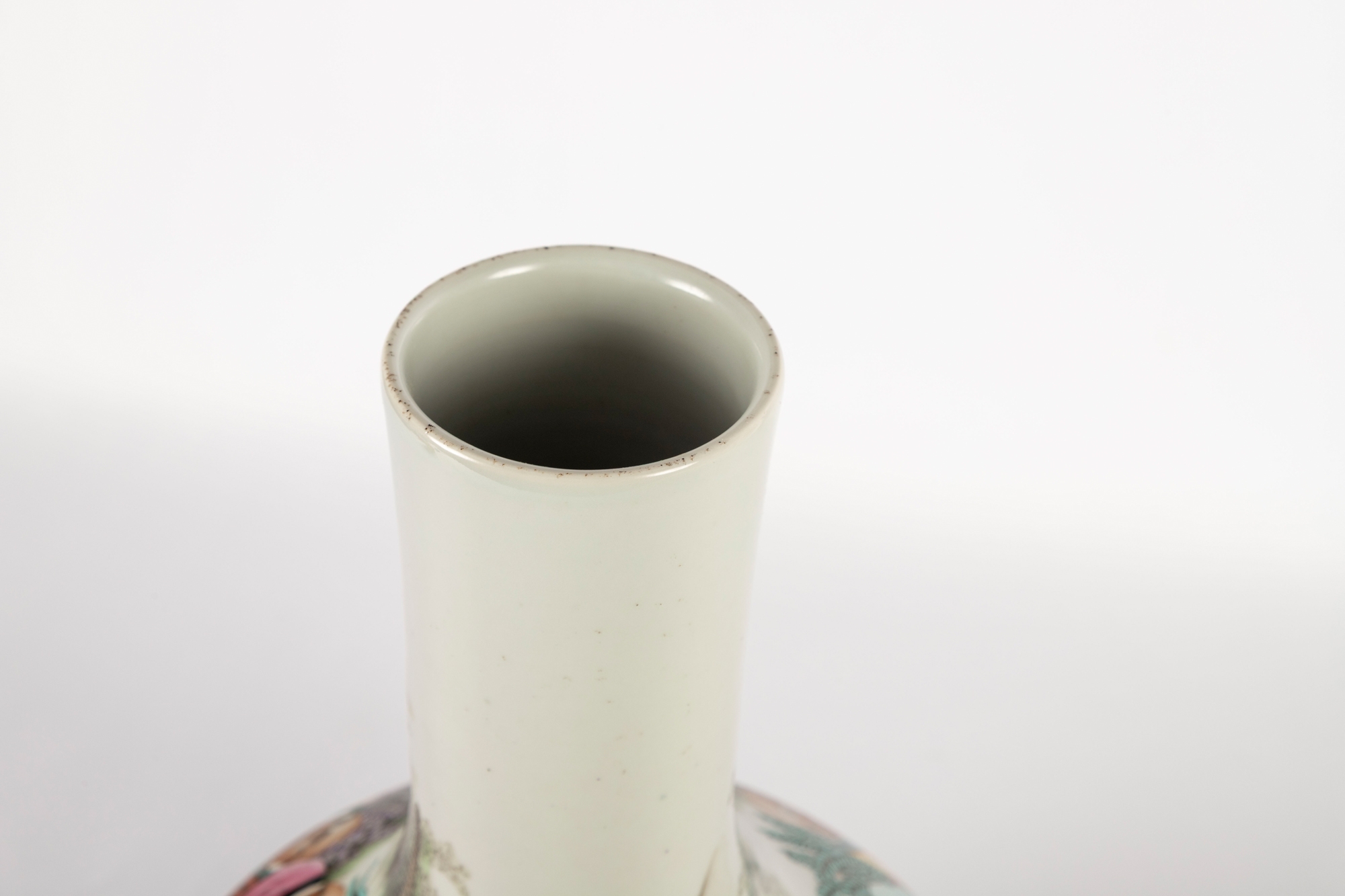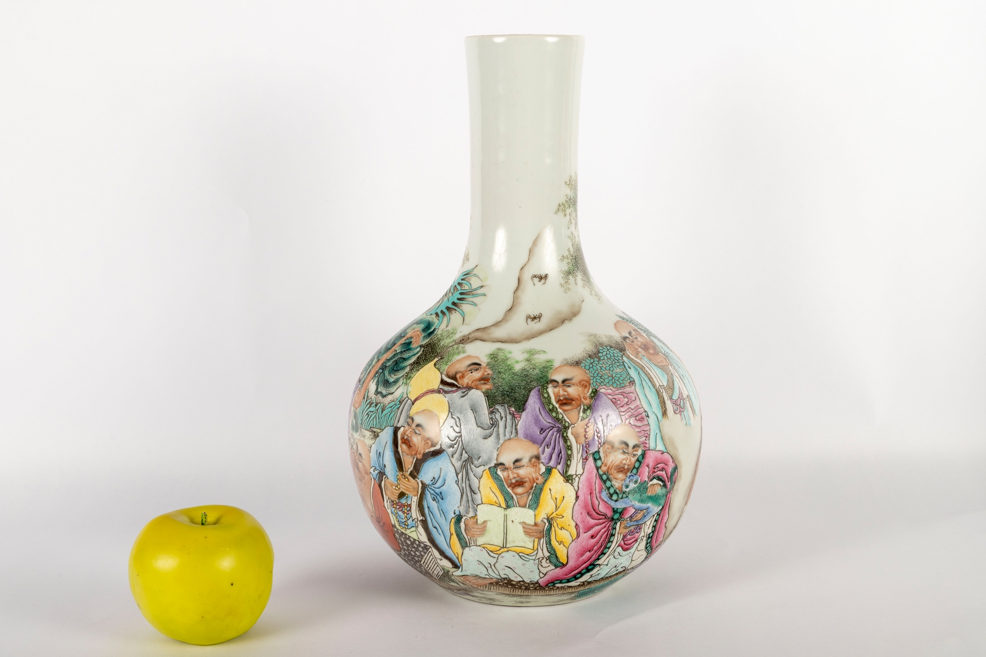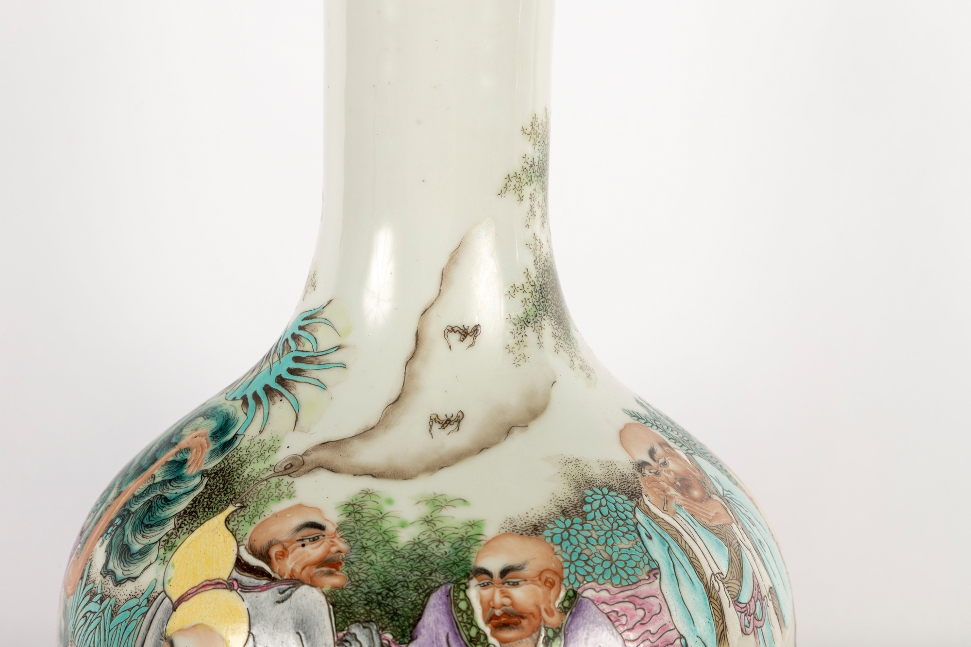 Beautiful Chinese porcelain bottle vase, dating to the Qing Dynasty period. The piece features finely hand-painted scenes depicting a gathering of scholars and elders, rendered in rich polychrome famille rose enamels. Below is a seal indicating its age.