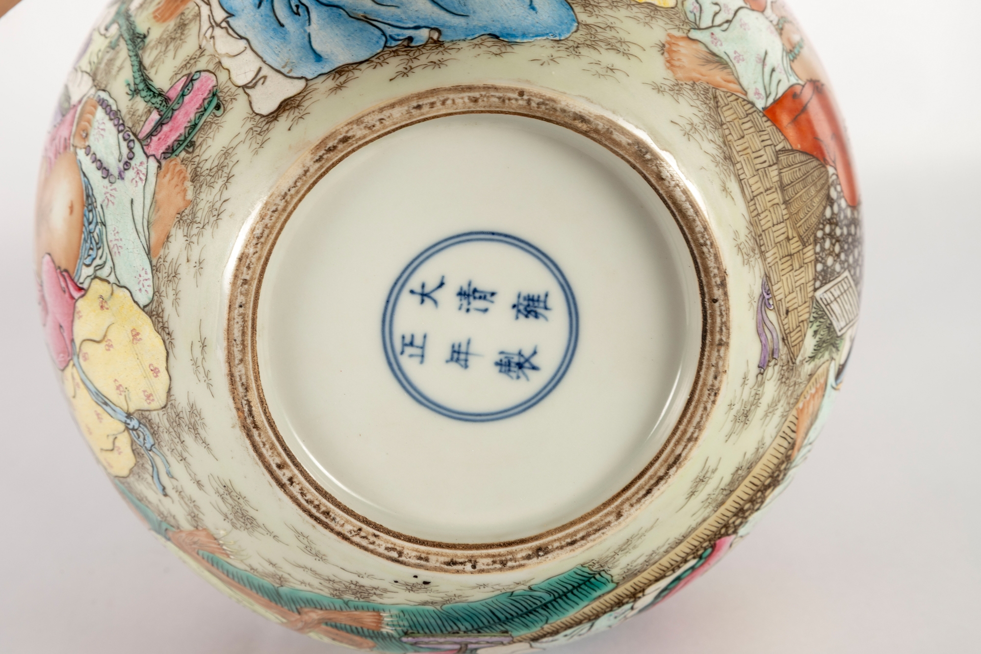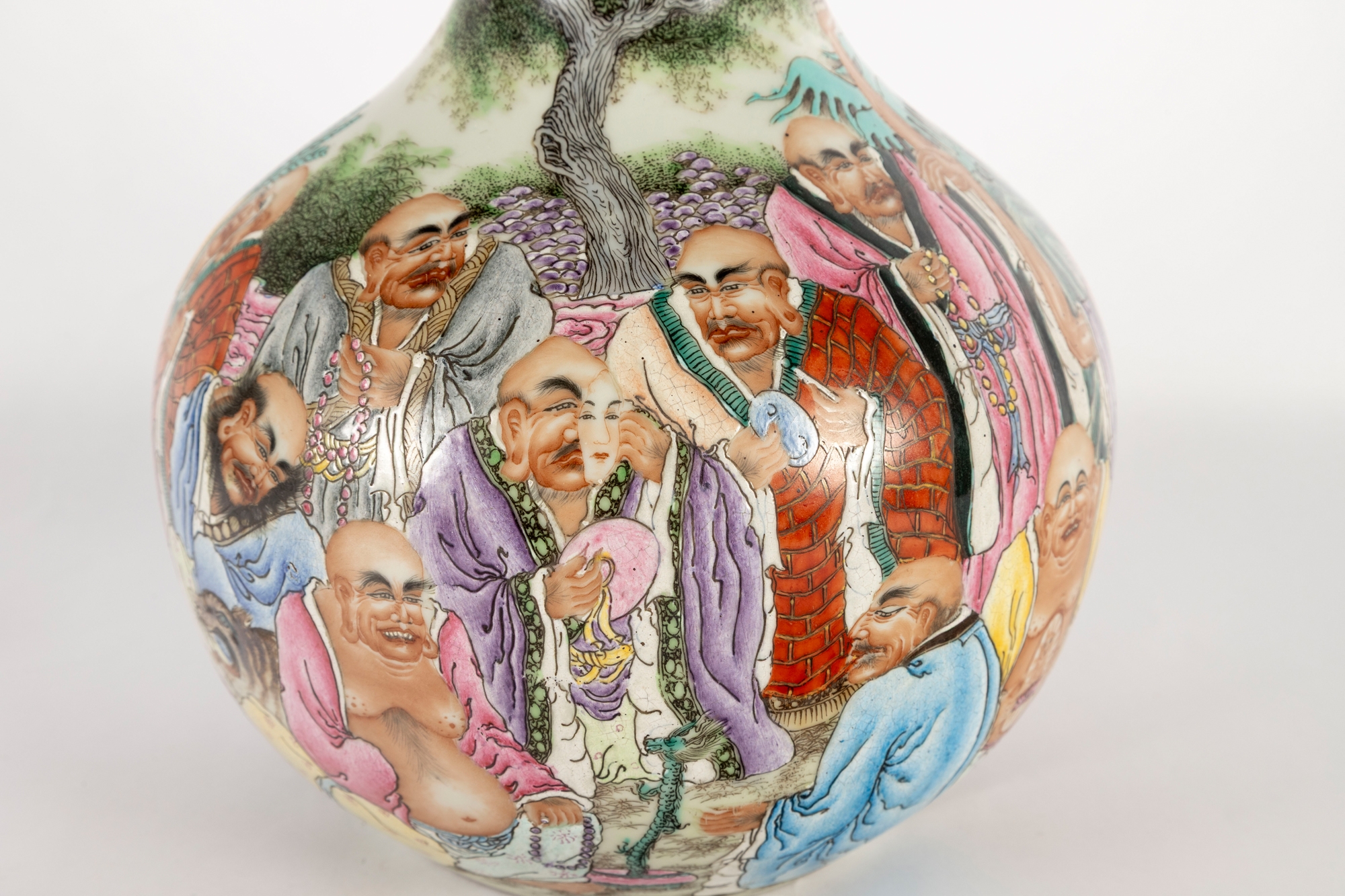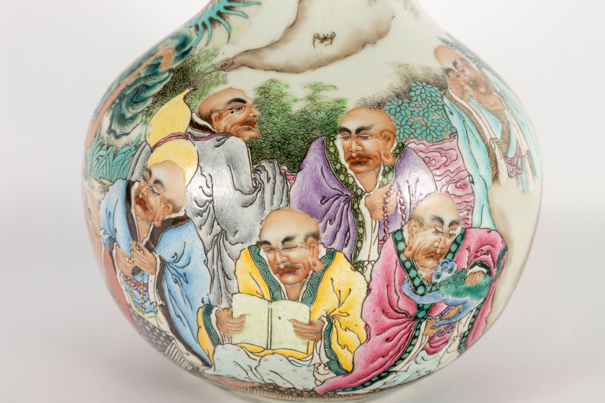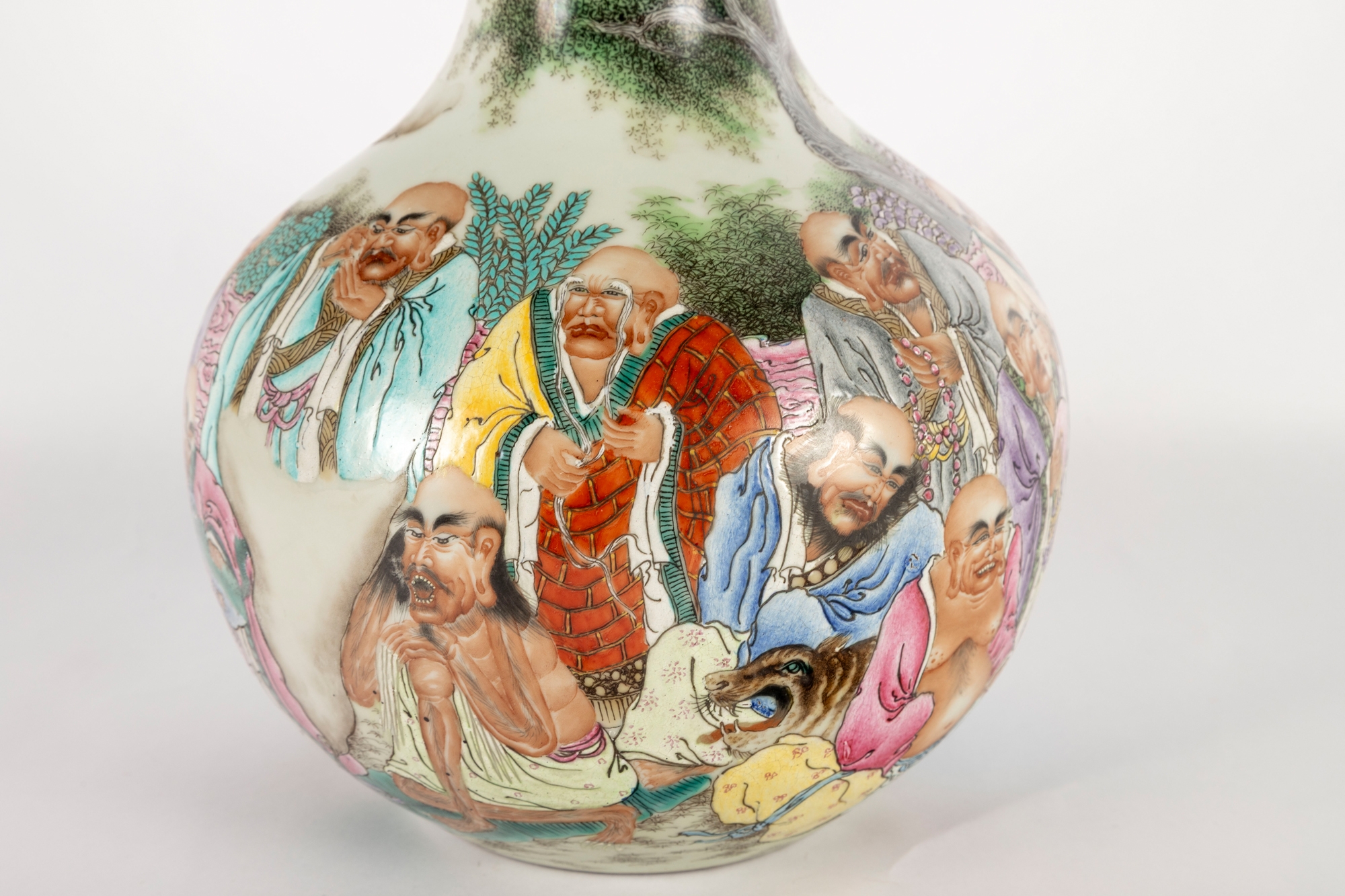 Beautiful Chinese porcelain bottle vase, dating to the Qing Dynasty period. The piece features finely hand-painted scenes depicting a gathering of scholars and elders, rendered in rich polychrome famille rose enamels. Below is a seal indicating its age.
