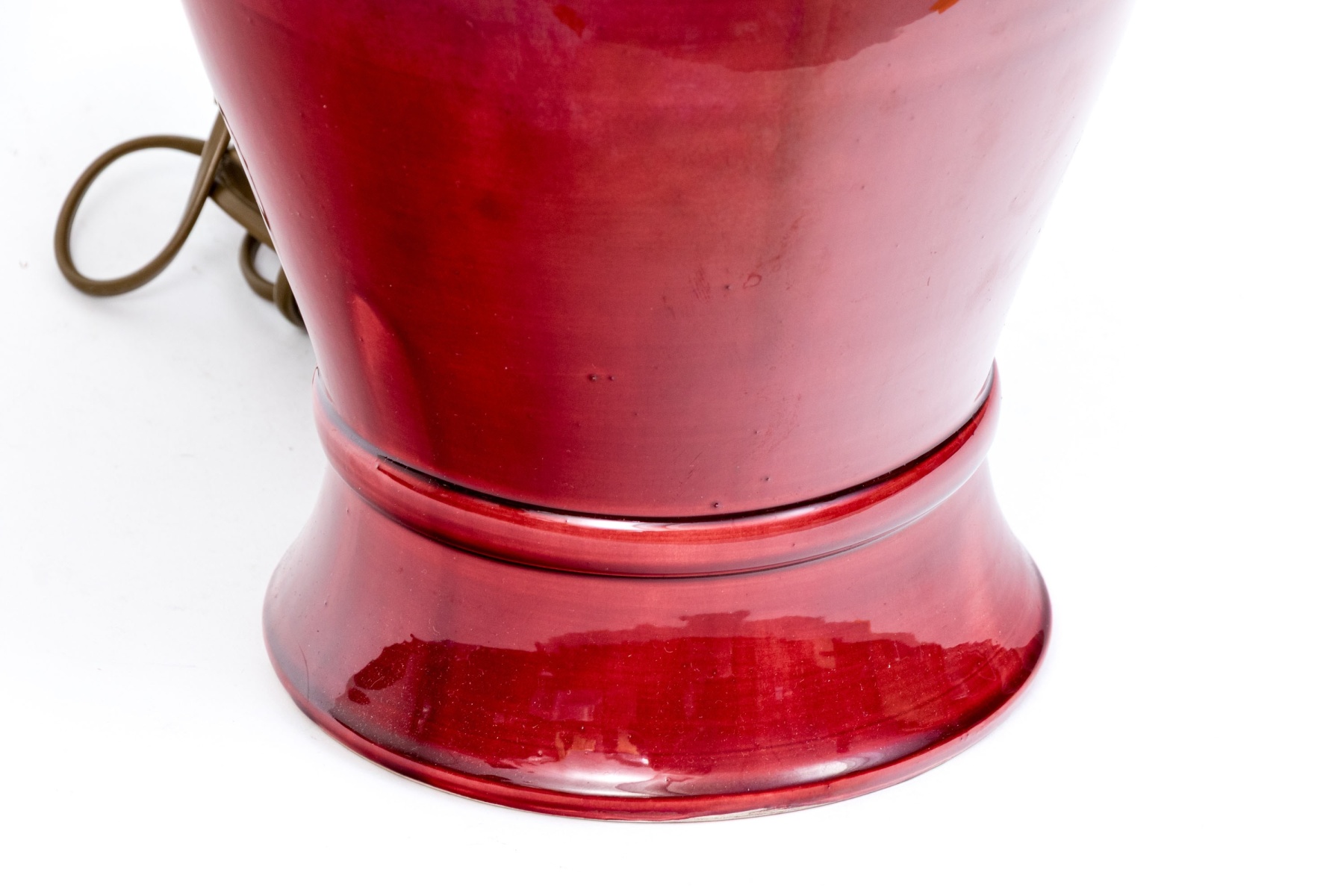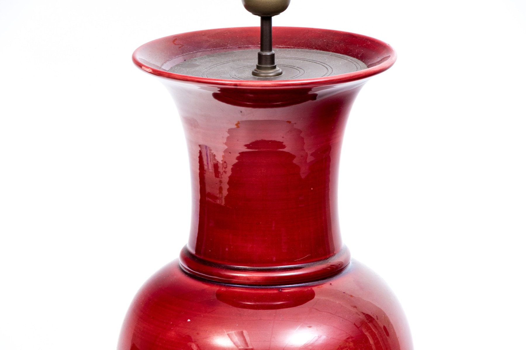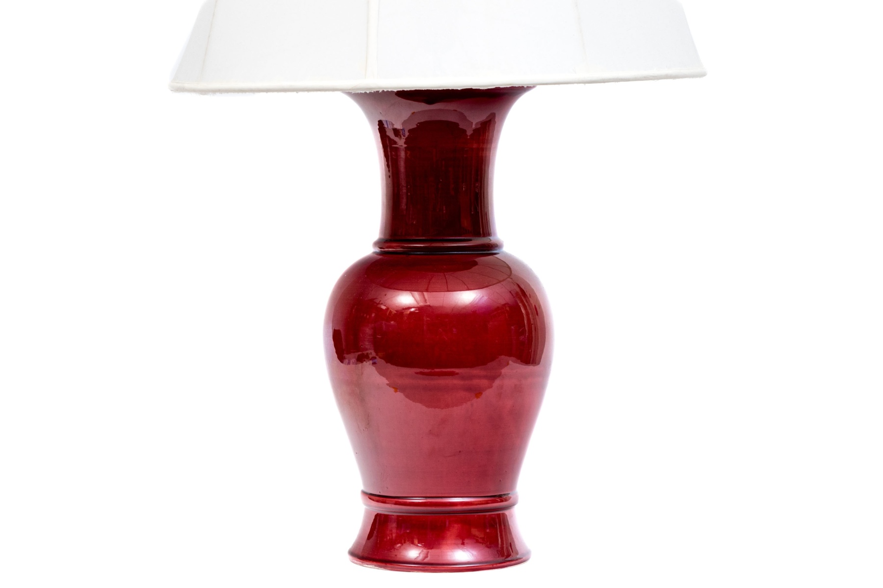 A handsome Chinese red glazed porcelain vase mounted as a table lamp, surmounted by a shade.