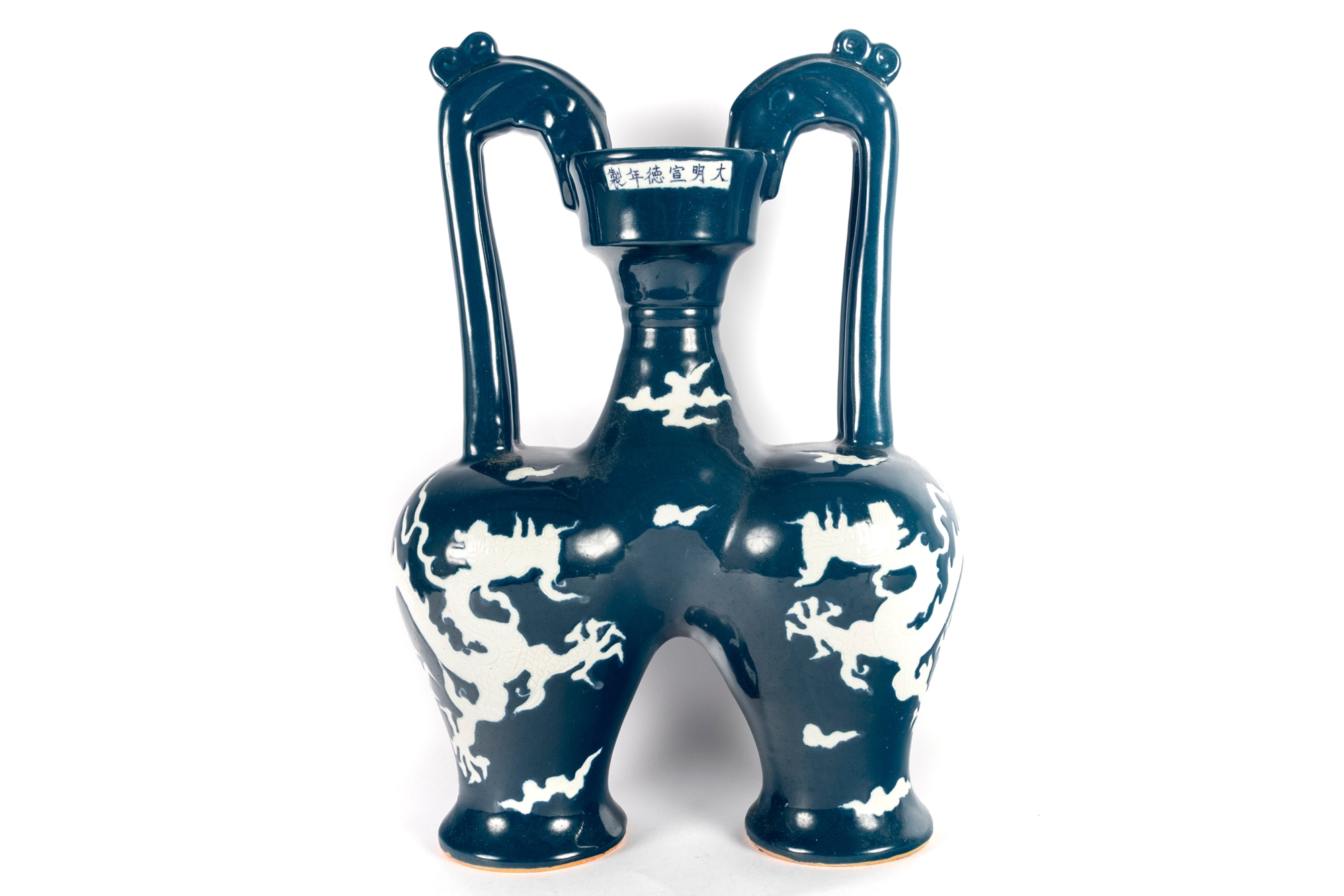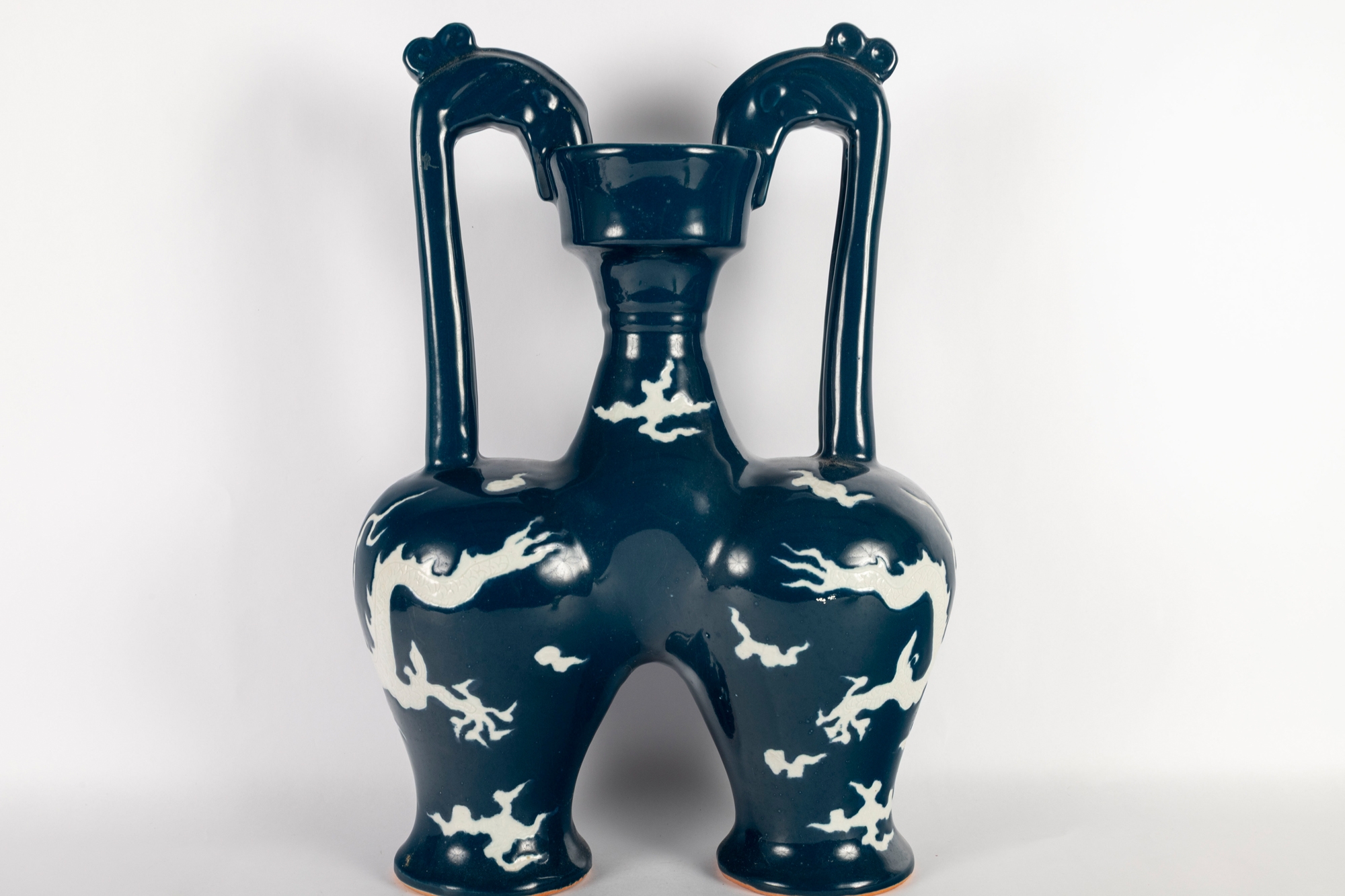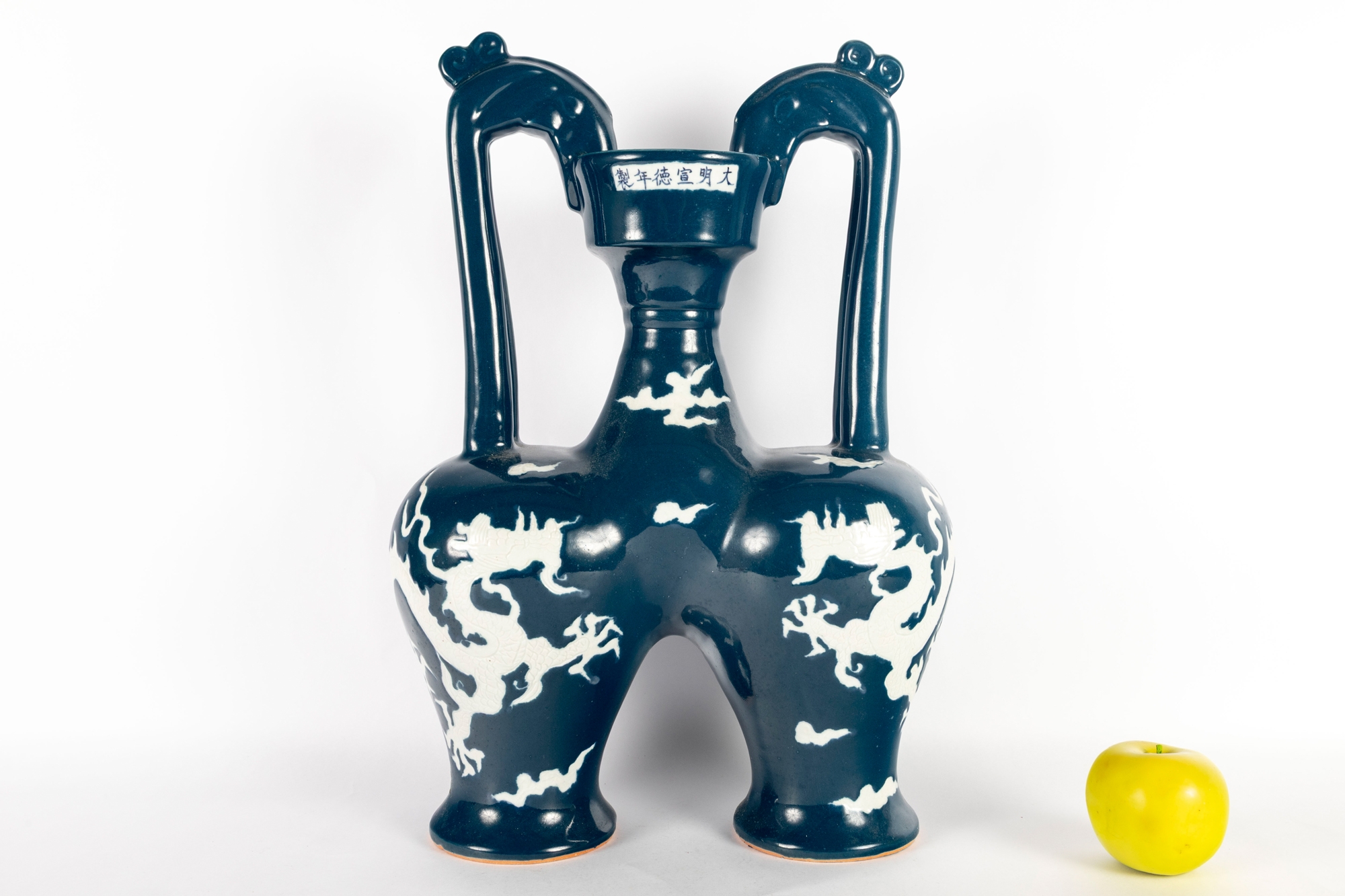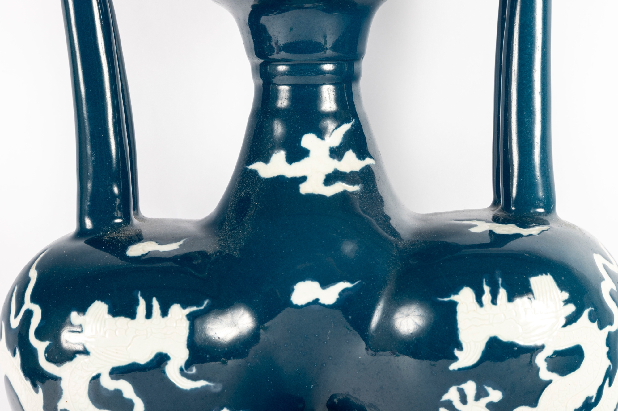 Striking Chinese porcelain double moon flask vase featuring a deep sacrificial blue glaze with contrasting white dragon and cloud motifs in relief. The vessel’s rare double-body form, joined at the neck with two elegantly arched handles, is a distinctive design often associated with Qing Dynasty ceremonial or imperial-inspired wares.