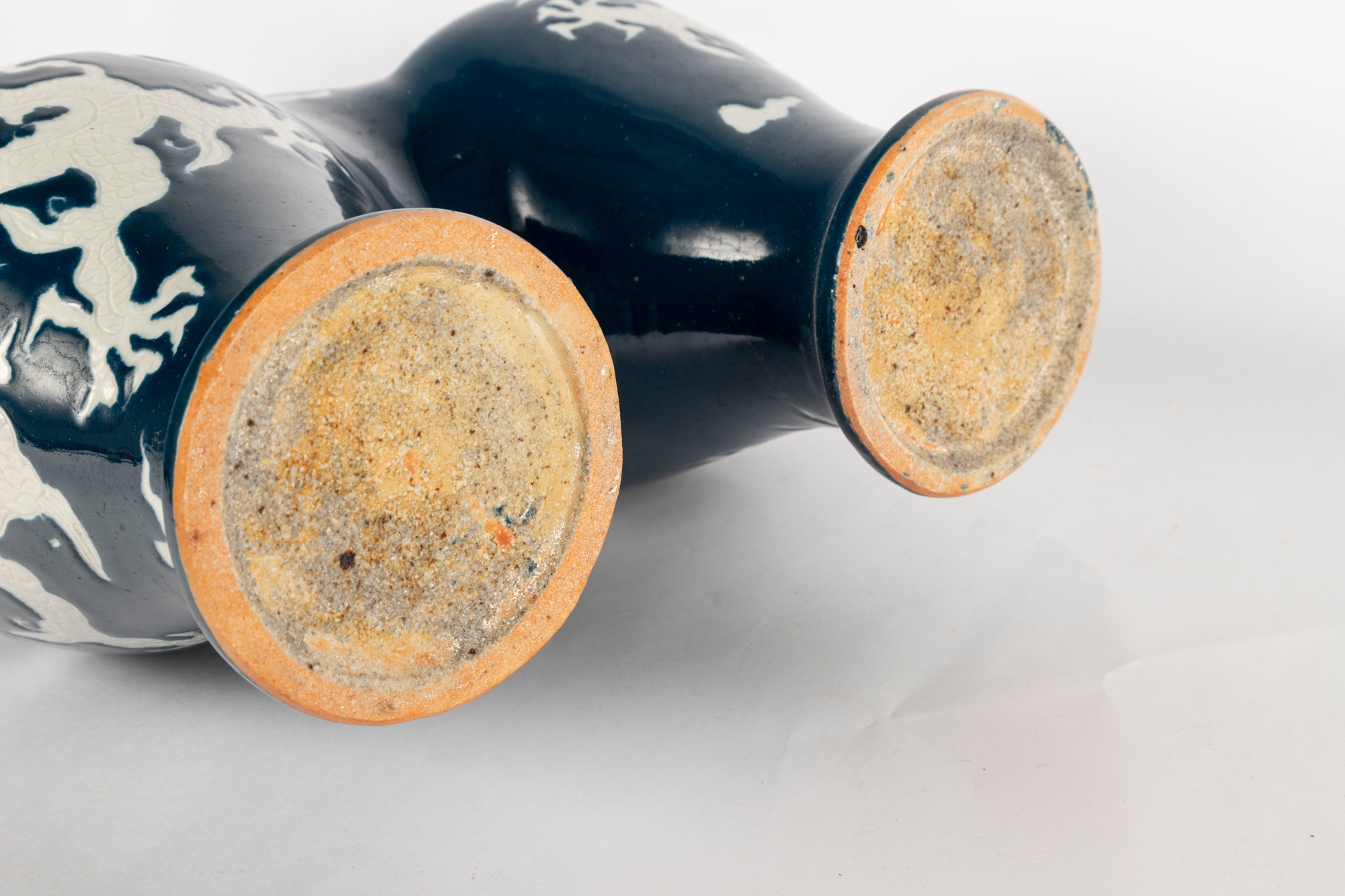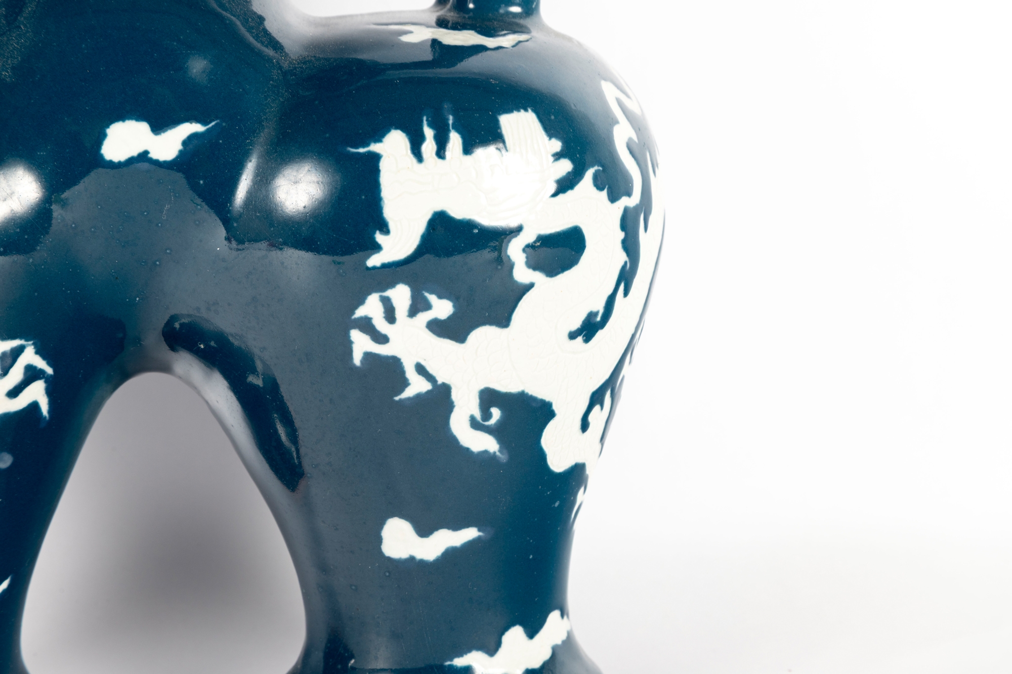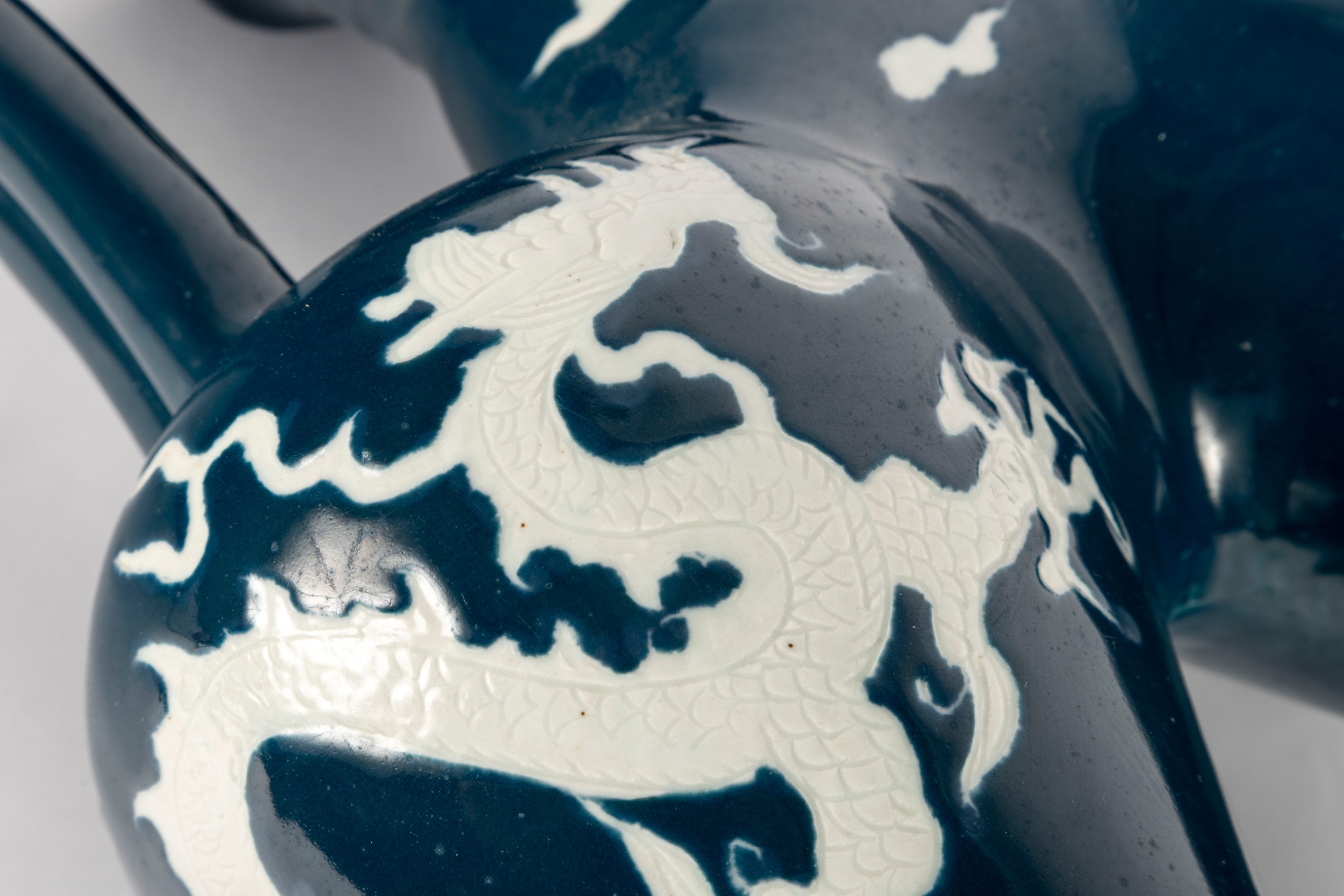 Striking Chinese porcelain double moon flask vase featuring a deep sacrificial blue glaze with contrasting white dragon and cloud motifs in relief. The vessel’s rare double-body form, joined at the neck with two elegantly arched handles, is a distinctive design often associated with Qing Dynasty ceremonial or imperial-inspired wares.