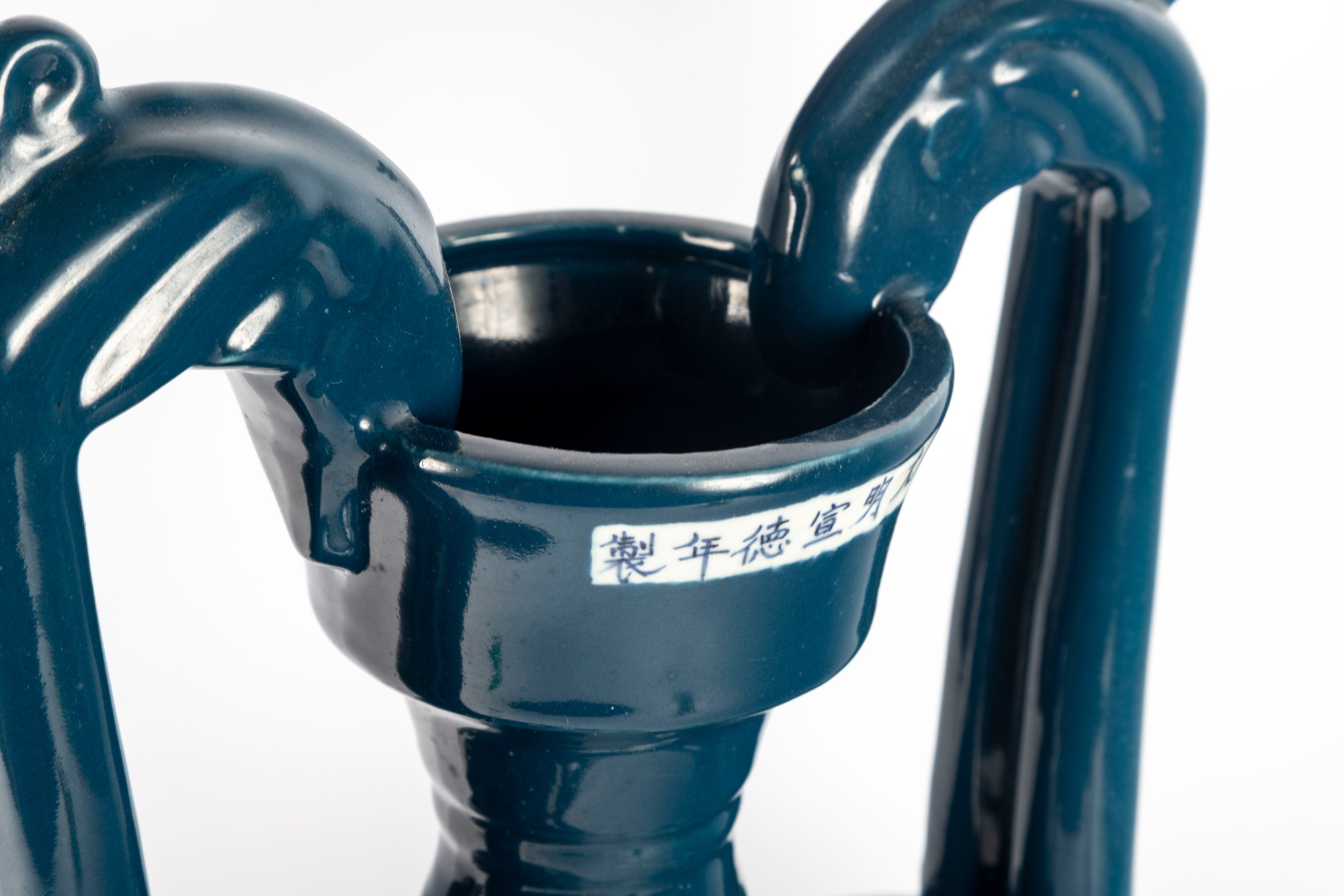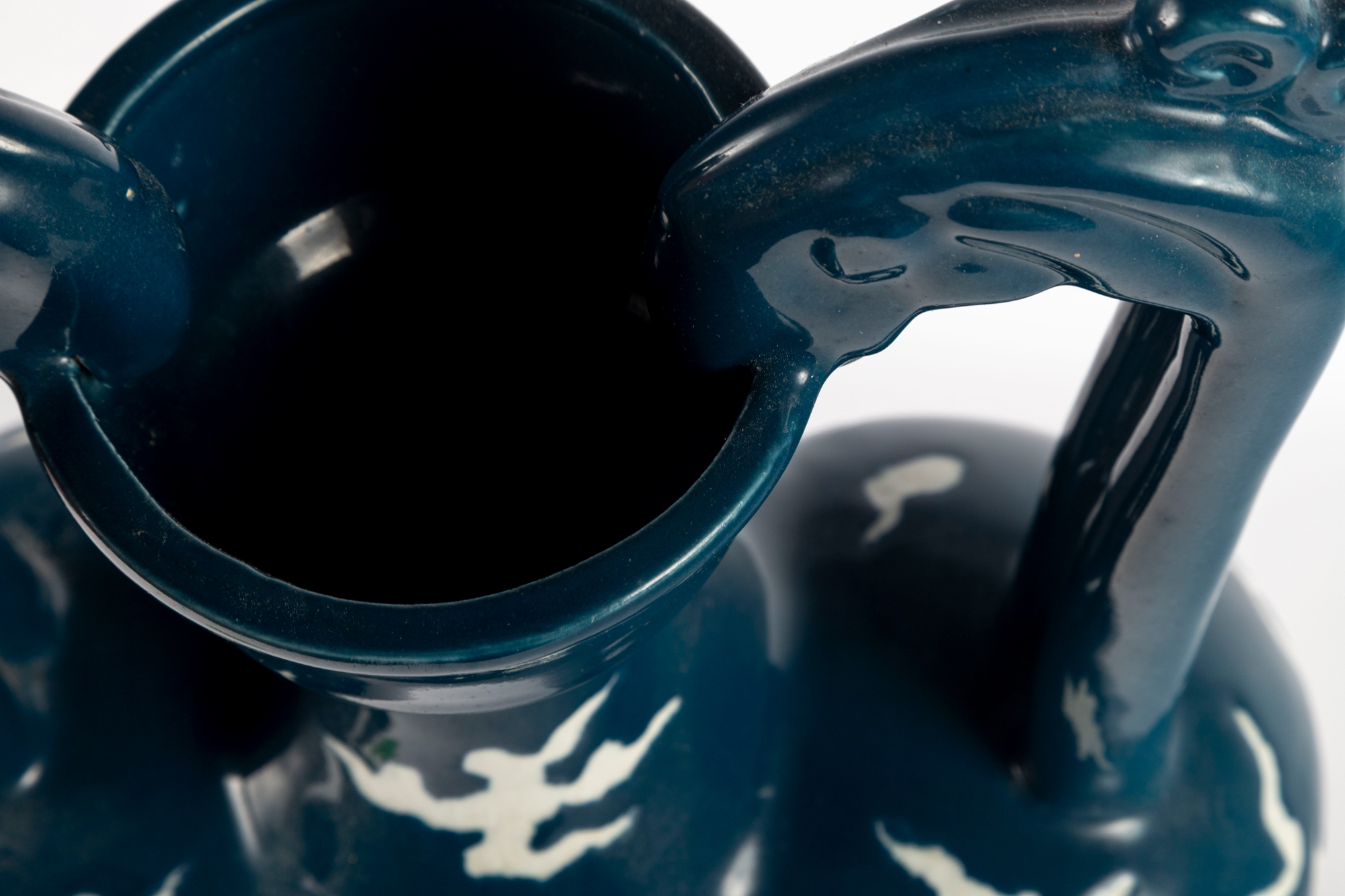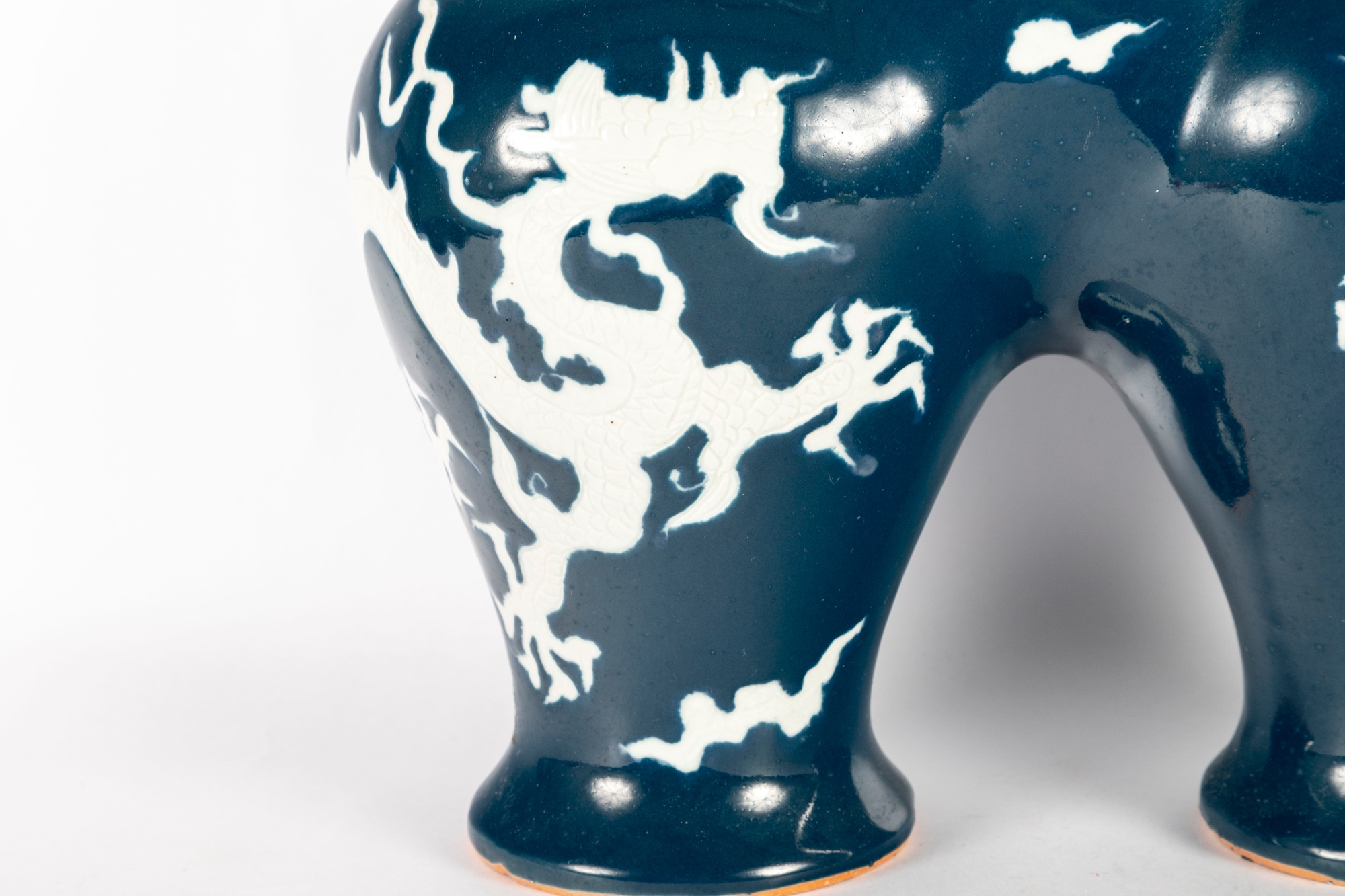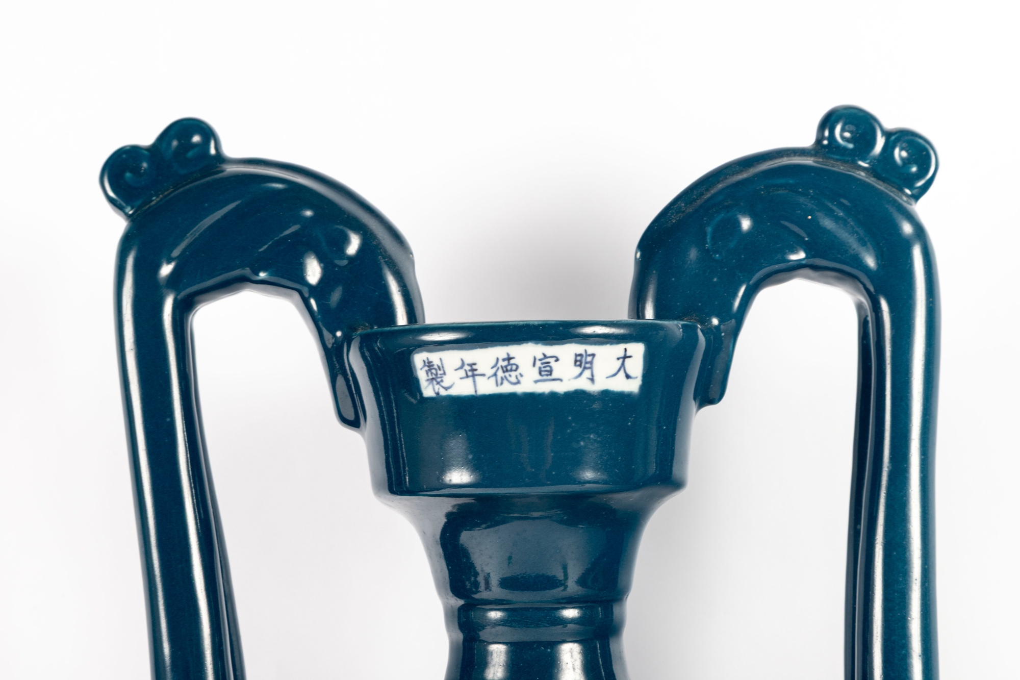 Striking Chinese porcelain double moon flask vase featuring a deep sacrificial blue glaze with contrasting white dragon and cloud motifs in relief. The vessel’s rare double-body form, joined at the neck with two elegantly arched handles, is a distinctive design often associated with Qing Dynasty ceremonial or imperial-inspired wares.
