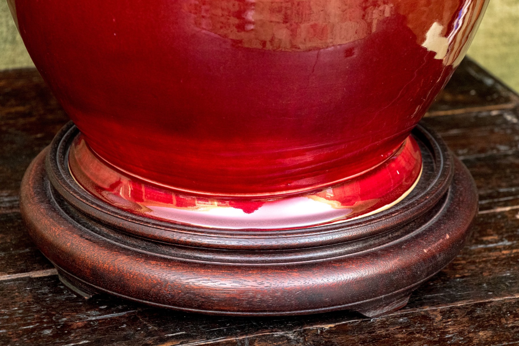 A gorgeous Chinese porcelain vase mounted as a table lamp, glazed in classic vibrant red sang de boeuf. The vase features a subtly flared rim tapering through a concave curved neck flanked by bamboo motif twin handles. The lower body rounds to a flared circular foot over a brown wood footed base, surmounted with a white shade.