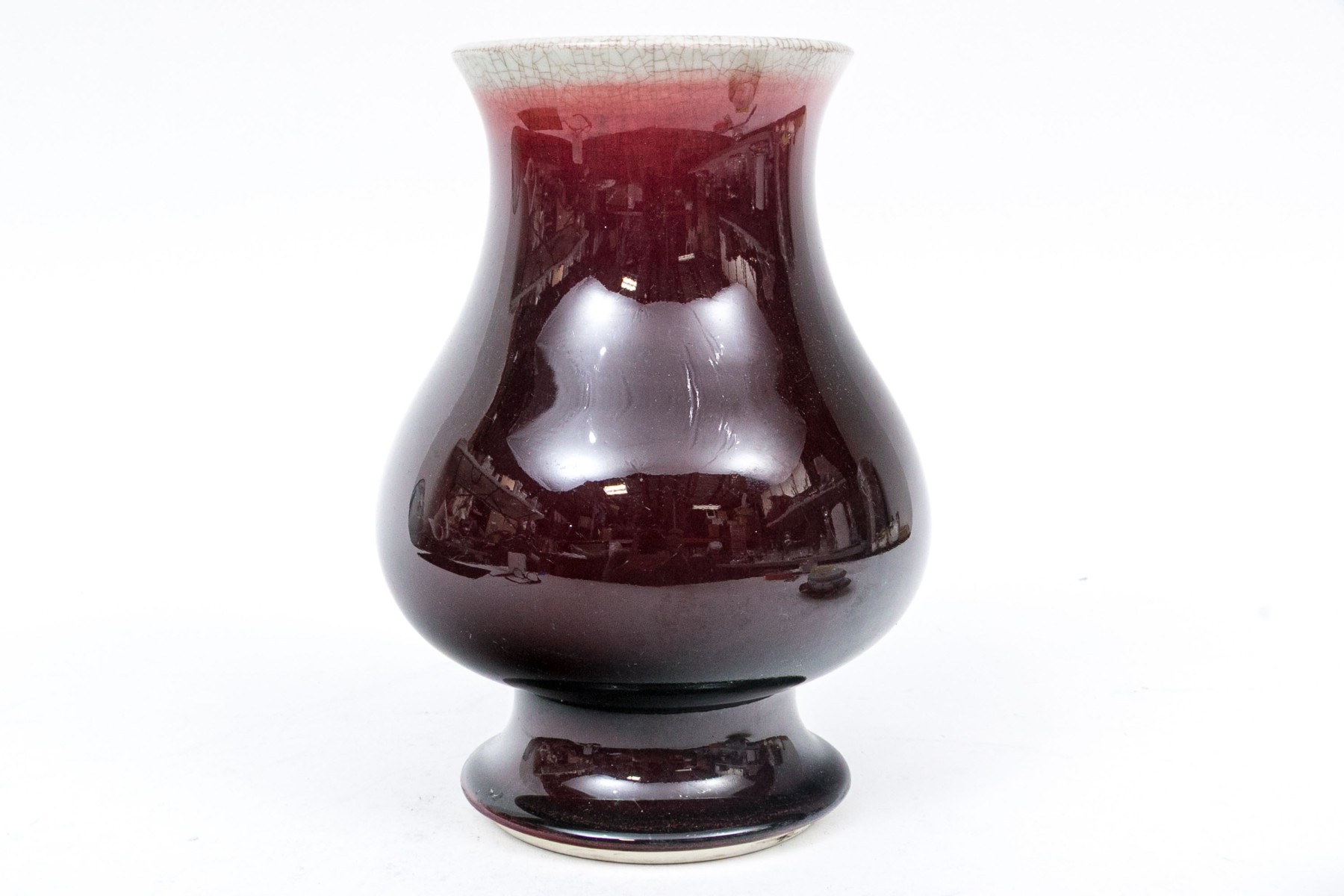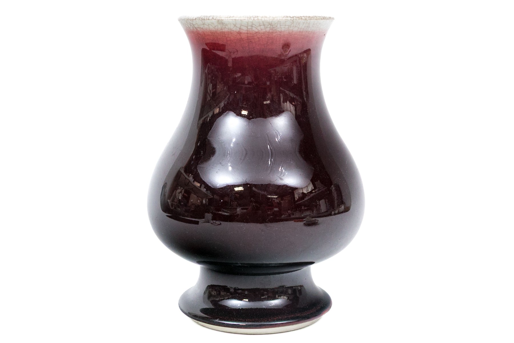 The thickly potted vase has an intriguing take on the classic baluster form, by inverting it and potting it in an upside down manner. The vase has crackle glazed mouth rim with rich sang de bouef glaze, slightly darker toward the base of the vase.