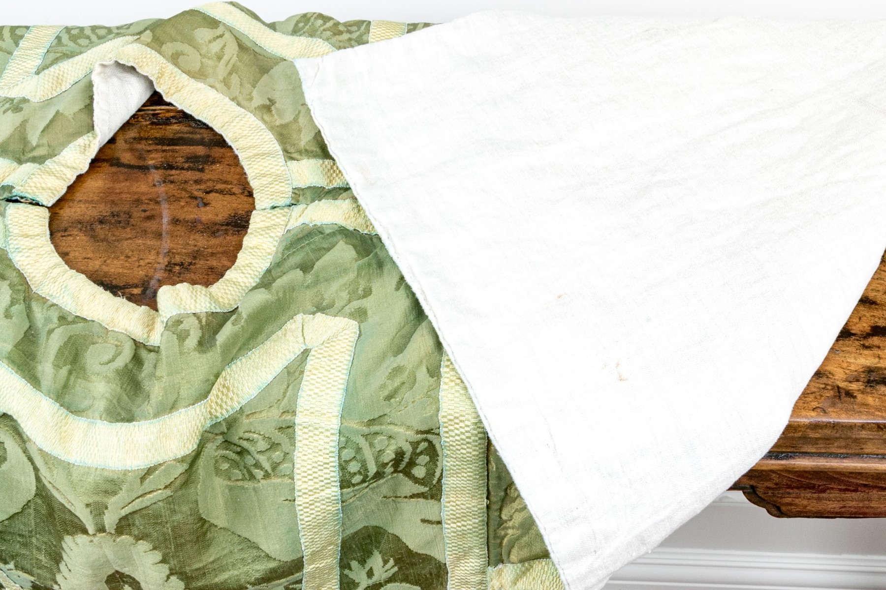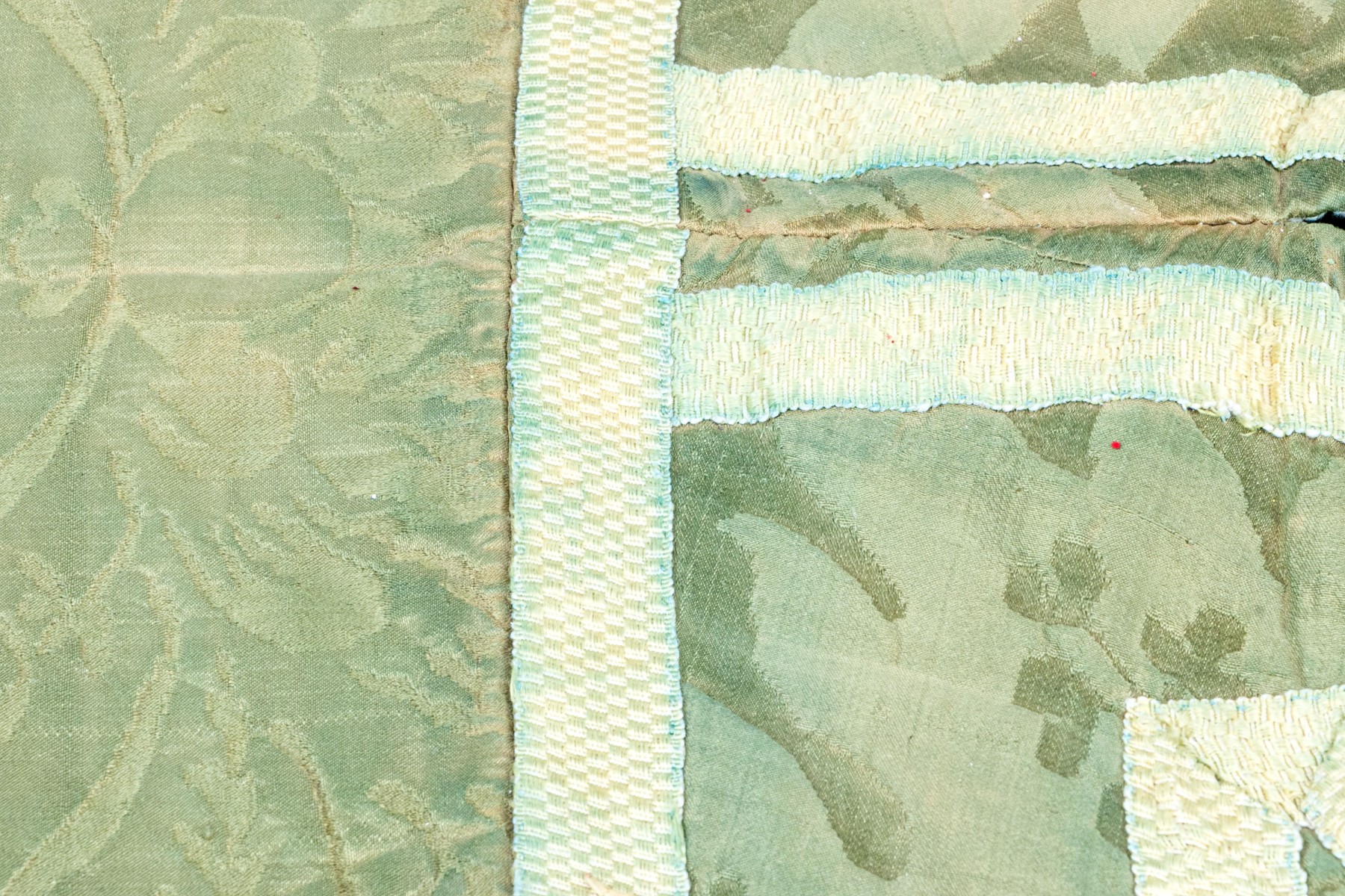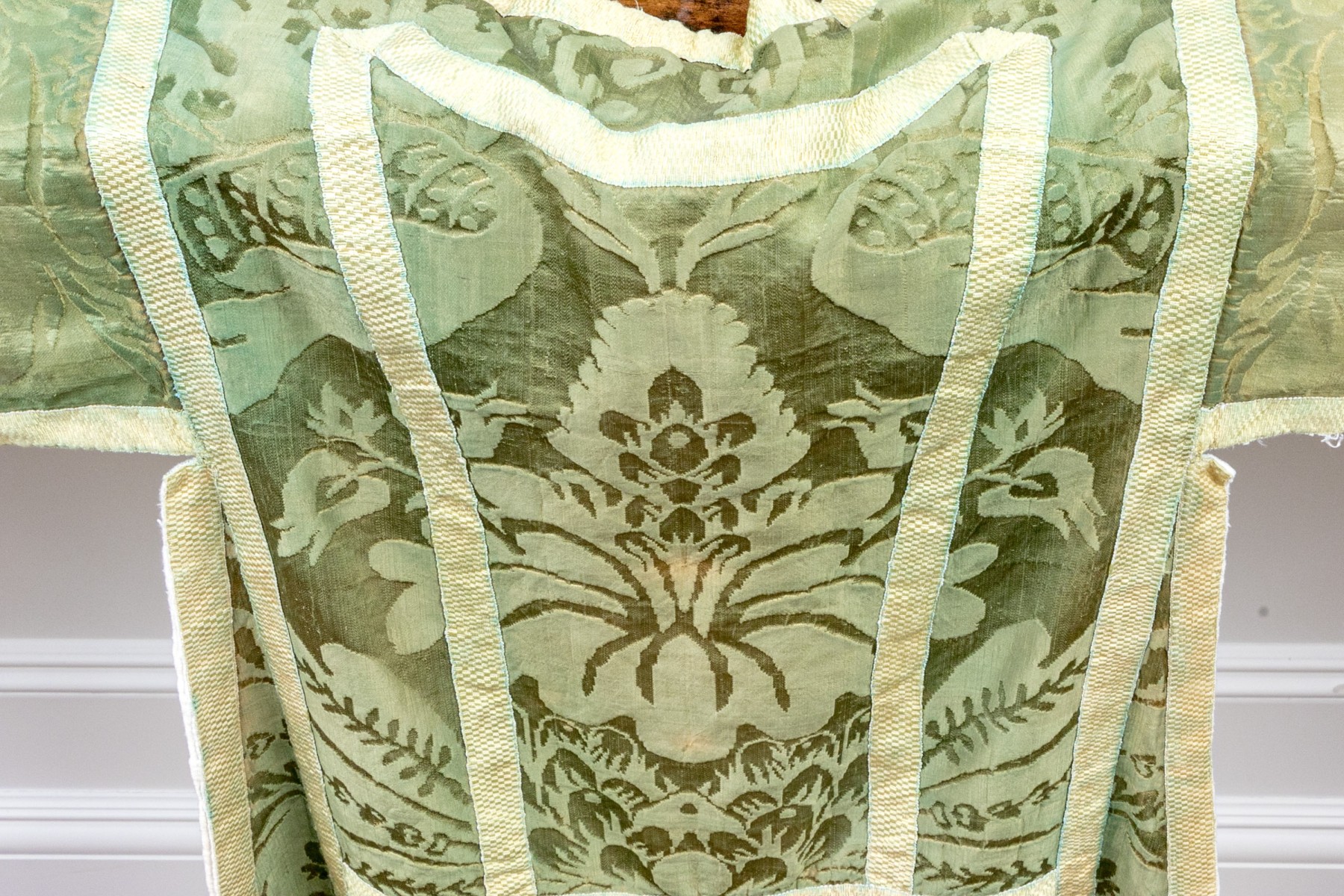 With green ground and cream-white bands, the ornately sewn silk robe presents exceptionally well.
