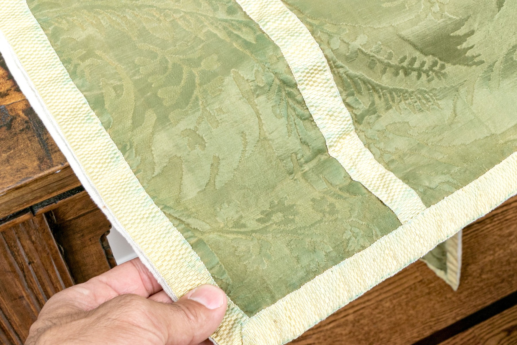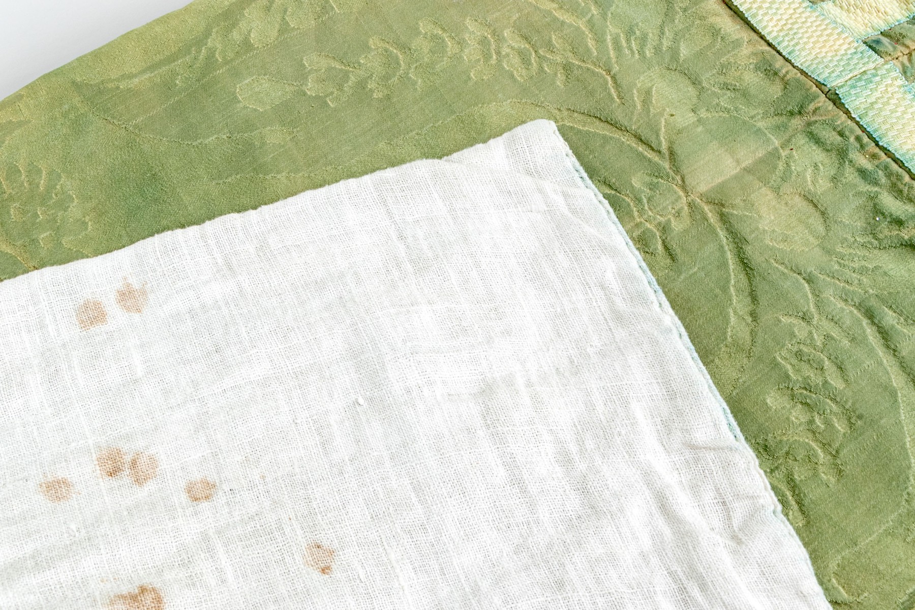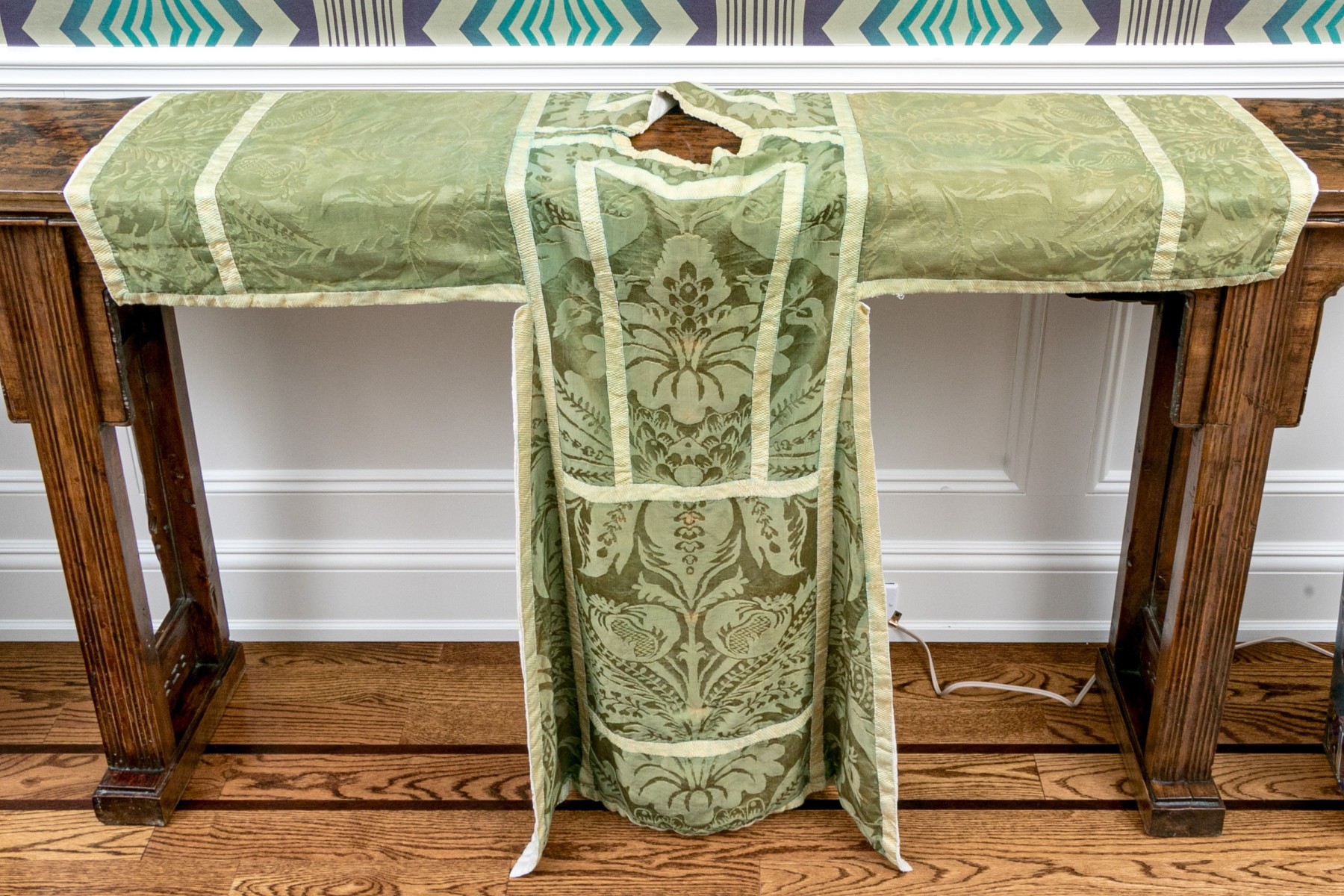 With green ground and cream-white bands, the ornately sewn silk robe presents exceptionally well.