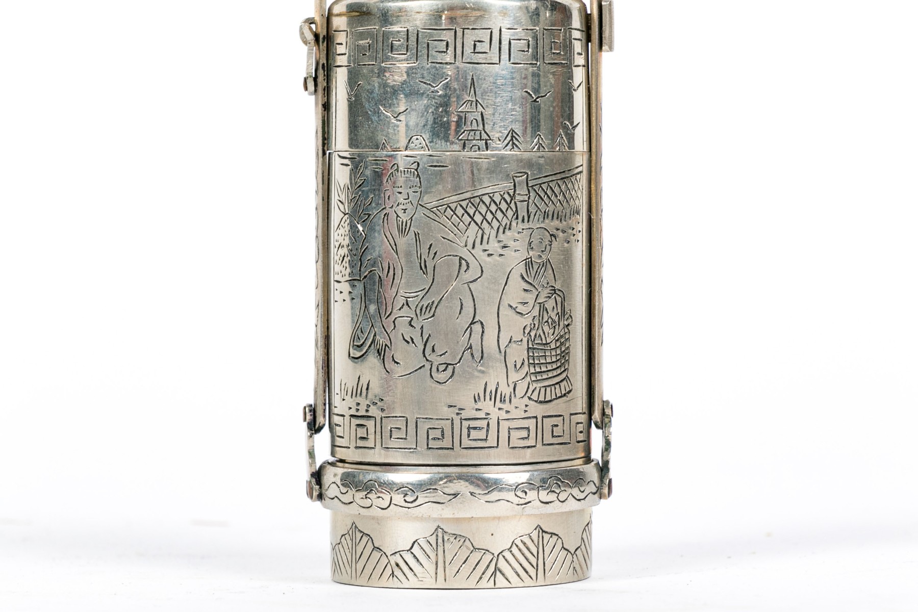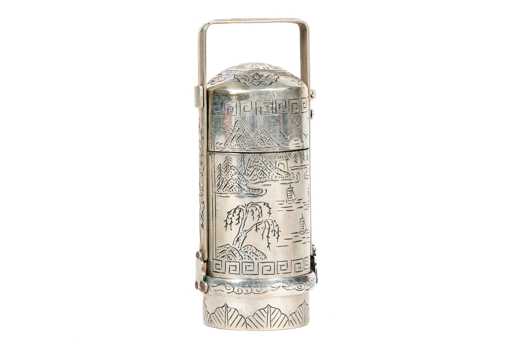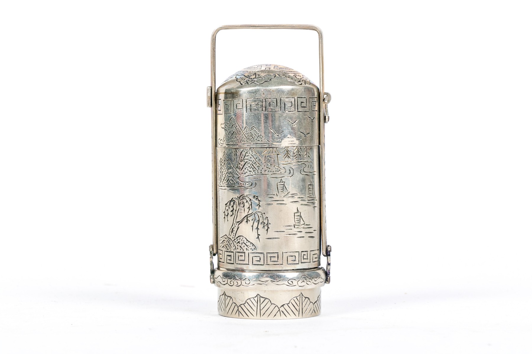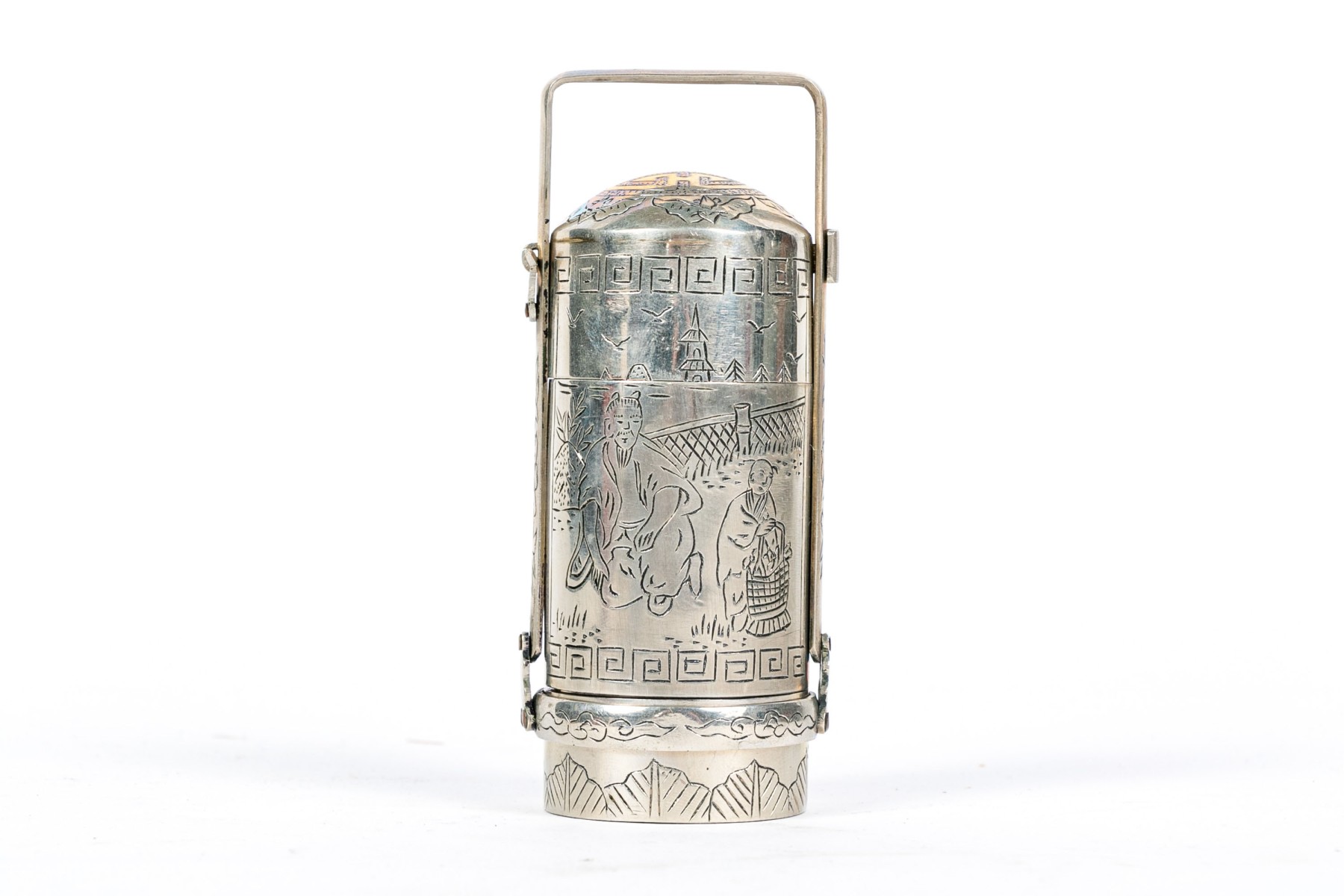 The three part box in the form of a miniature lunch box. Decorated with chased mountain river landscape and figures. The long handle with a clasp closure at the top and a copper center to the piece. The base with a heating element with a wick.