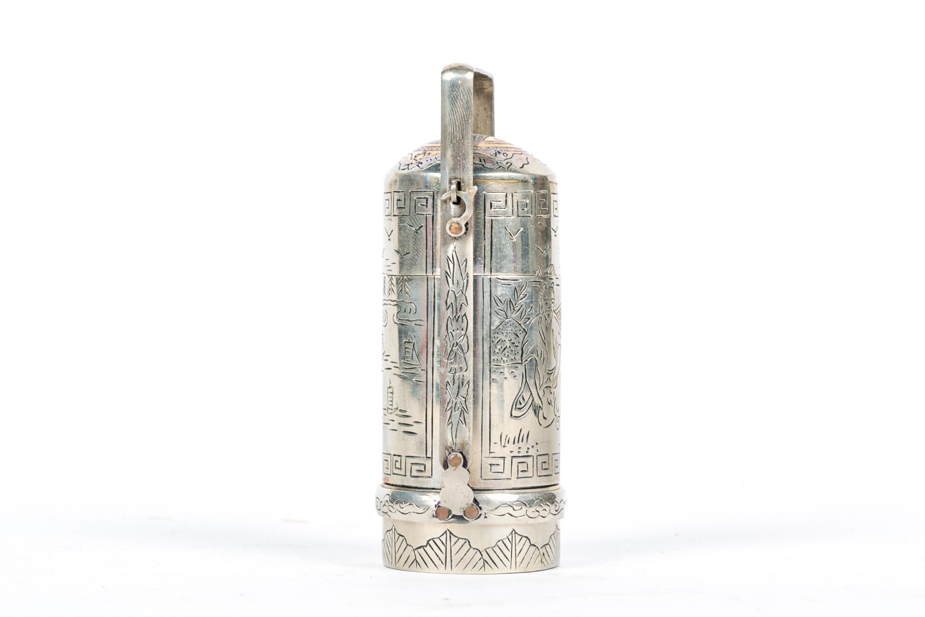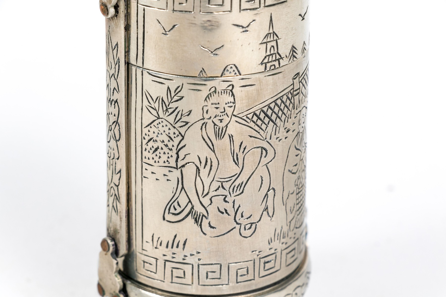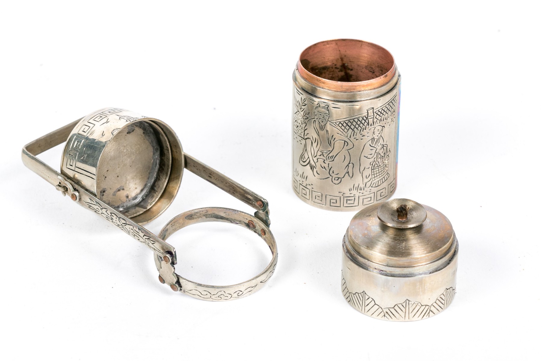 The three part box in the form of a miniature lunch box. Decorated with chased mountain river landscape and figures. The long handle with a clasp closure at the top and a copper center to the piece. The base with a heating element with a wick.