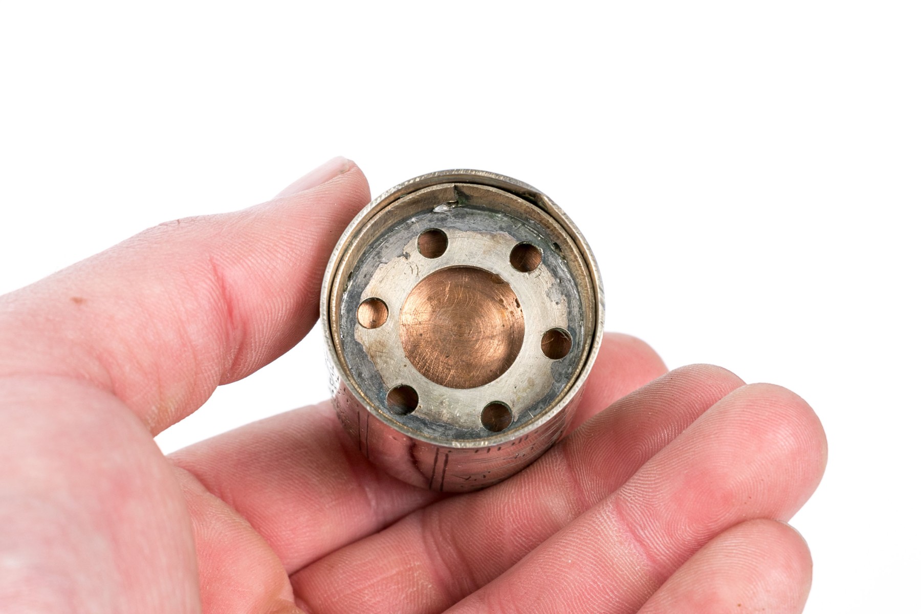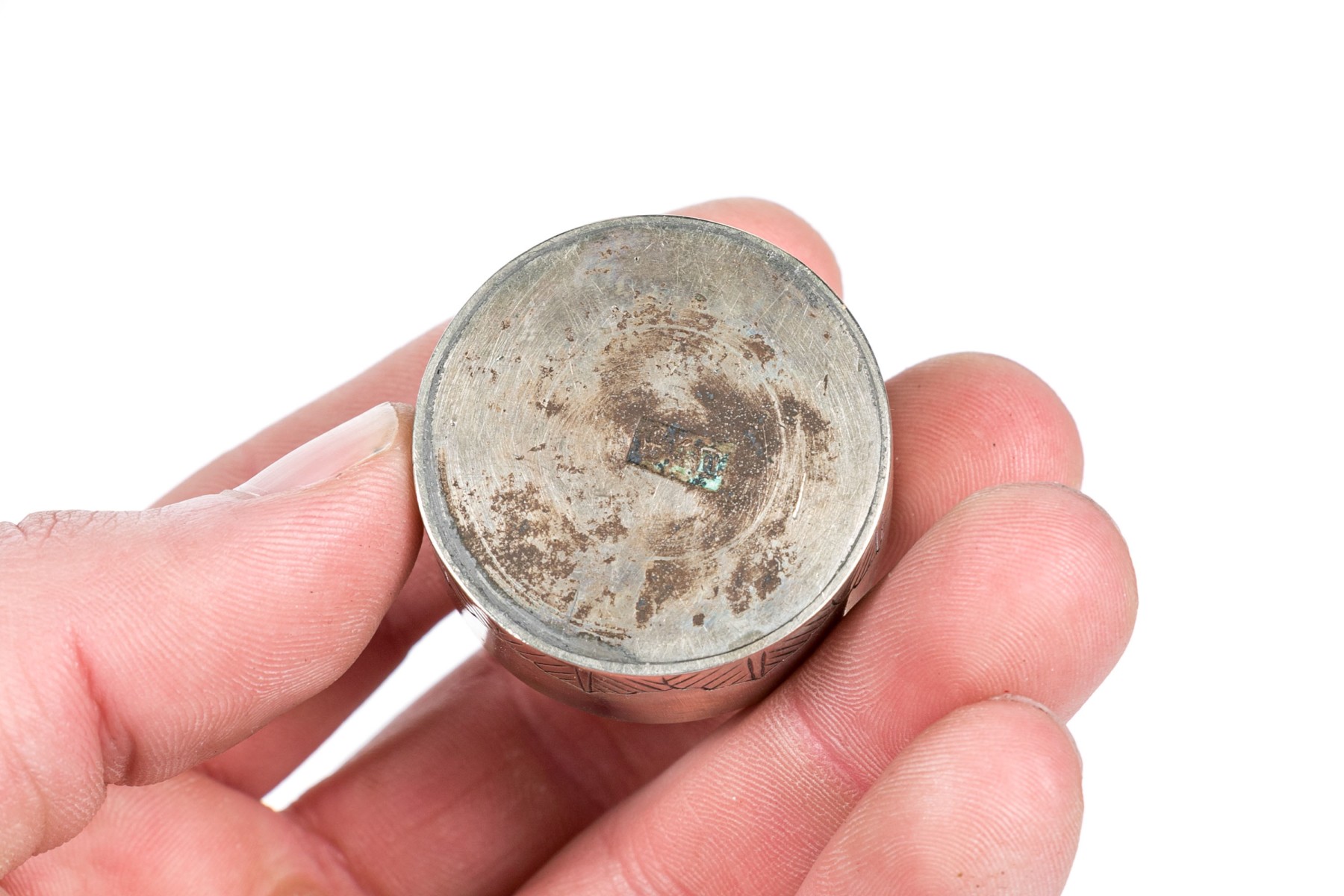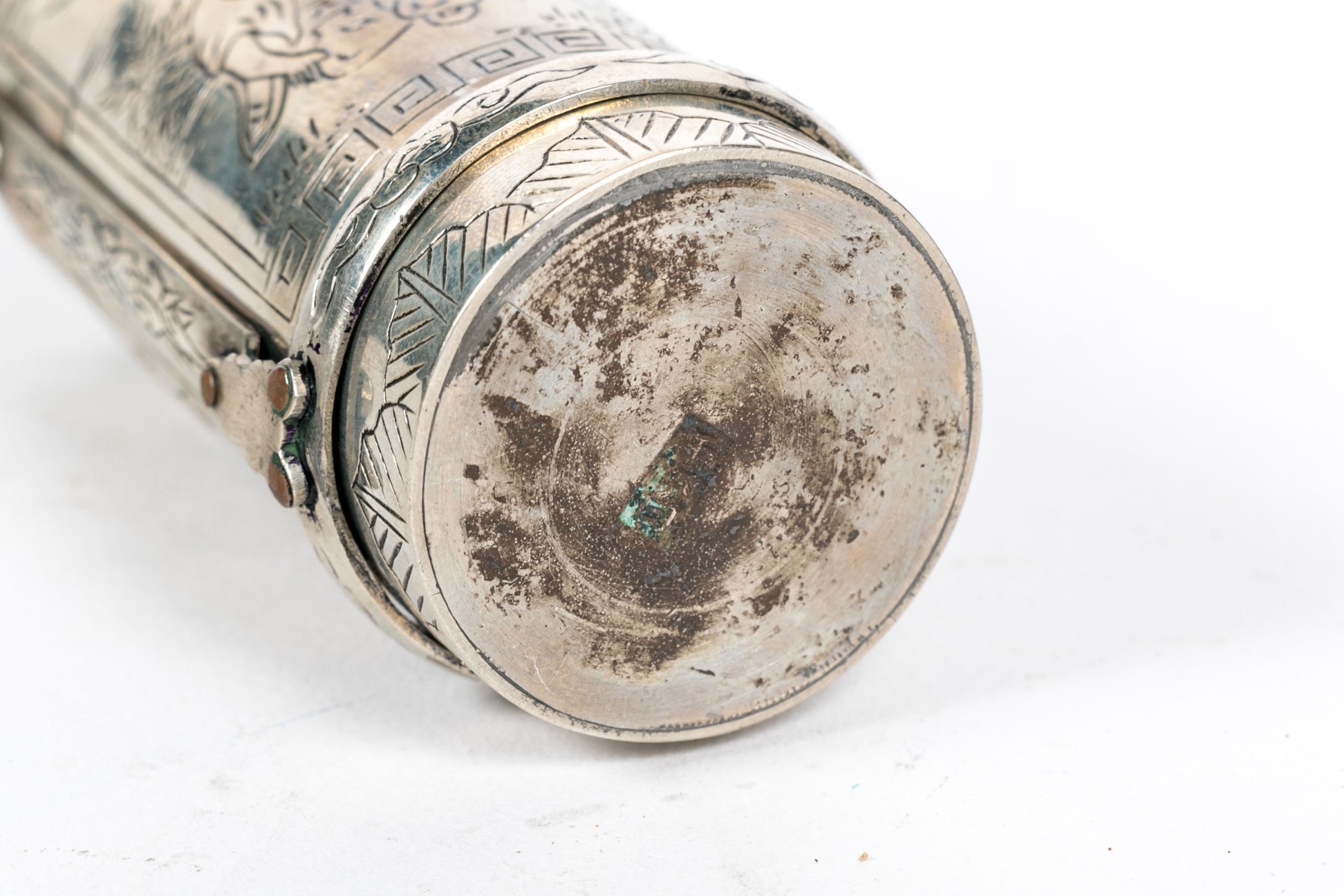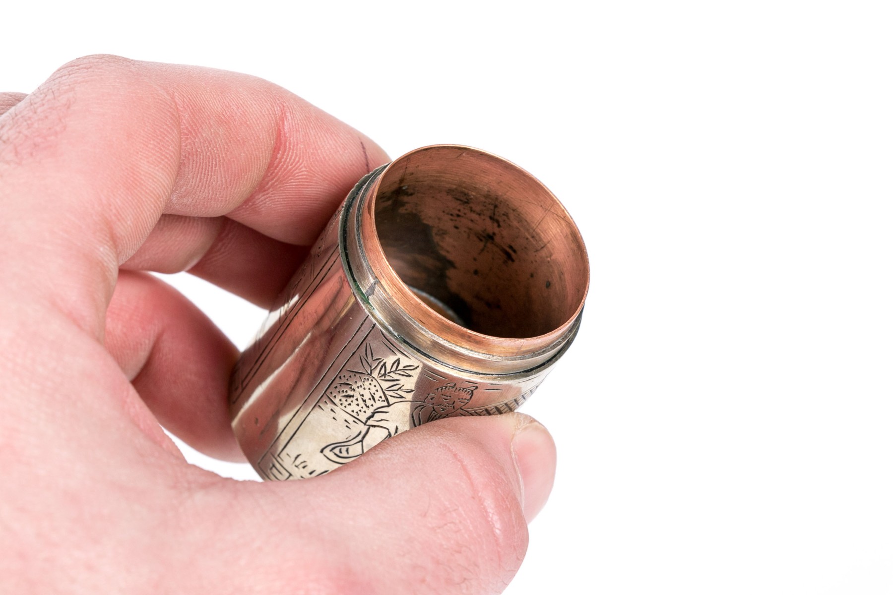 The three part box in the form of a miniature lunch box. Decorated with chased mountain river landscape and figures. The long handle with a clasp closure at the top and a copper center to the piece. The base with a heating element with a wick.
