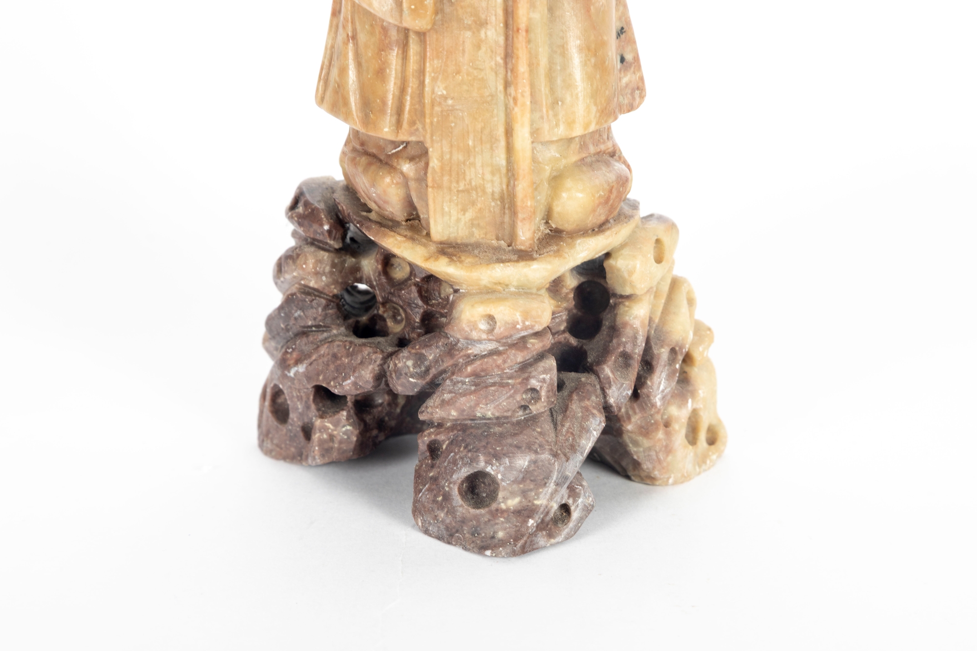 A finely hand-carved natural soapstone figurine of Shou Lao, the Chinese God of Longevity, holding a peach and staff, traditional symbols of immortality and good fortune.