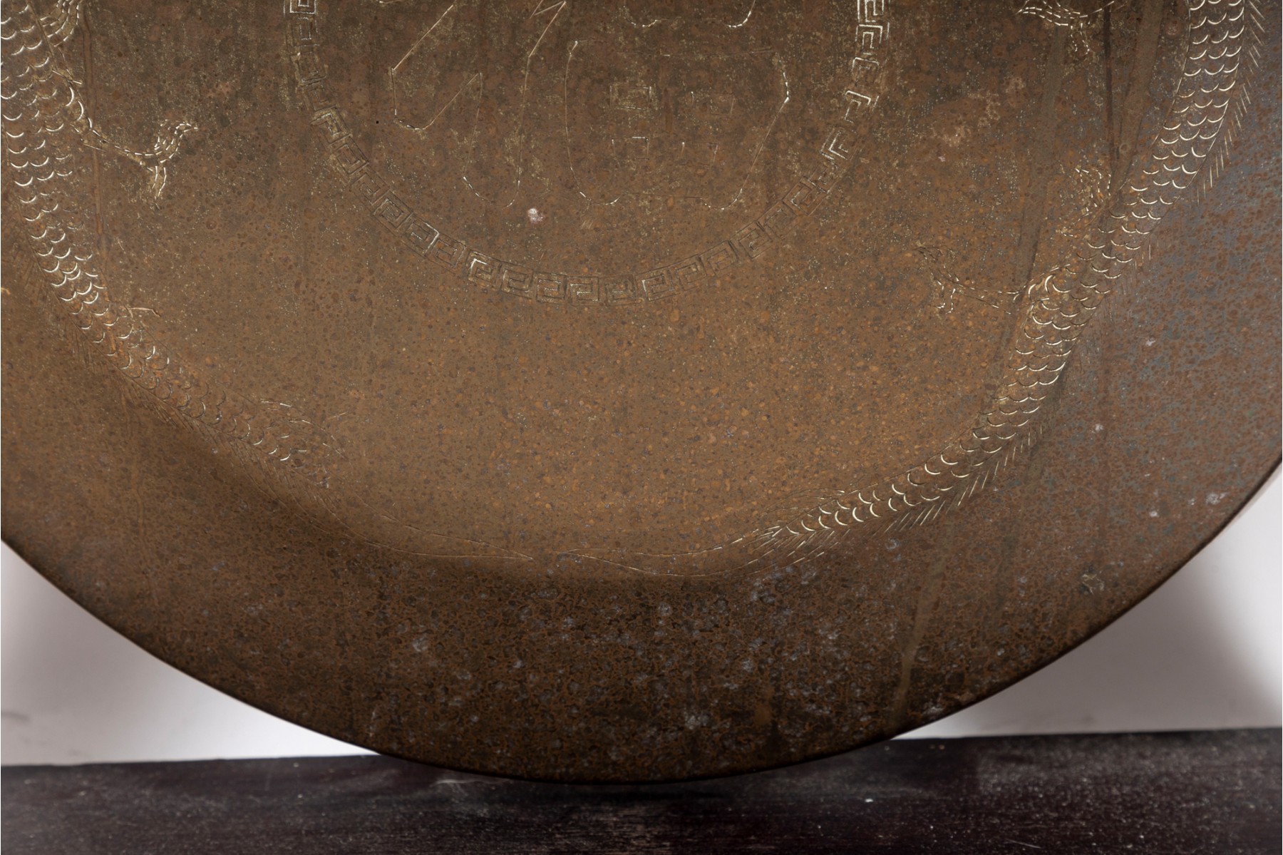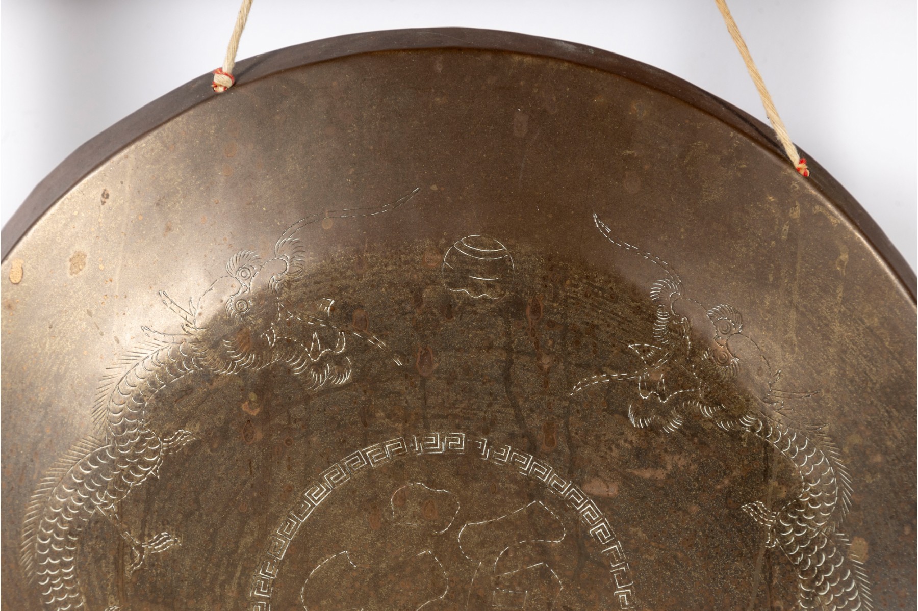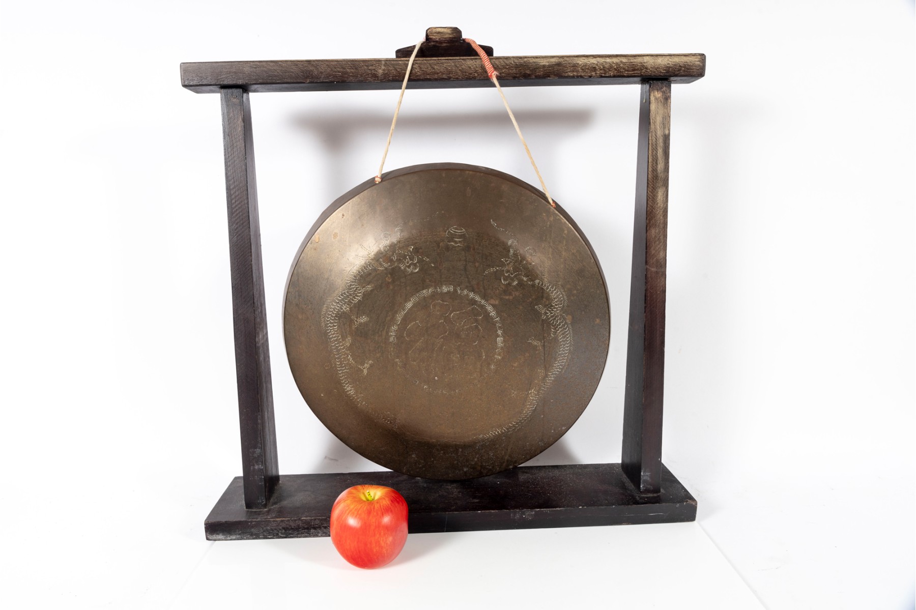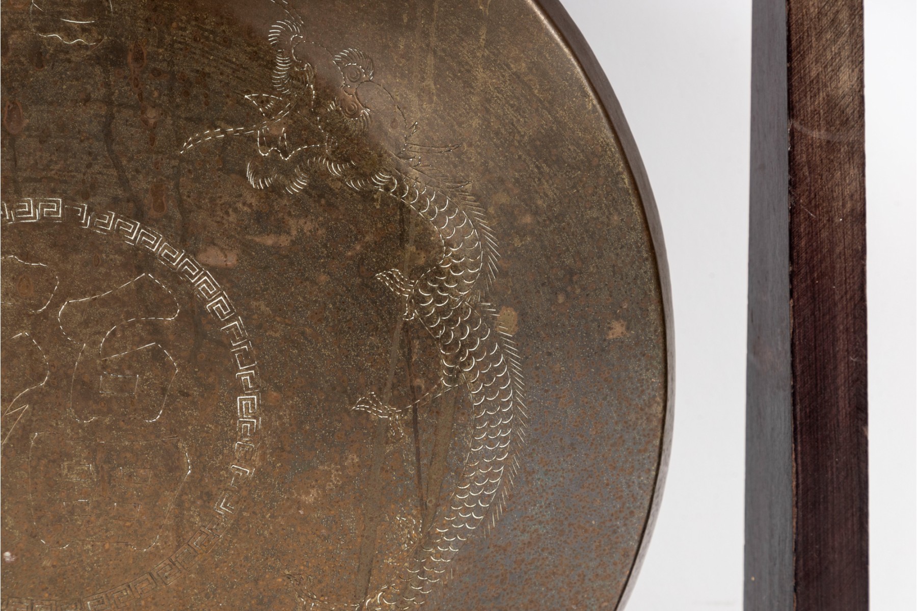 This striking Chinese suspended bronze tabletop gong features intricate engravings of Eastern dragons, a symbol of power, strength, and good fortune in Chinese culture. The bronze gong, with its warm, antique finish, is suspended elegantly within a sturdy wood frame.