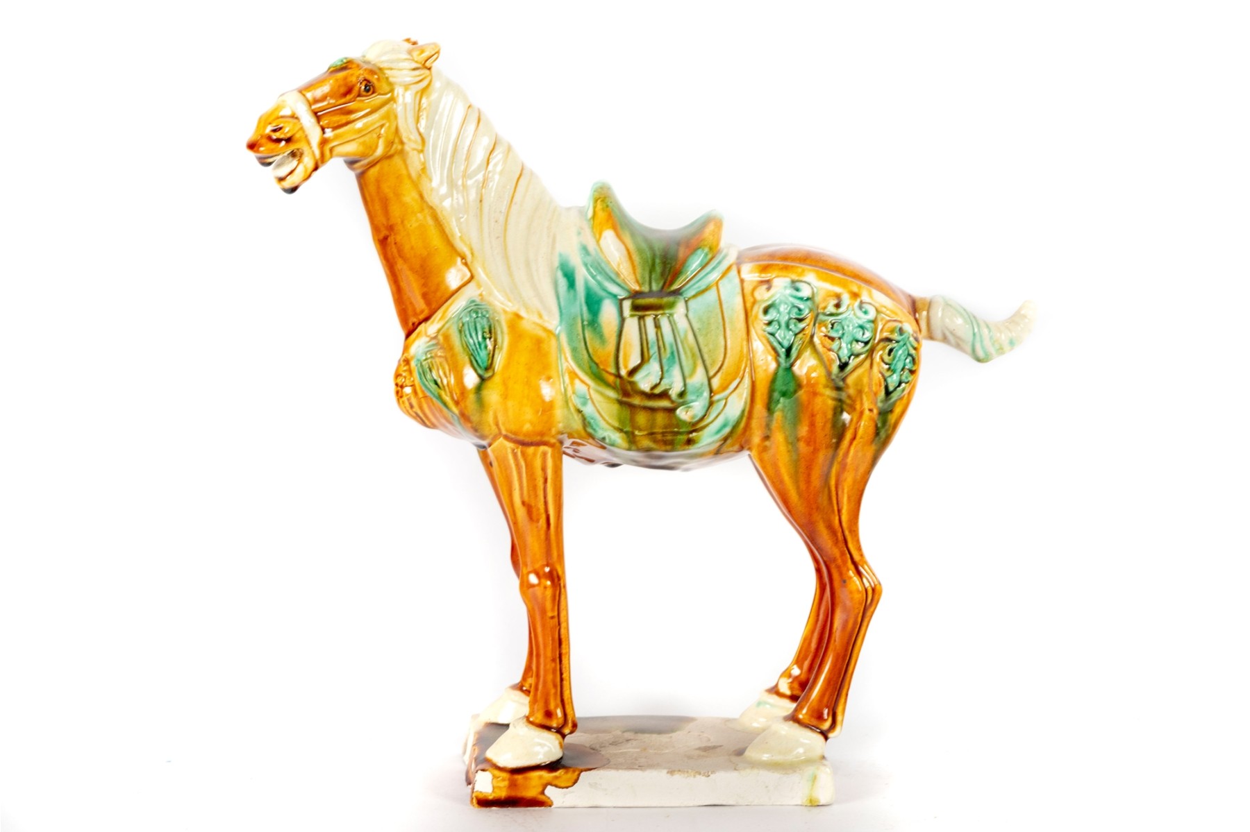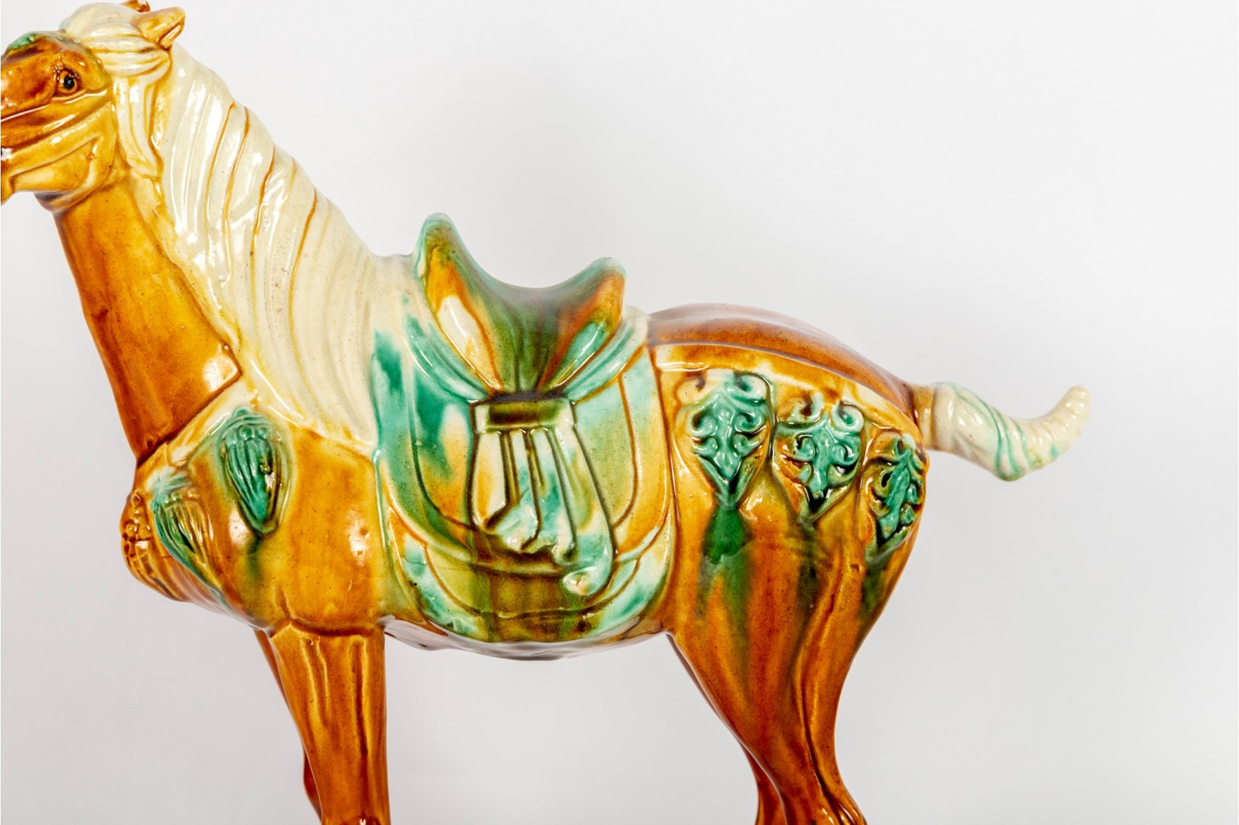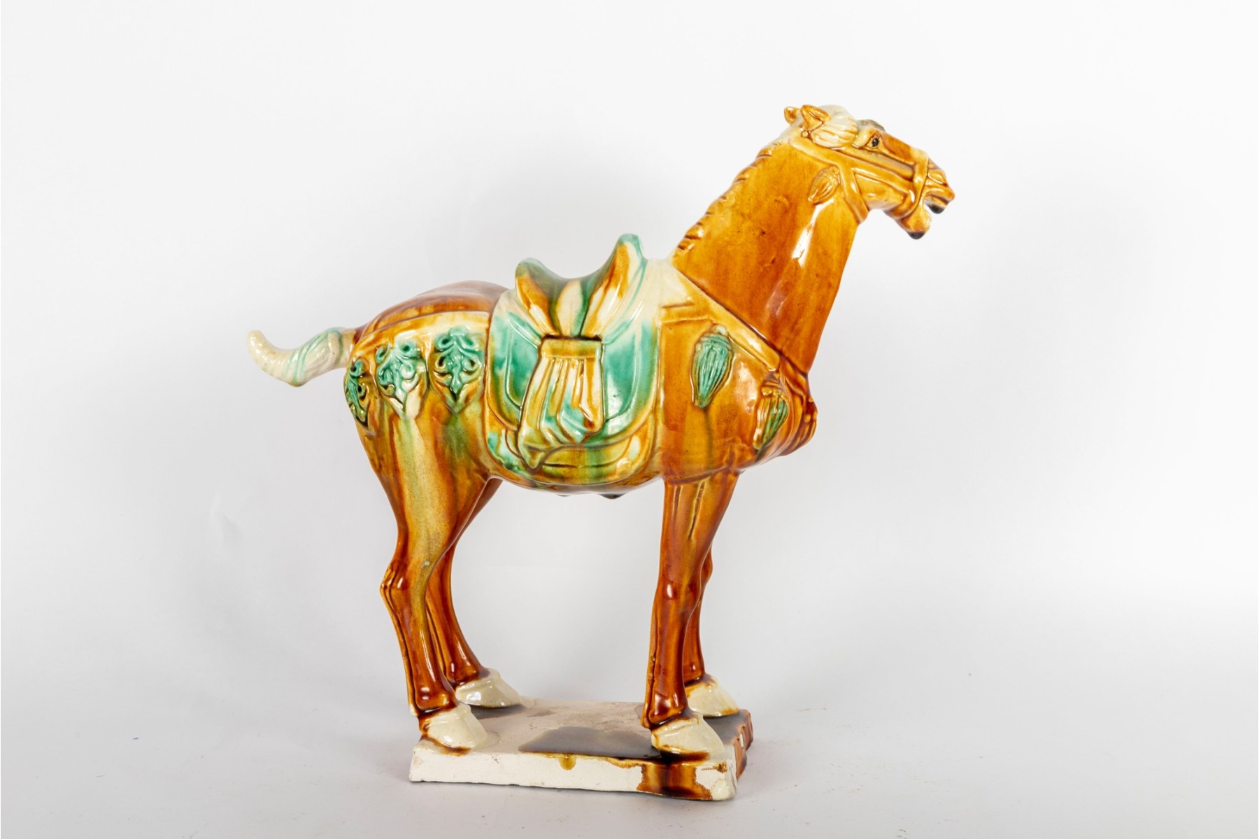 A Chinese Tang-style sancai-glazed pottery horse. These horses are modeled after originals from the Tang Dynasty (618–907 AD), which were often placed in tombs as funerary objects symbolizing wealth and status.