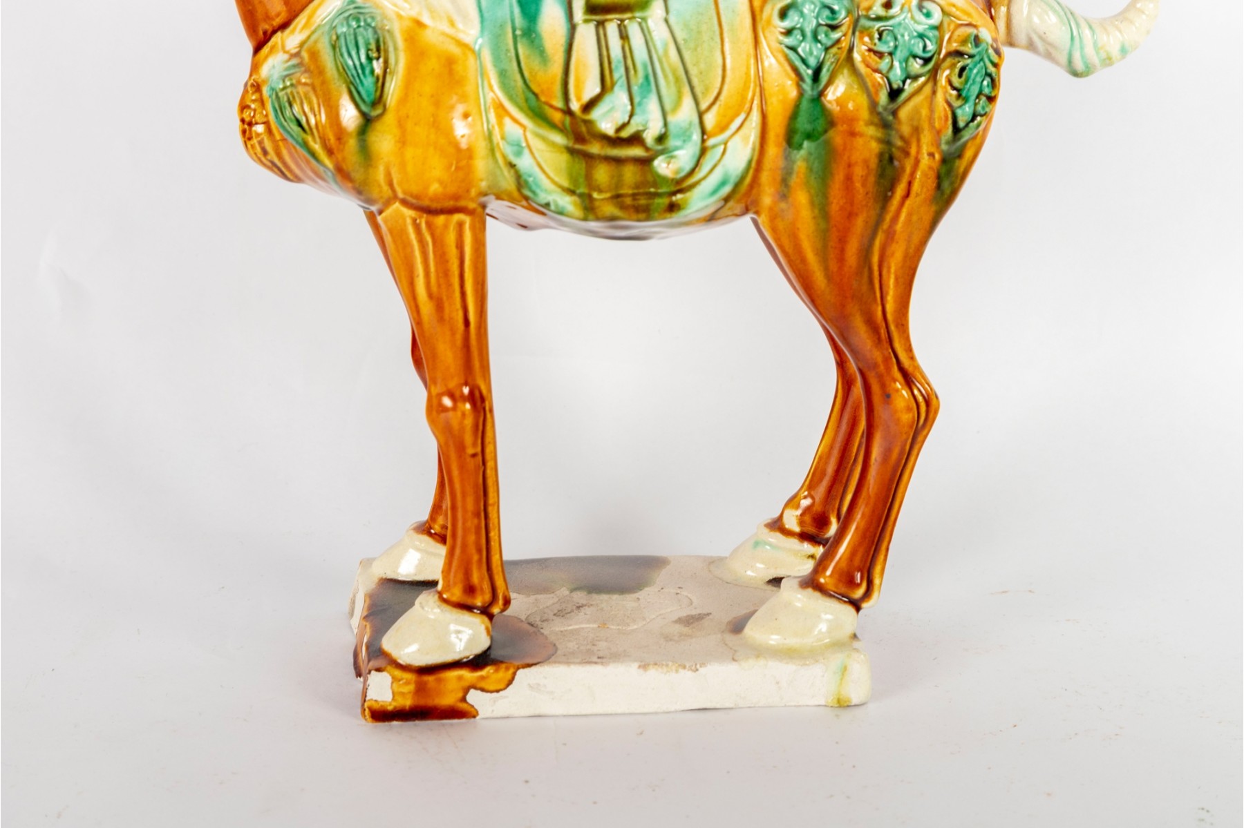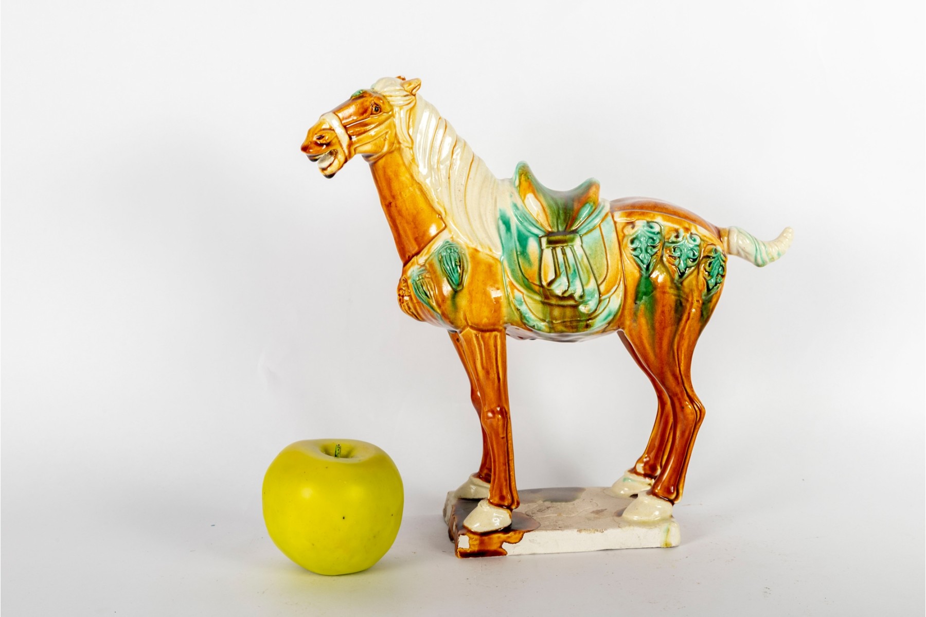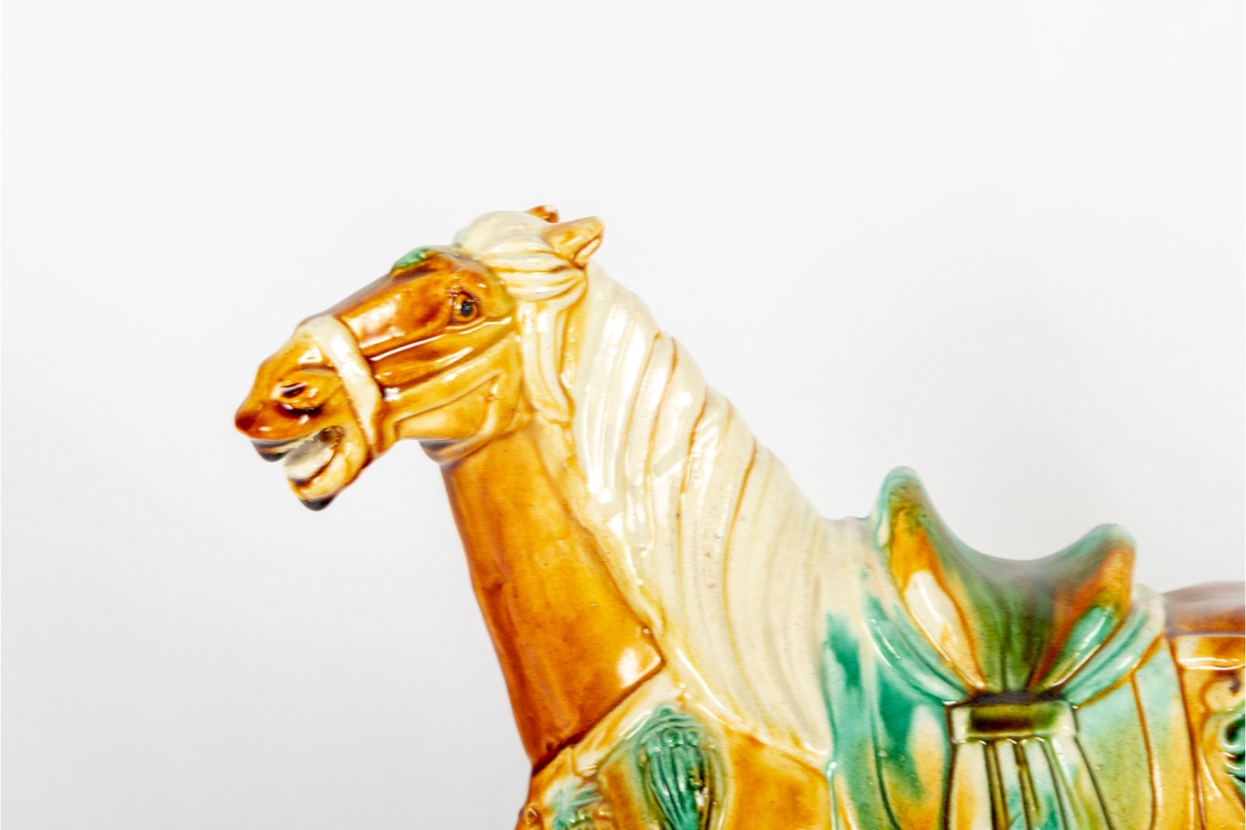A Chinese Tang-style sancai-glazed pottery horse. These horses are modeled after originals from the Tang Dynasty (618–907 AD), which were often placed in tombs as funerary objects symbolizing wealth and status.