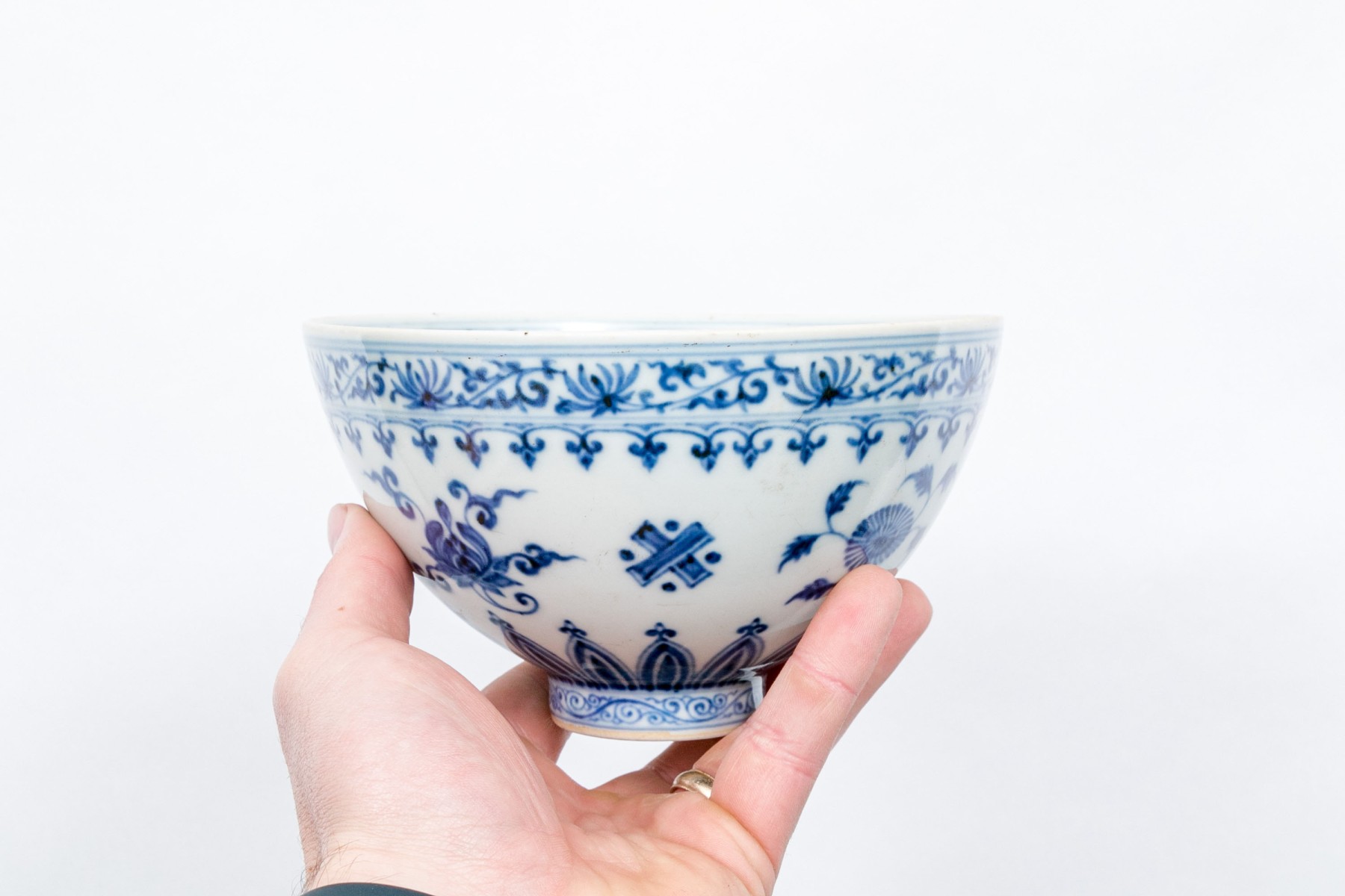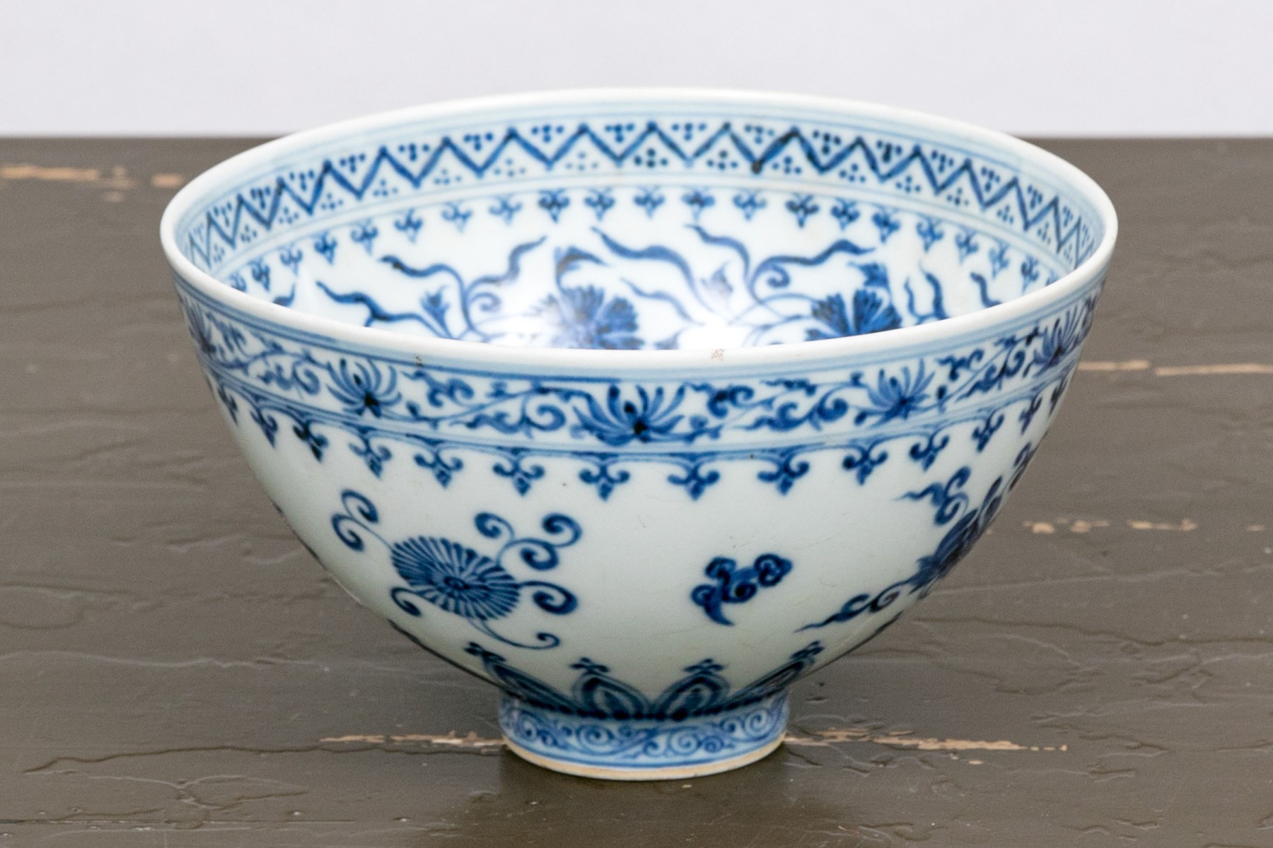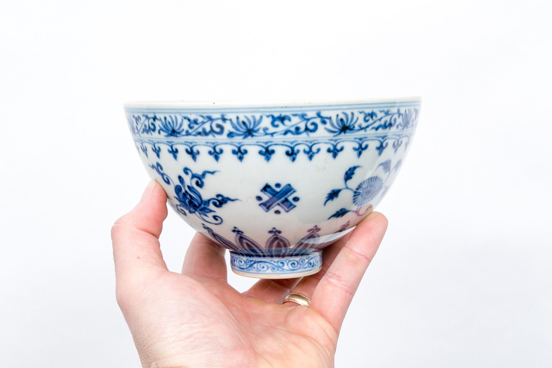 A Chinese underglaze blue and white porcelain footed bowl. The bowl wonderfully decorated with a variety of decorative schemes including flowers, and scrolling vines with a geometric band to the interior mouth rim.