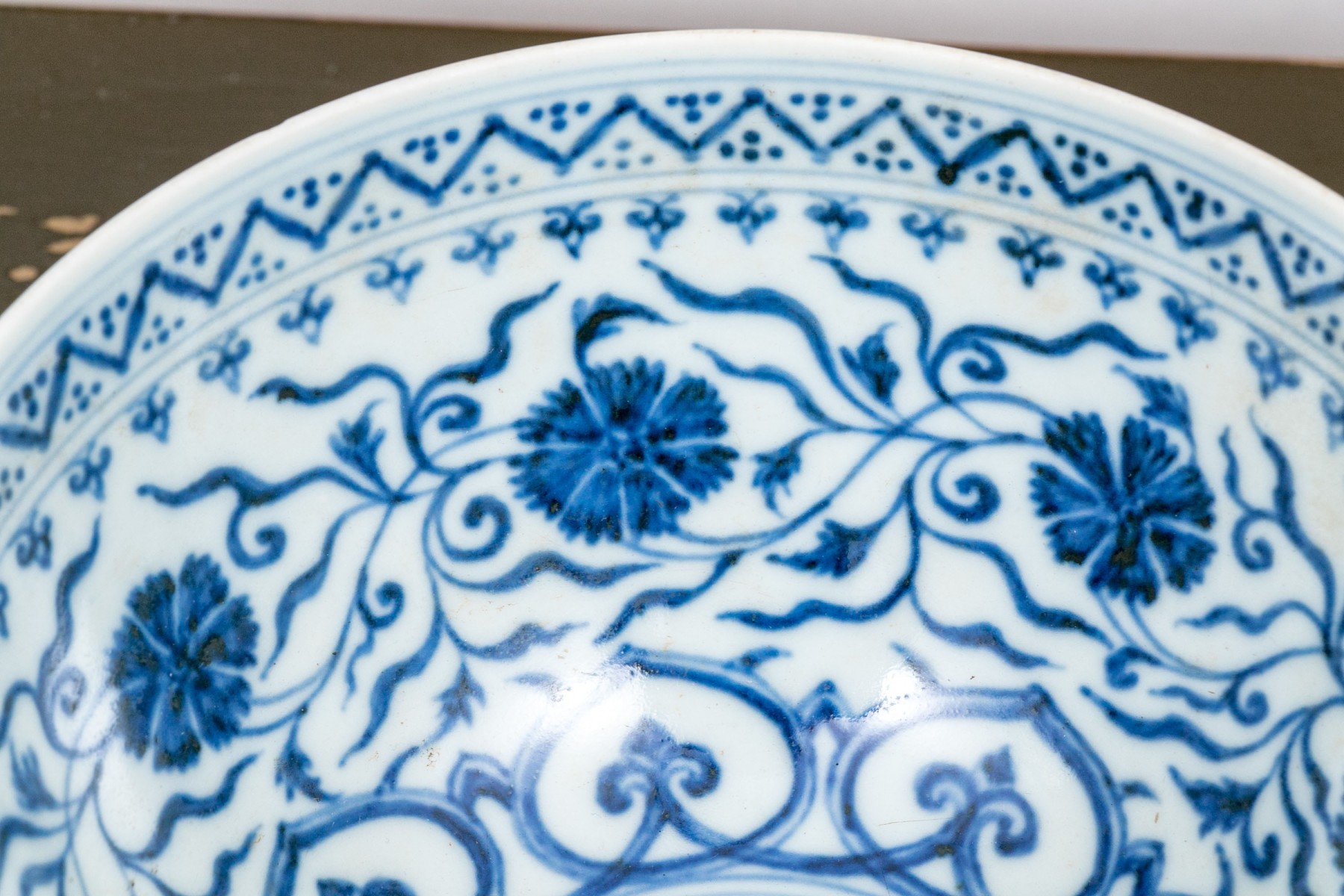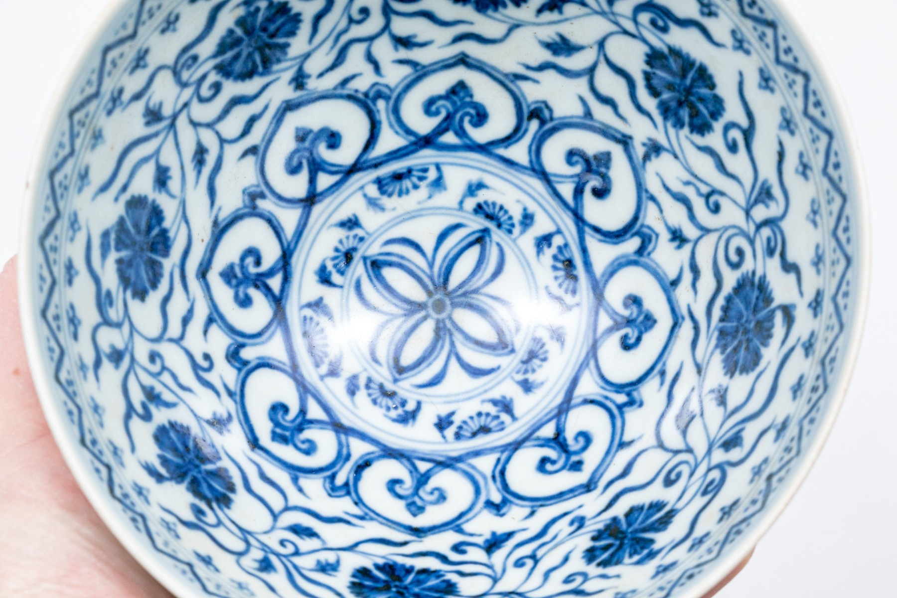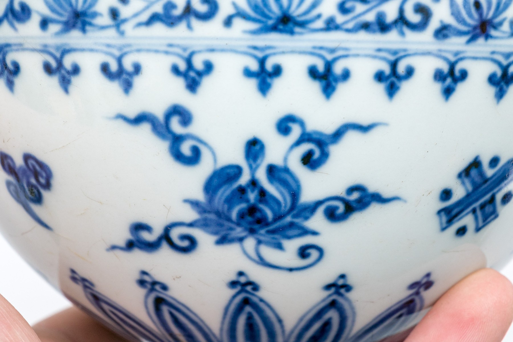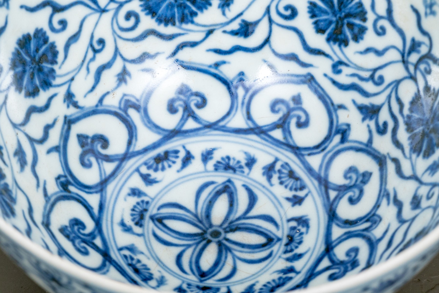 A Chinese underglaze blue and white porcelain footed bowl. The bowl wonderfully decorated with a variety of decorative schemes including flowers, and scrolling vines with a geometric band to the interior mouth rim.