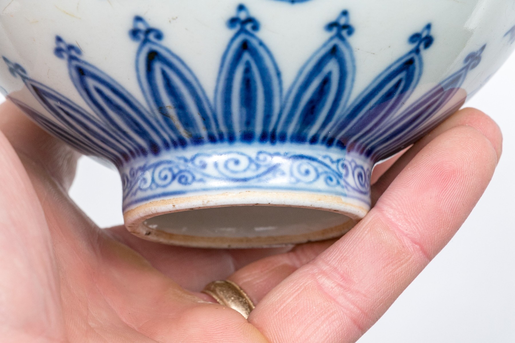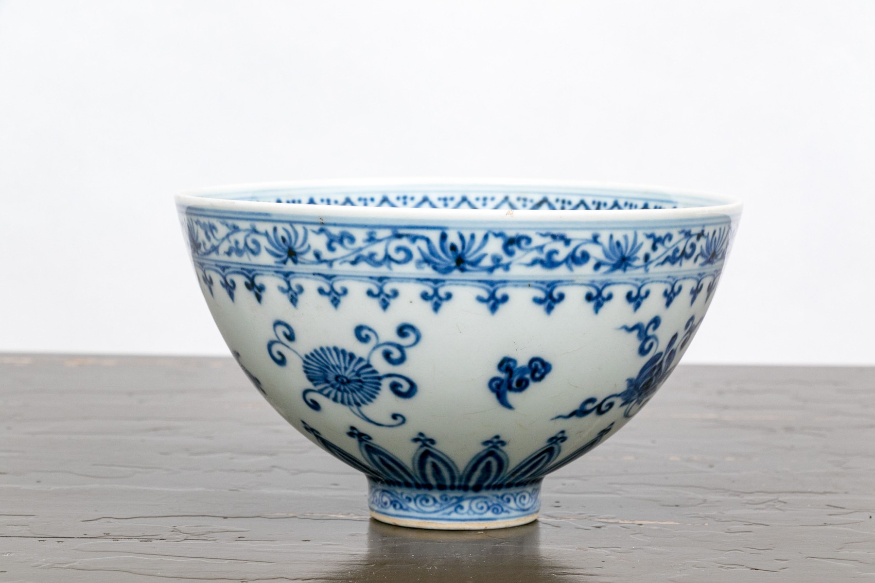 Condition: There are a few chips to the mouth rim and a smaller nic to the foot rim. The surface, both interior and exterior with slight scratches and crackle to the glaze. Underfoot are two small stickers, one of which is deteriorating with age. Despite wear the bowl presents handsomely. See lot images as they are also considered part of the condition report.