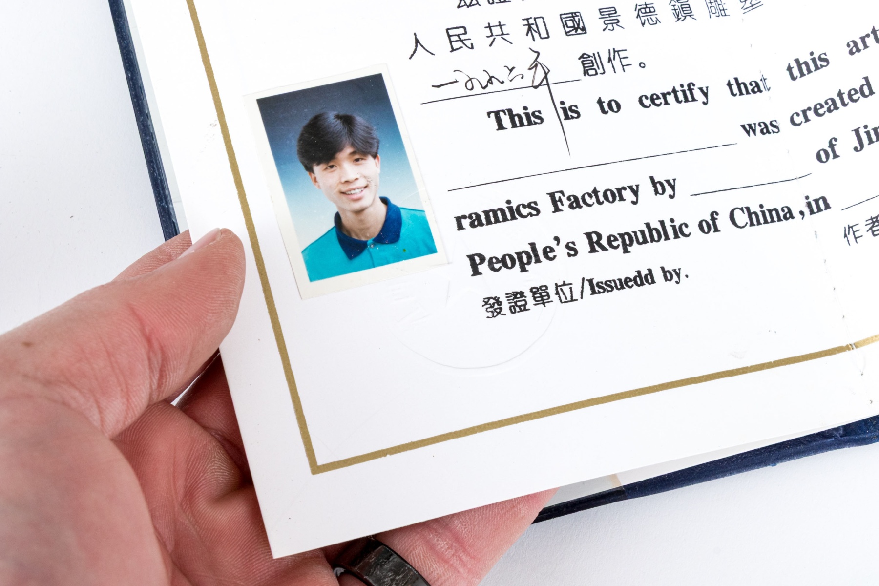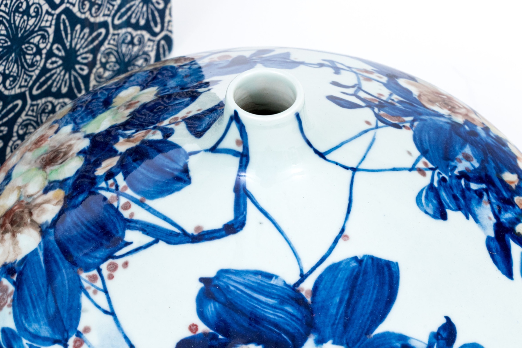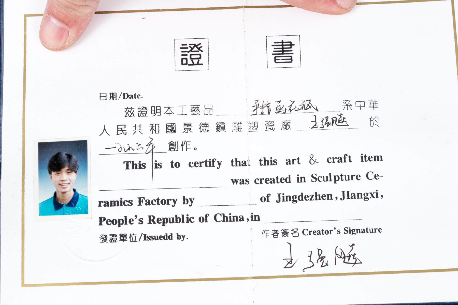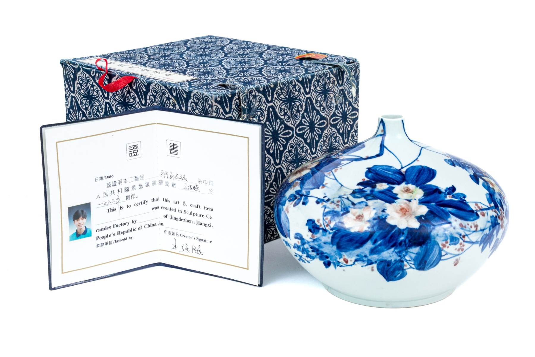The vase of ovoid form with thin bottle mouth. Comes with a Certificate certify the vase was made in Jingdezhen, Jiangxi People's Republic of China. It comes with a cloth lidded box.