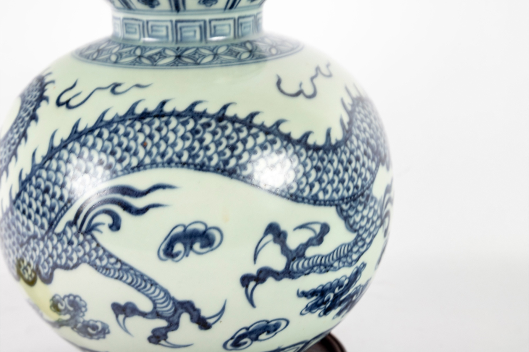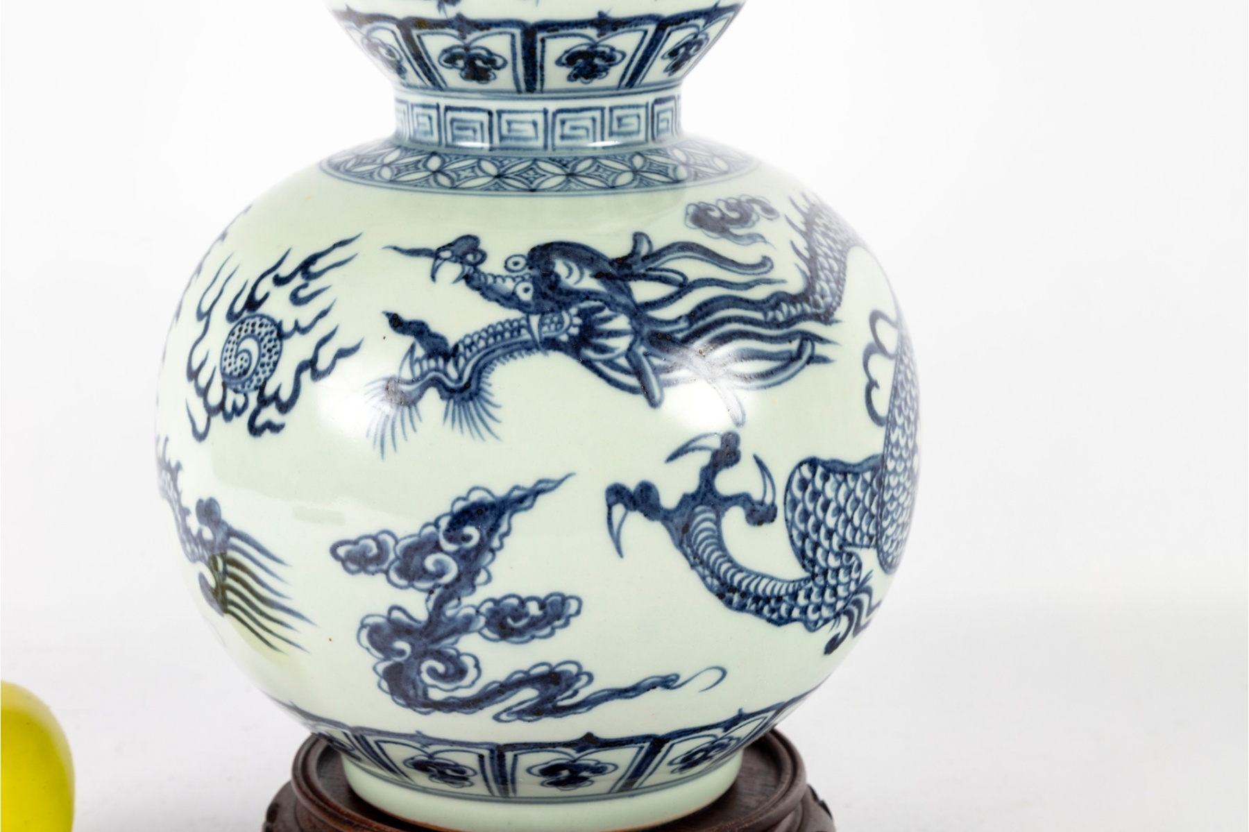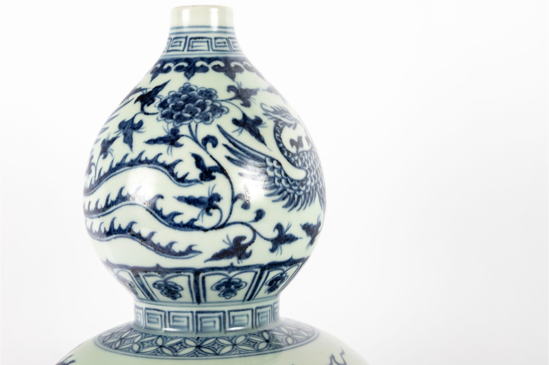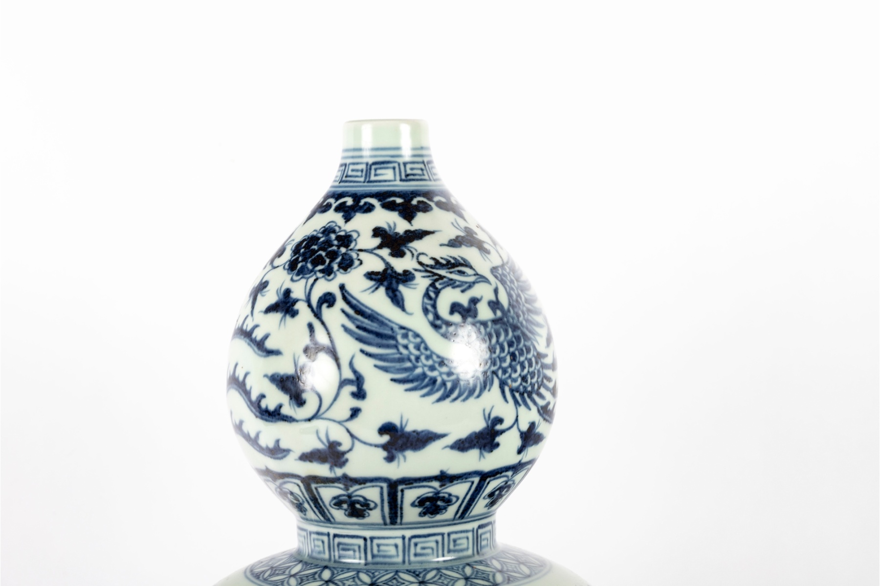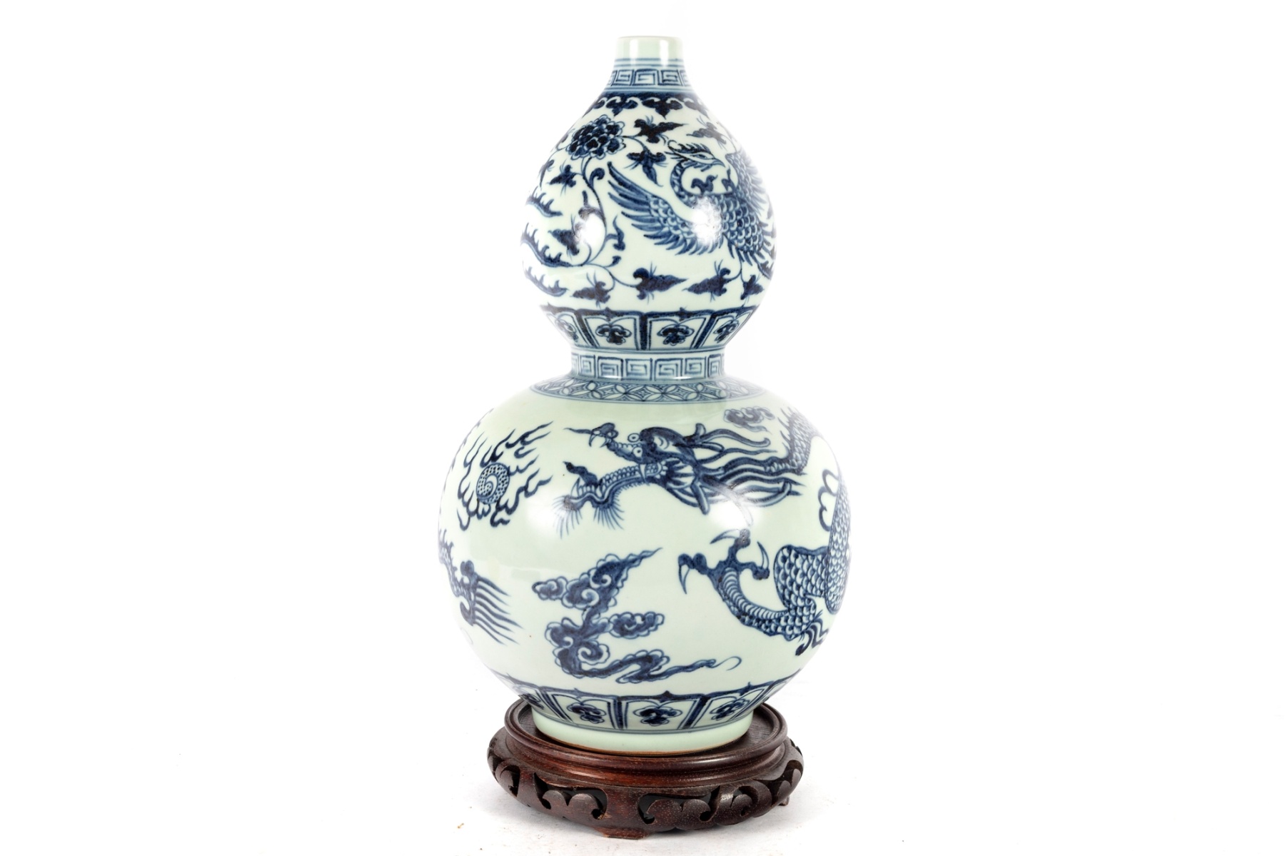 A fine Chinese blue and white glazed ceramic double gourd vase, decorated with hand-painted dragons and phoenixes among clouds, symbolizing power and harmony. Executed in deep cobalt tones under a clear glaze, and presented on a carved wooden stand.