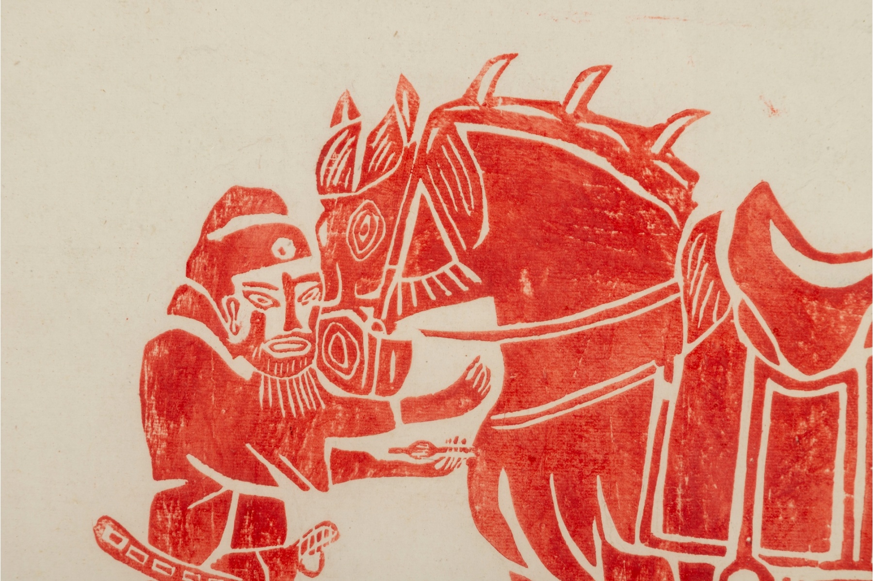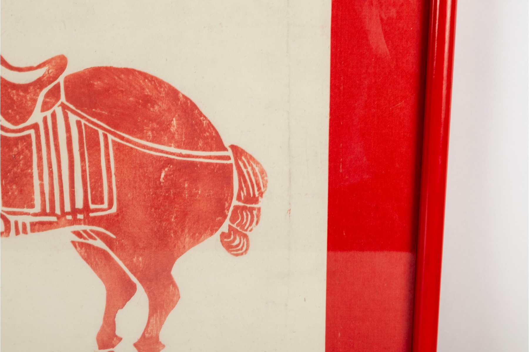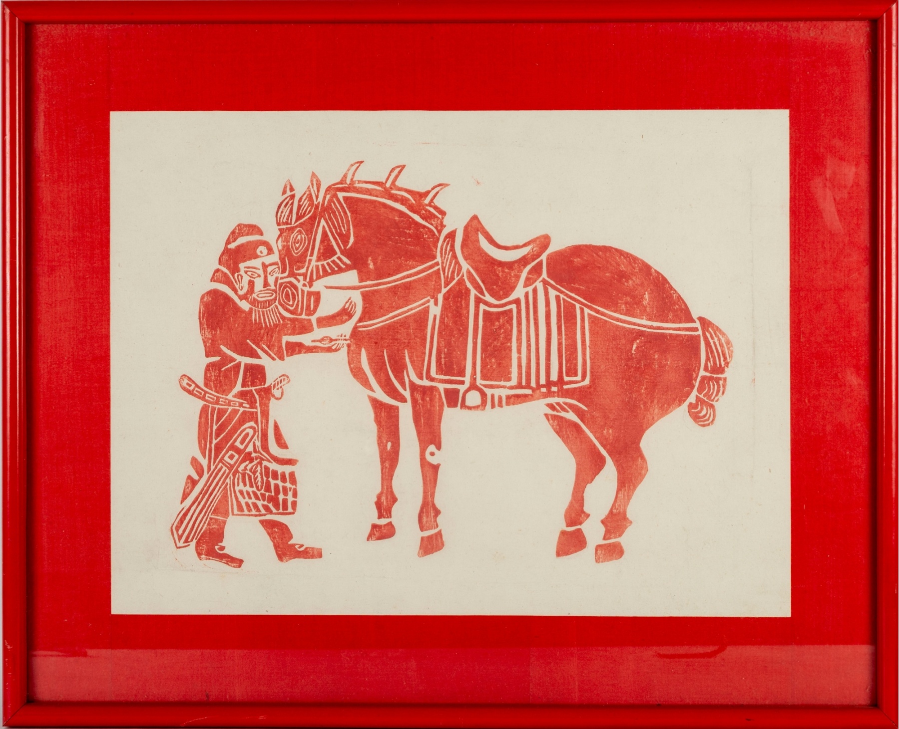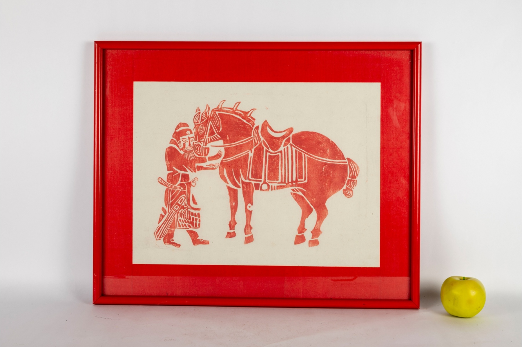 A striking vintage Chinese framed stone rubbing scroll featuring the image of a warrior highlighted in red pigment over rice paper. The artwork is presented behind glass, displayed in a simple red wood frame.