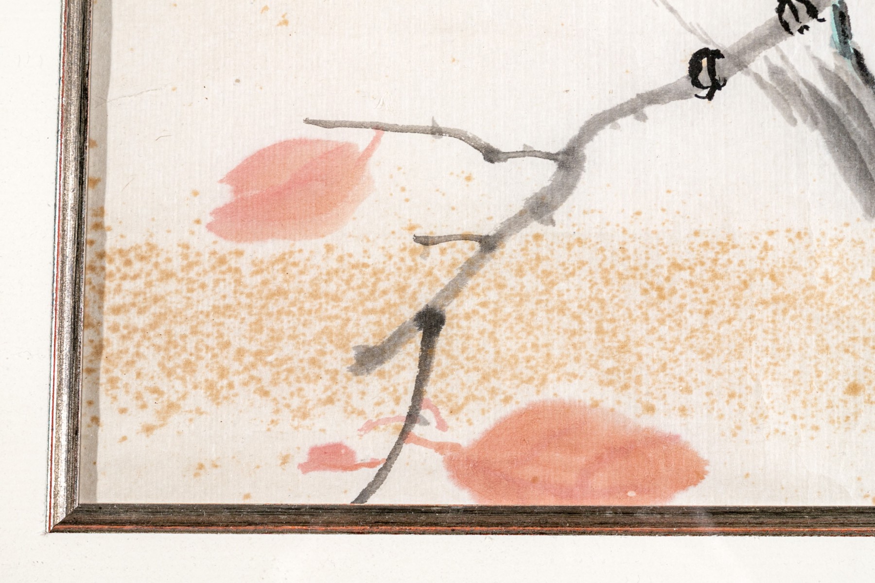 A colorful song bird perched in a red leafed tree. Presented in a metal frame with glass.