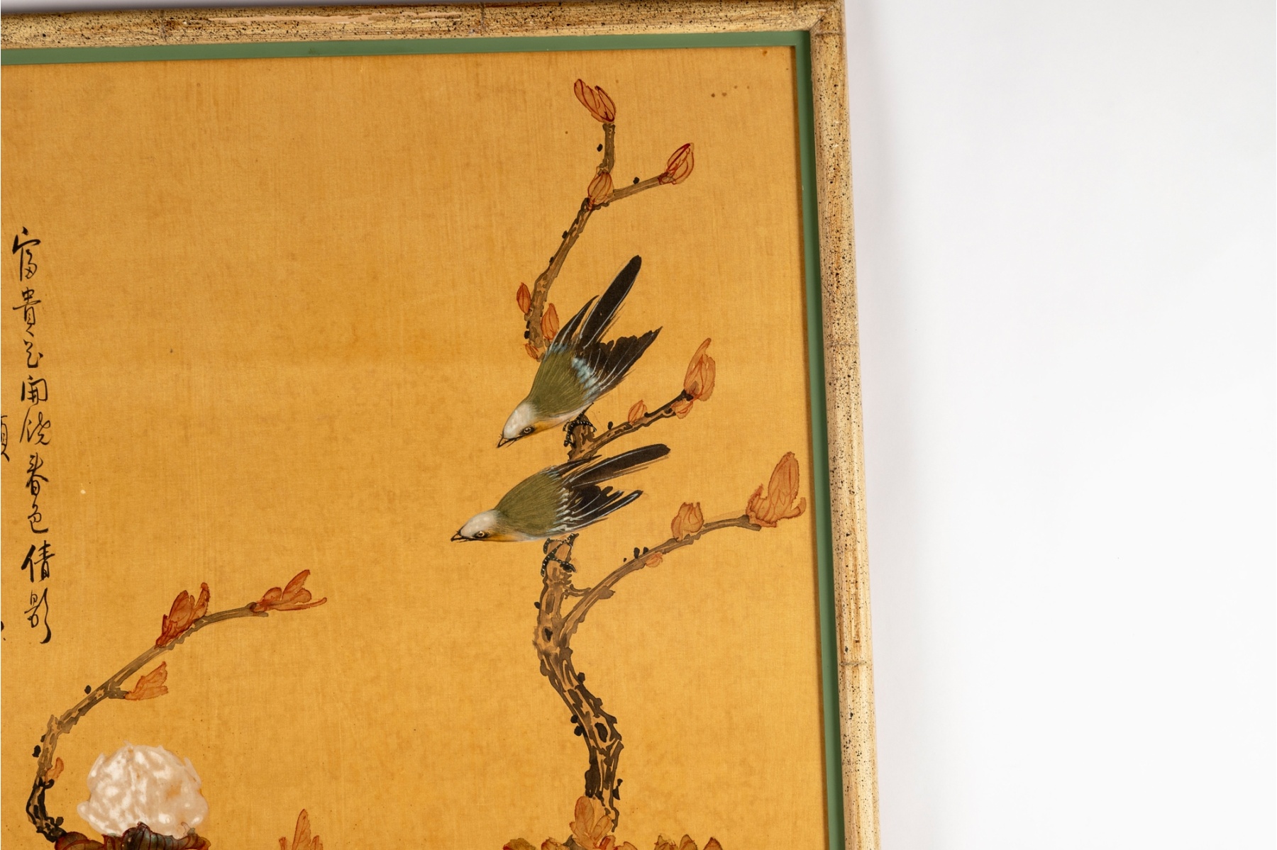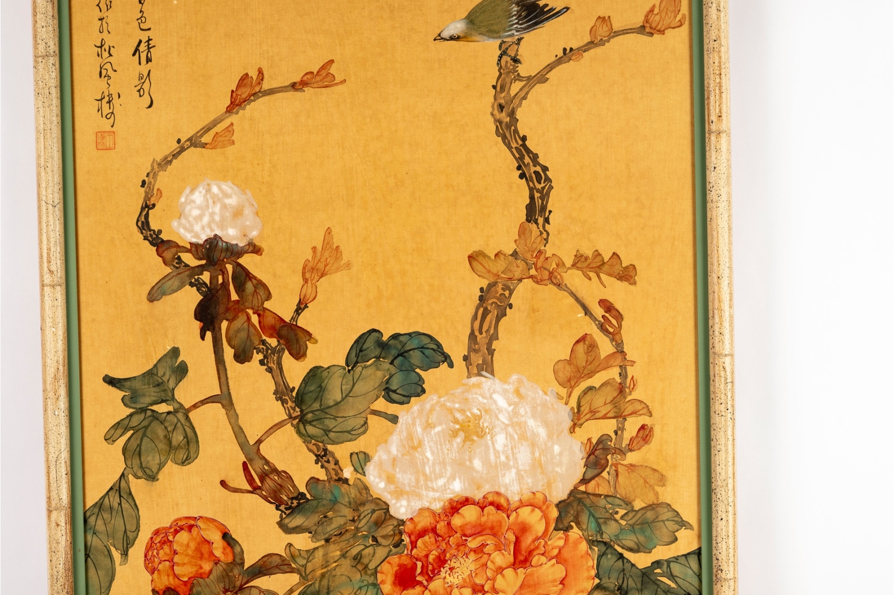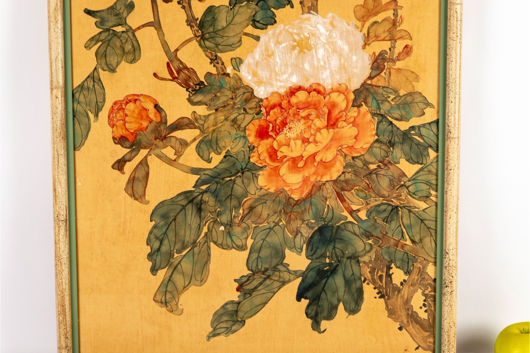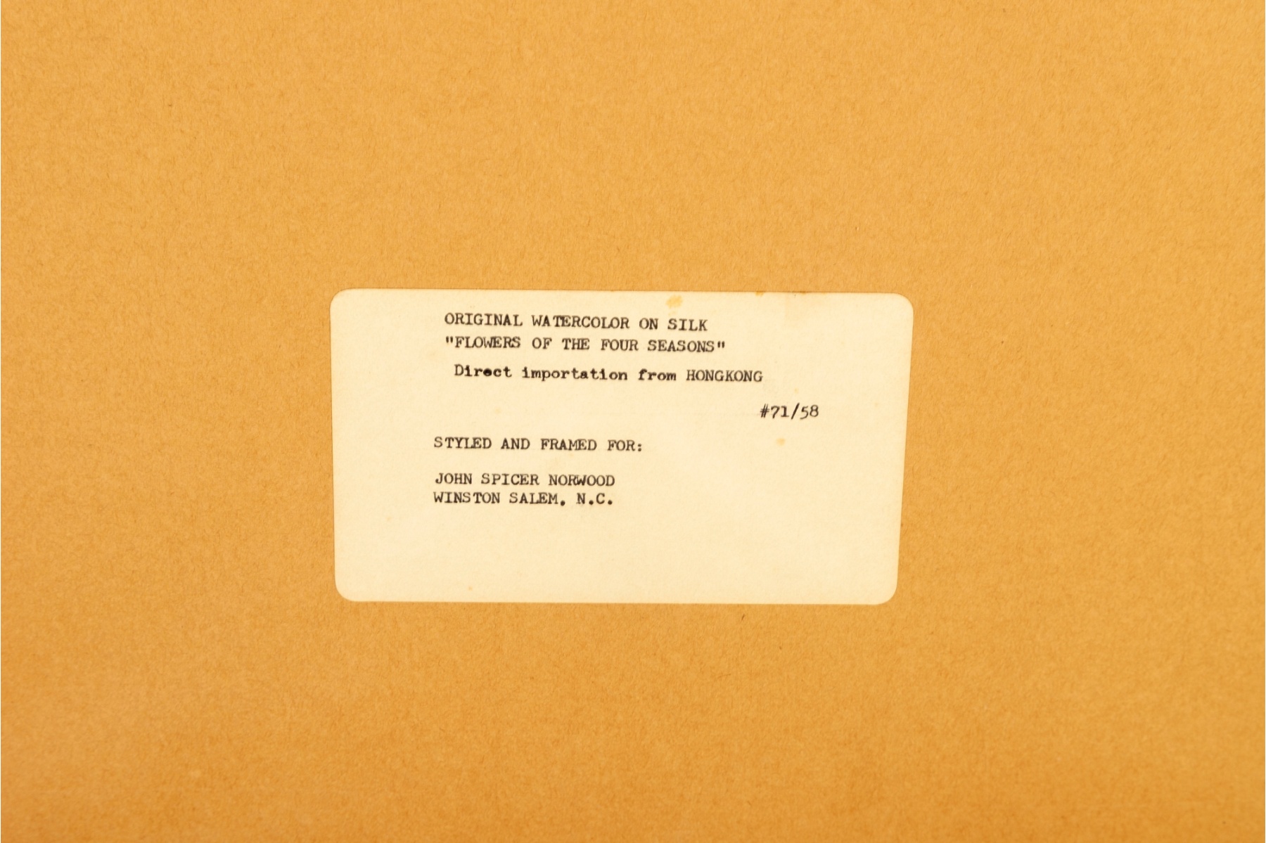 Original Watercolor on Silk “Flowers of the Four Seasons.” Direct importation from Hong Kong. Styled and framed for John Spicer Norwood, Winston-Salem, N.C.
