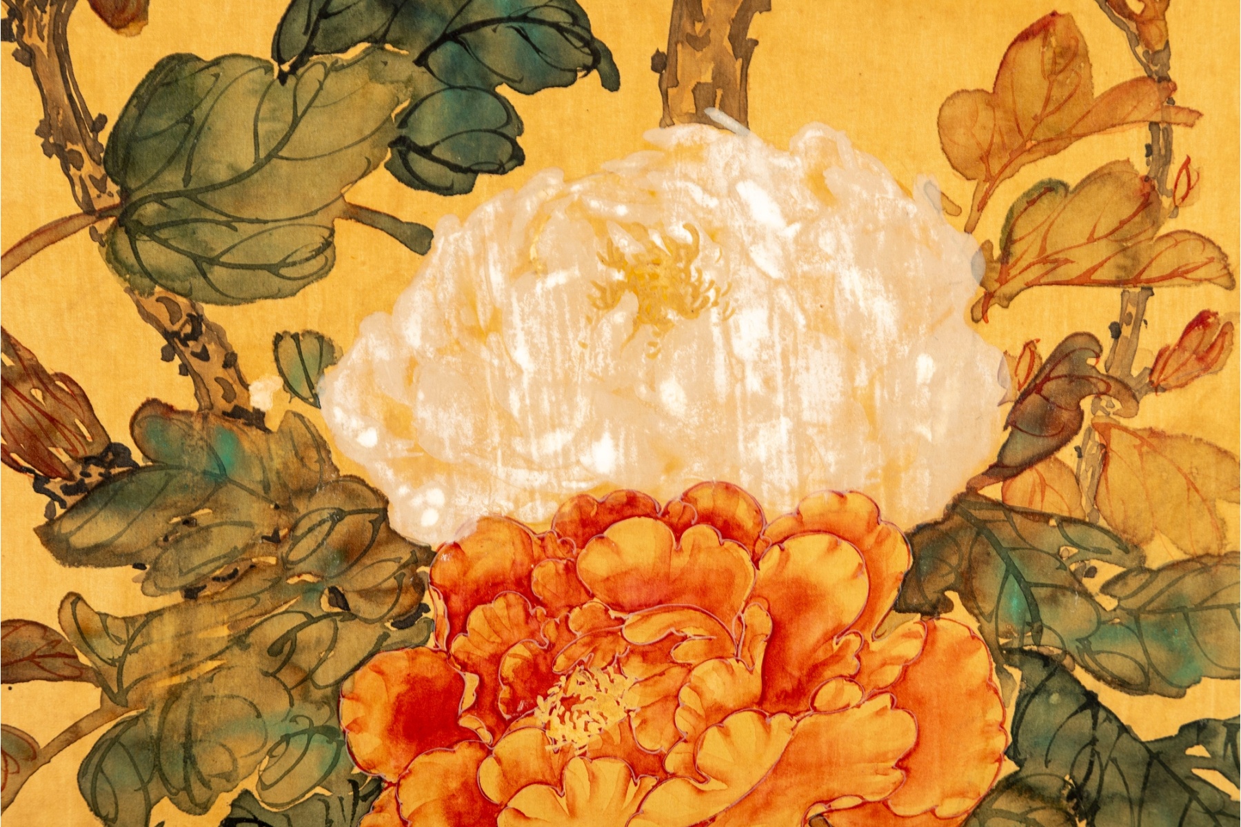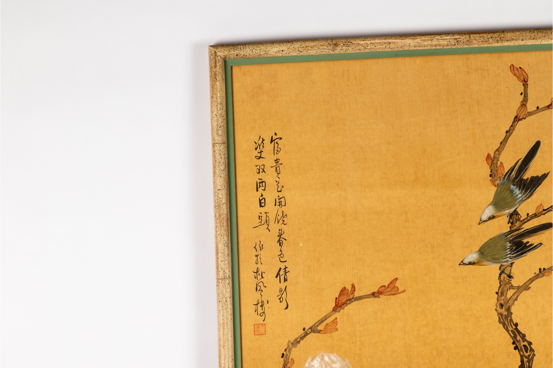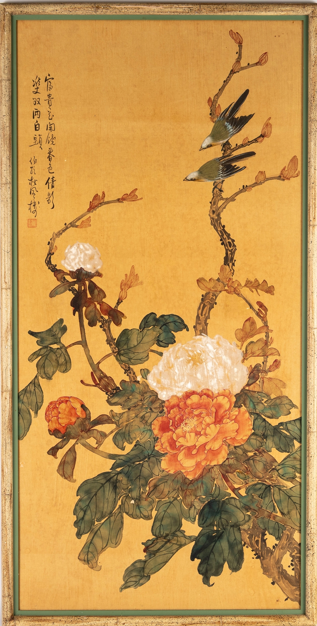 Elegant Chinese watercolor painting on silk depicting two songbirds perched among blooming peonies, a classic symbol of prosperity and beauty. The detailed brushwork and translucent layering bring life to the lush florals and delicate plumage, set against a warm golden silk ground. Inscription and artist seal appear at upper left.