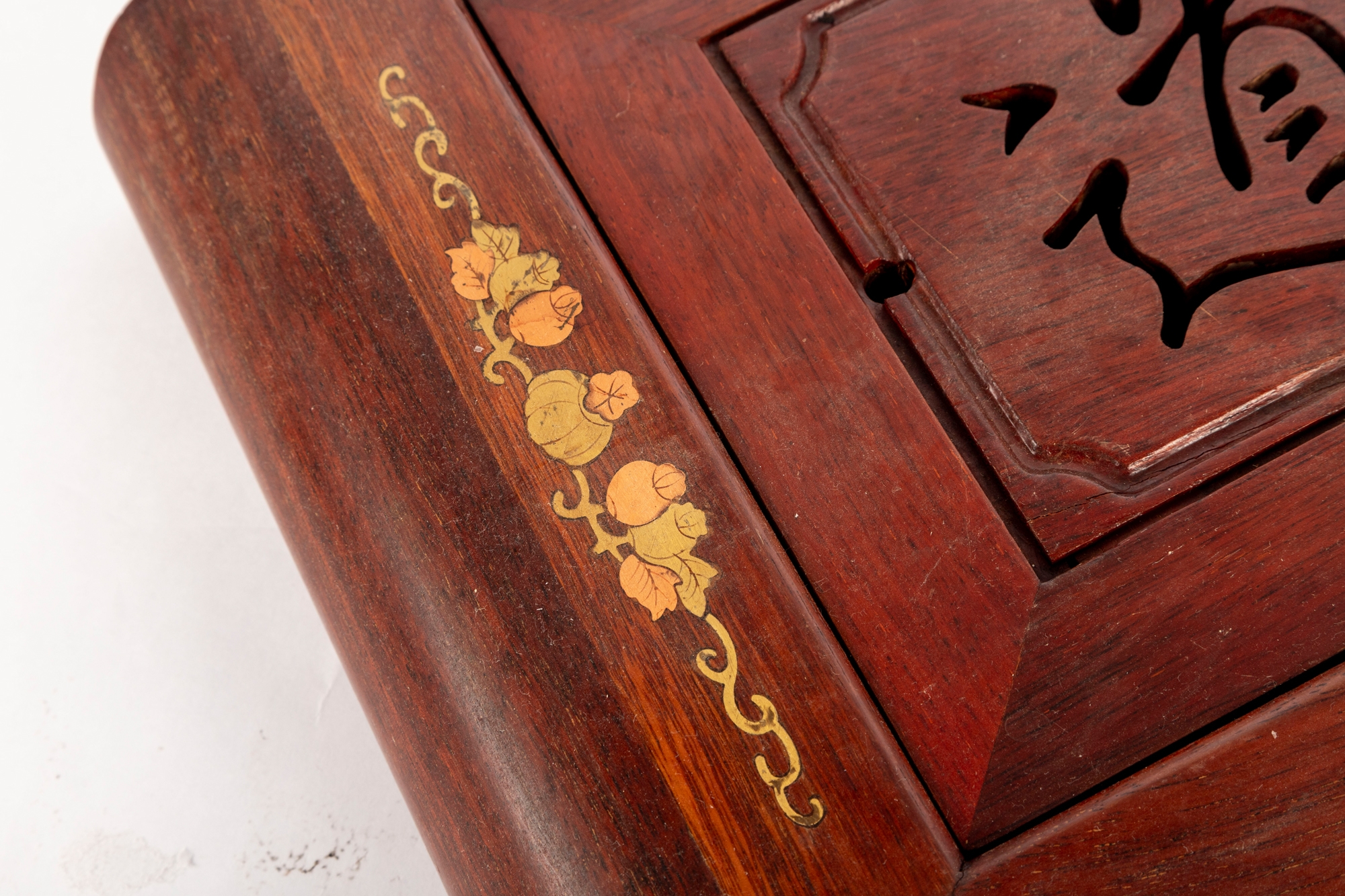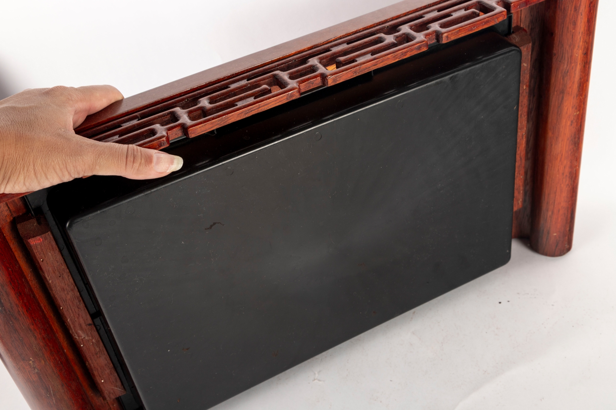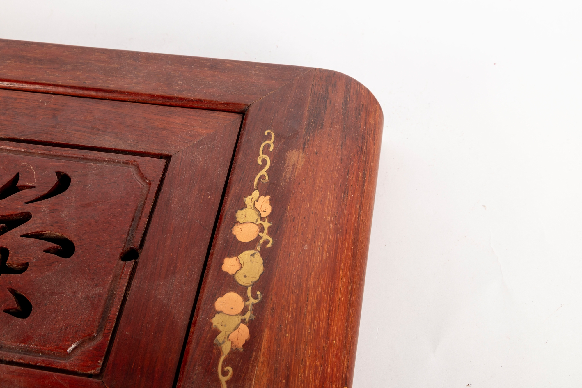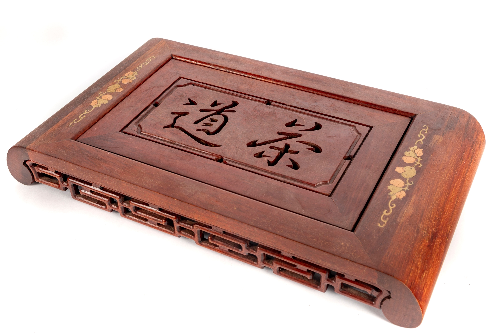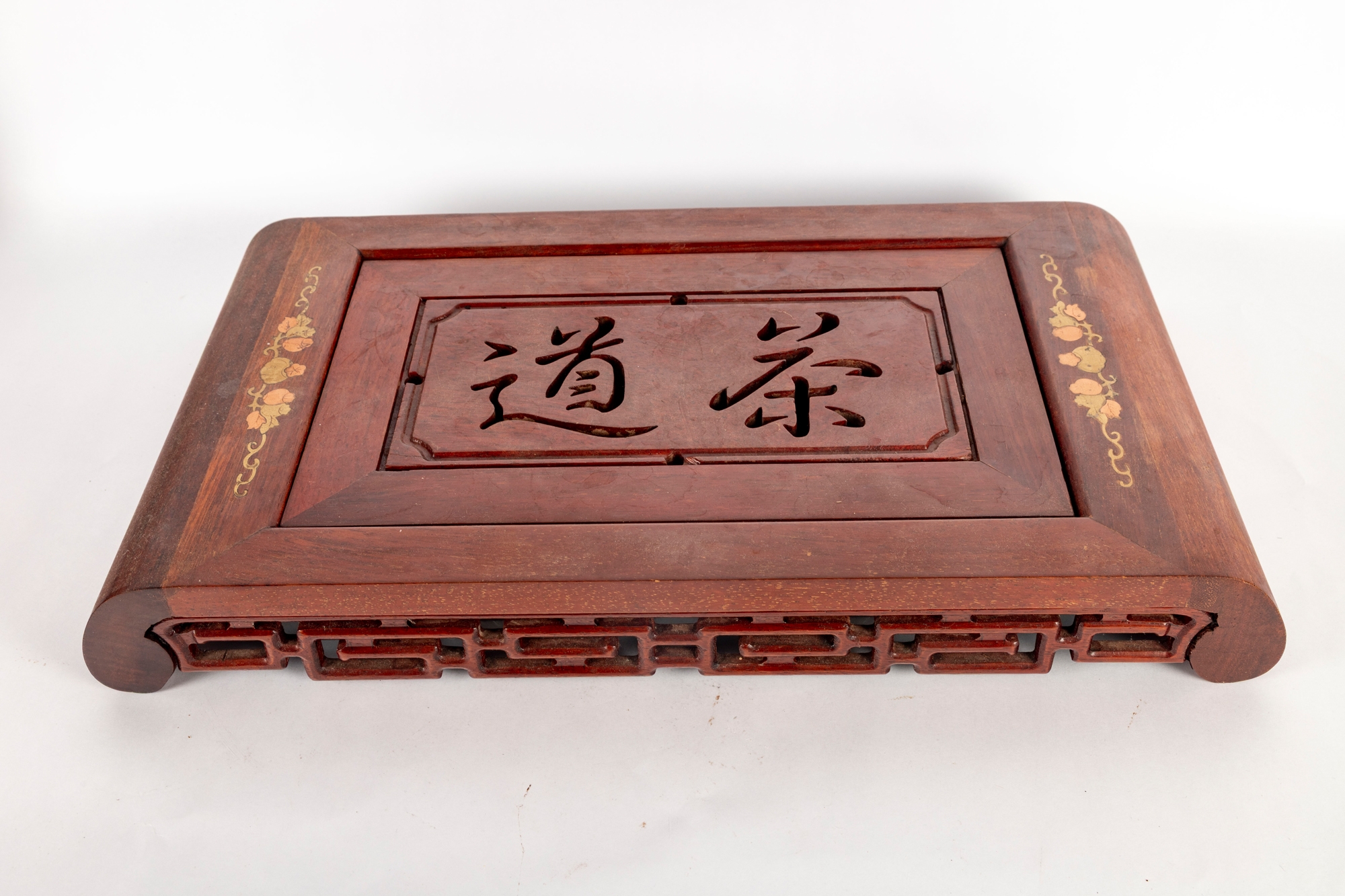 Beautifully crafted traditional Chinese tea ceremony tray featuring intricate carved latticework and decorative inlay details. The top panel showcases cut-out Chinese characters and gently rounded edges, giving it an elegant, classic look. Beneath the wooden tray is a removable plastic basin designed to collect excess water during tea preparation.
