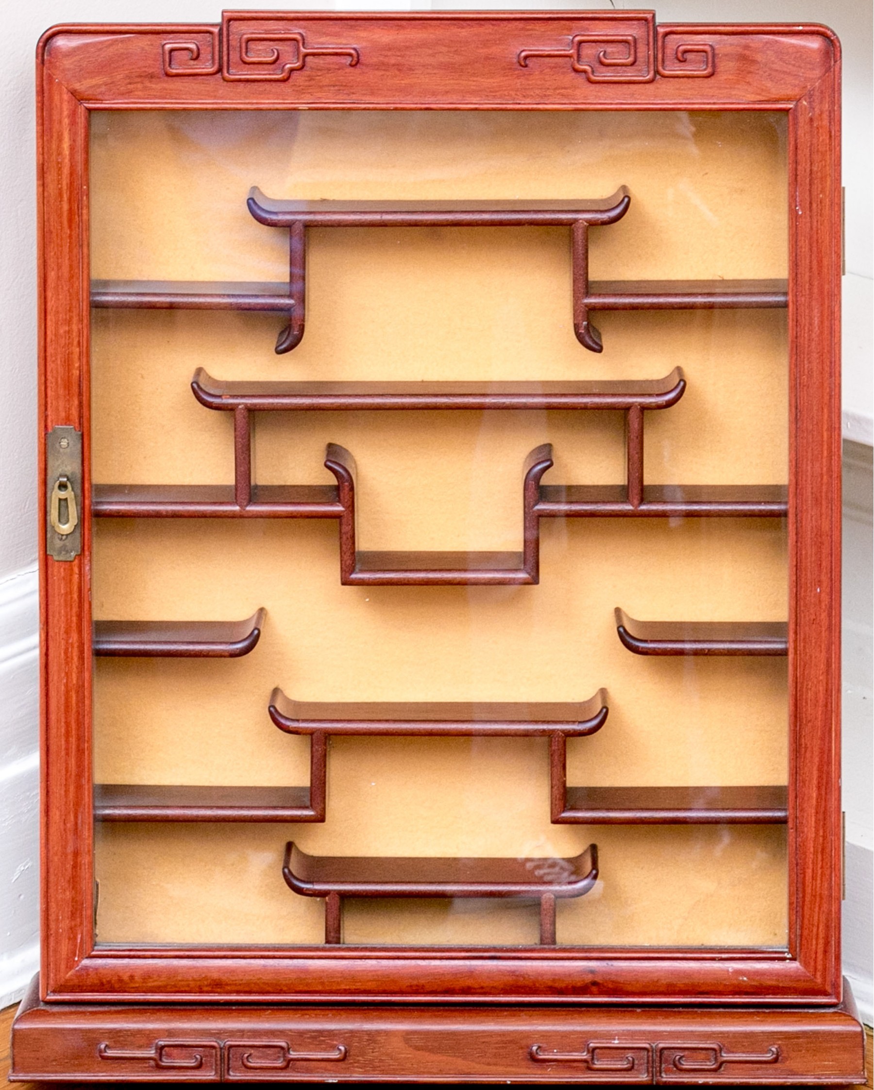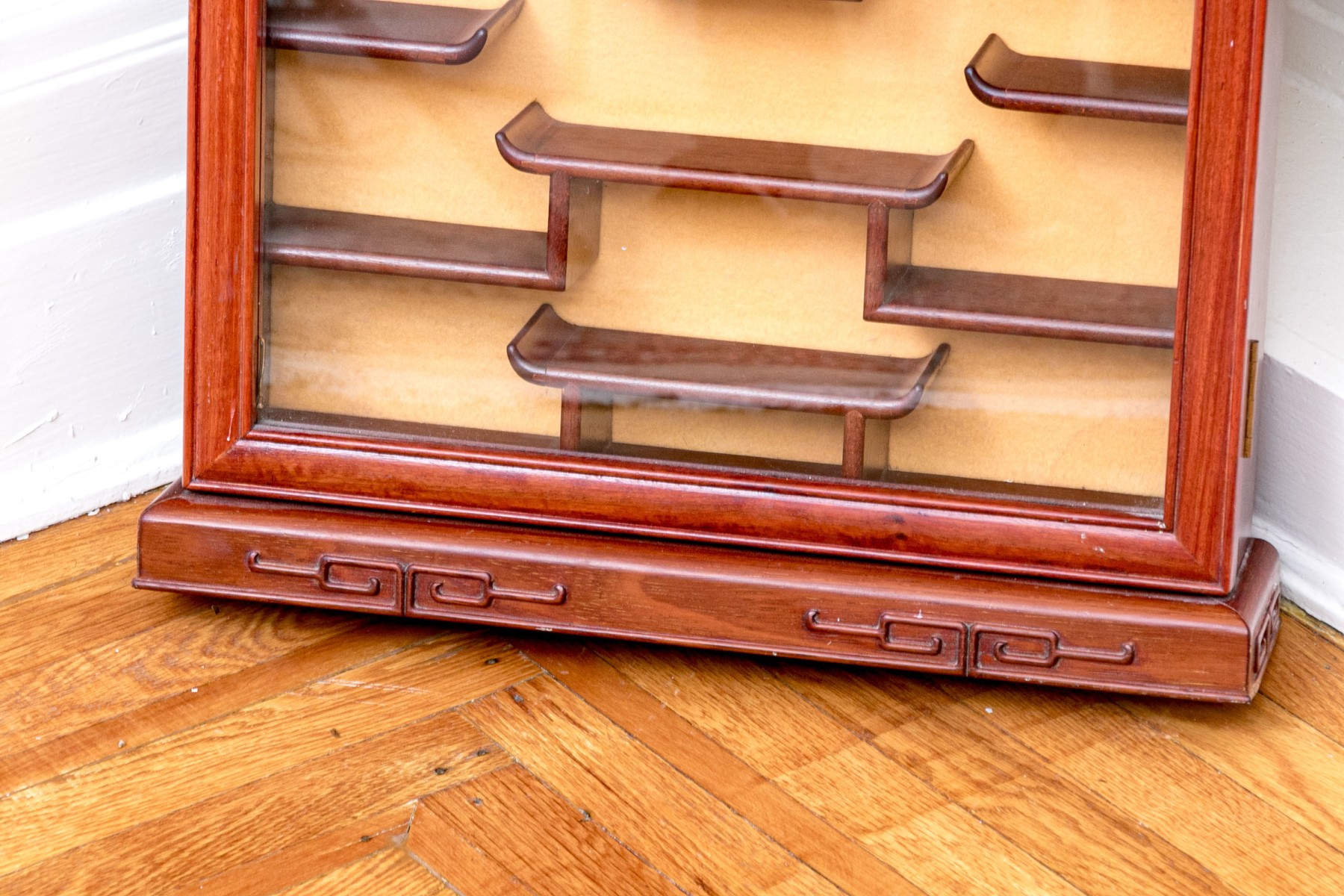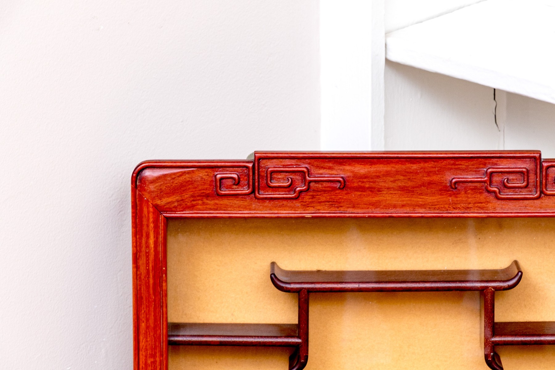 A vintage Chinese wooden wall vitrine, characterized by a scroll-carved pediment and base. The glass door encloses a series of shaped shelves, blending traditional craftsmanship with a functional and stylish display case.