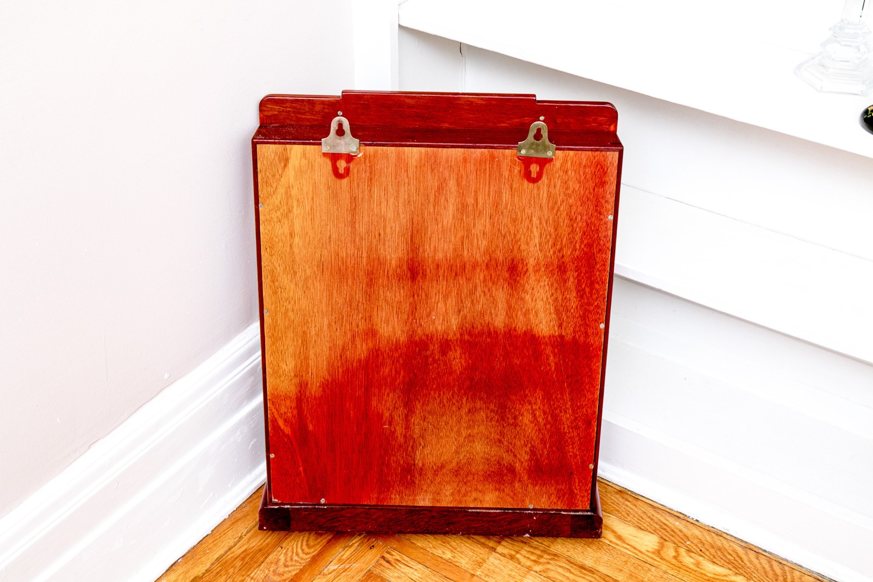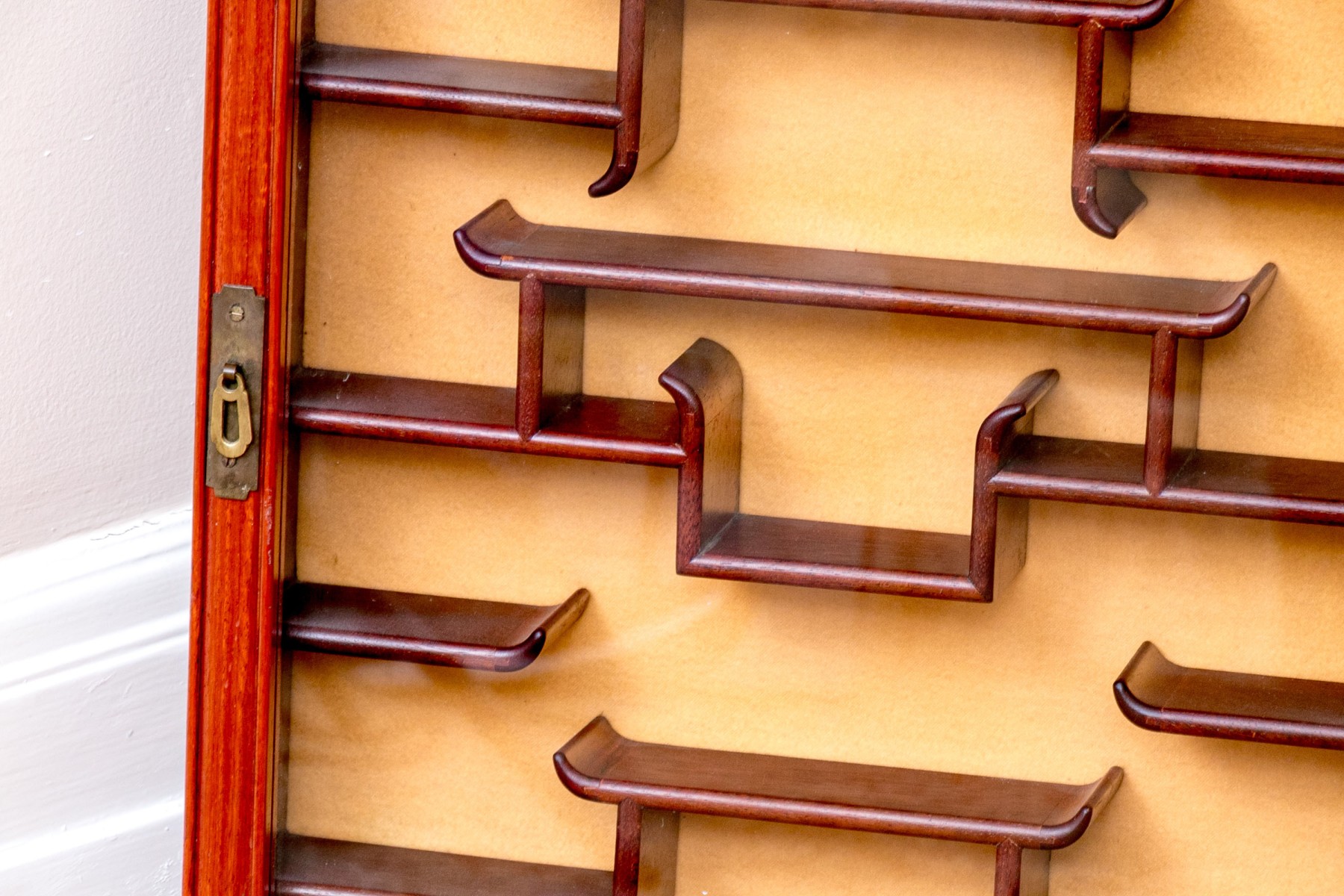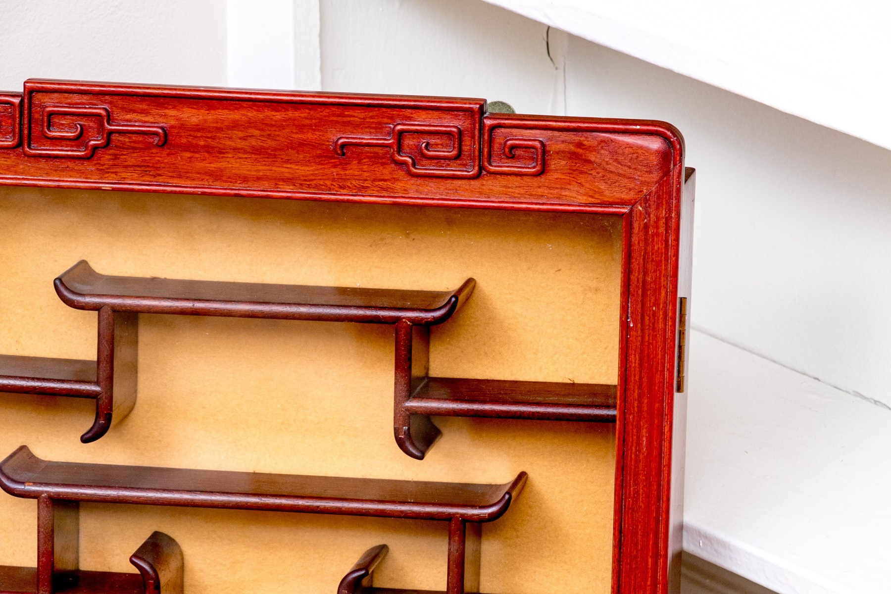 A vintage Chinese wooden wall vitrine, characterized by a scroll-carved pediment and base. The glass door encloses a series of shaped shelves, blending traditional craftsmanship with a functional and stylish display case.