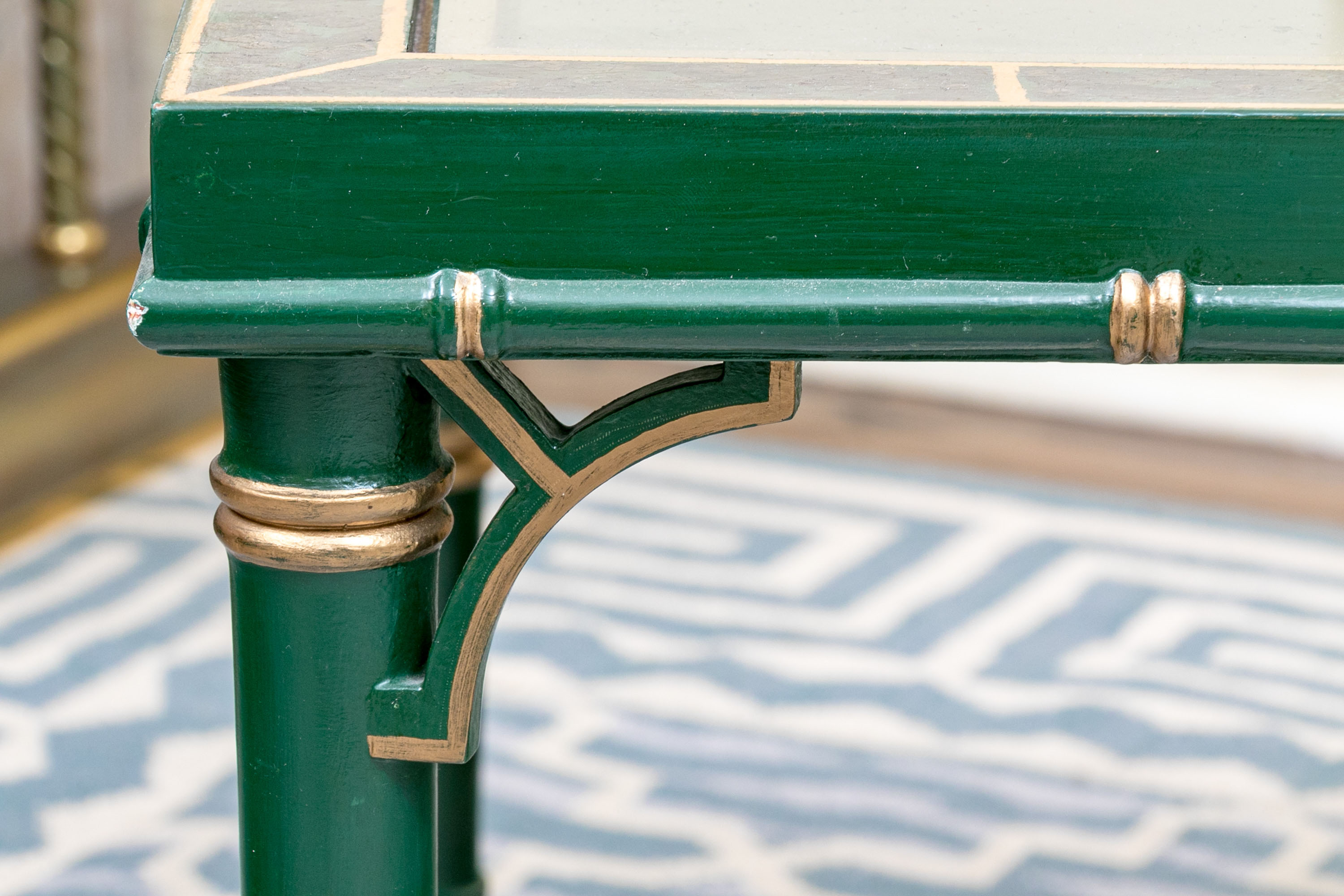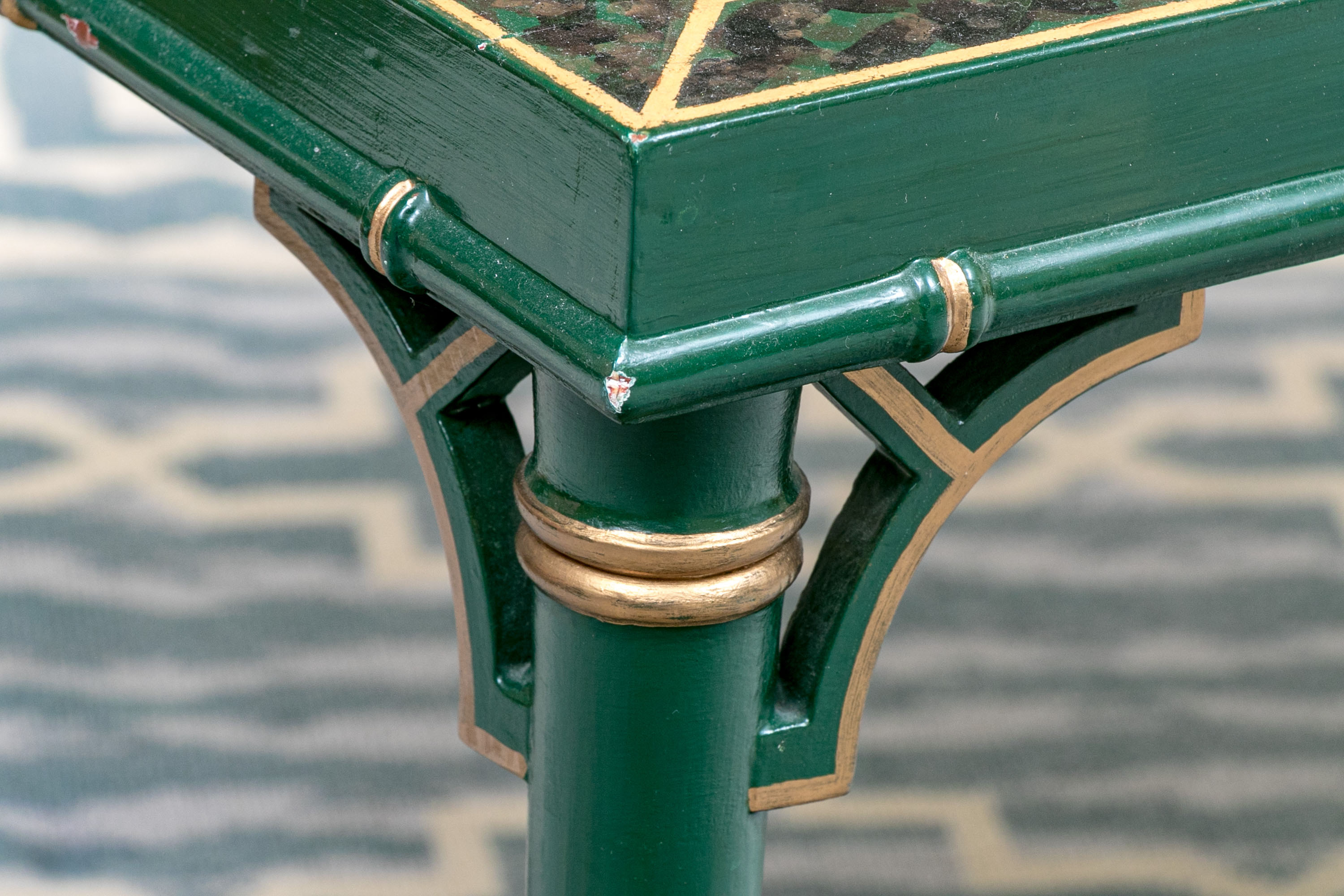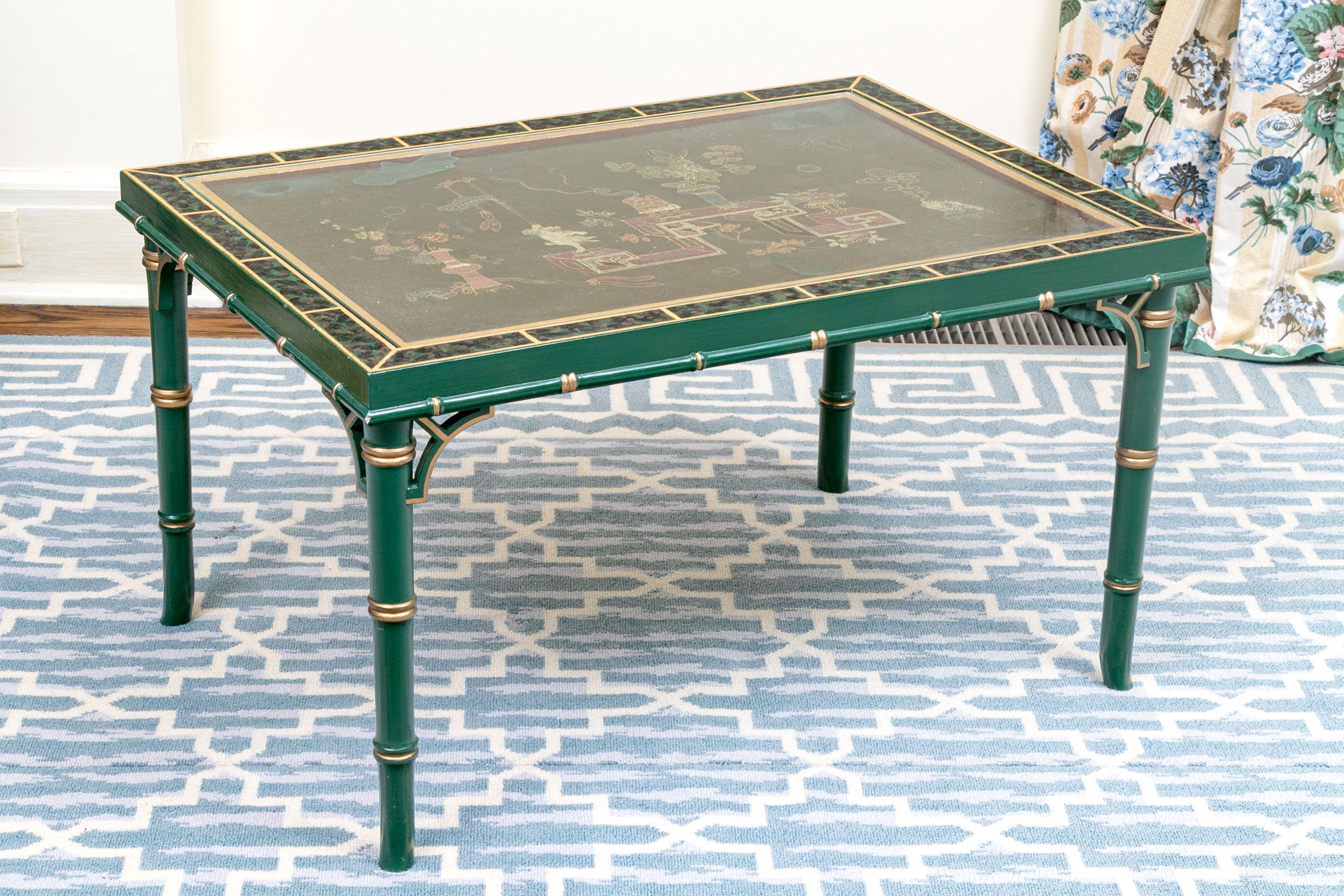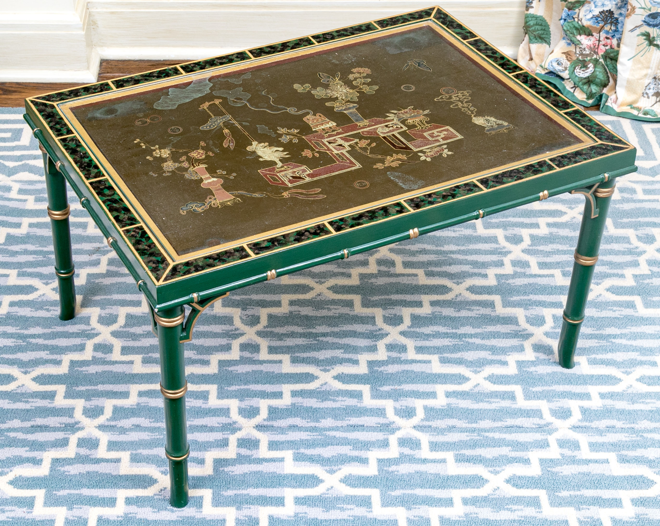 On four faux bamboo carved green and gilt finished legs supporting the table top with gilt finished brick motif around the ebonized lacquered ground with ornate scene to table top with glass panel.