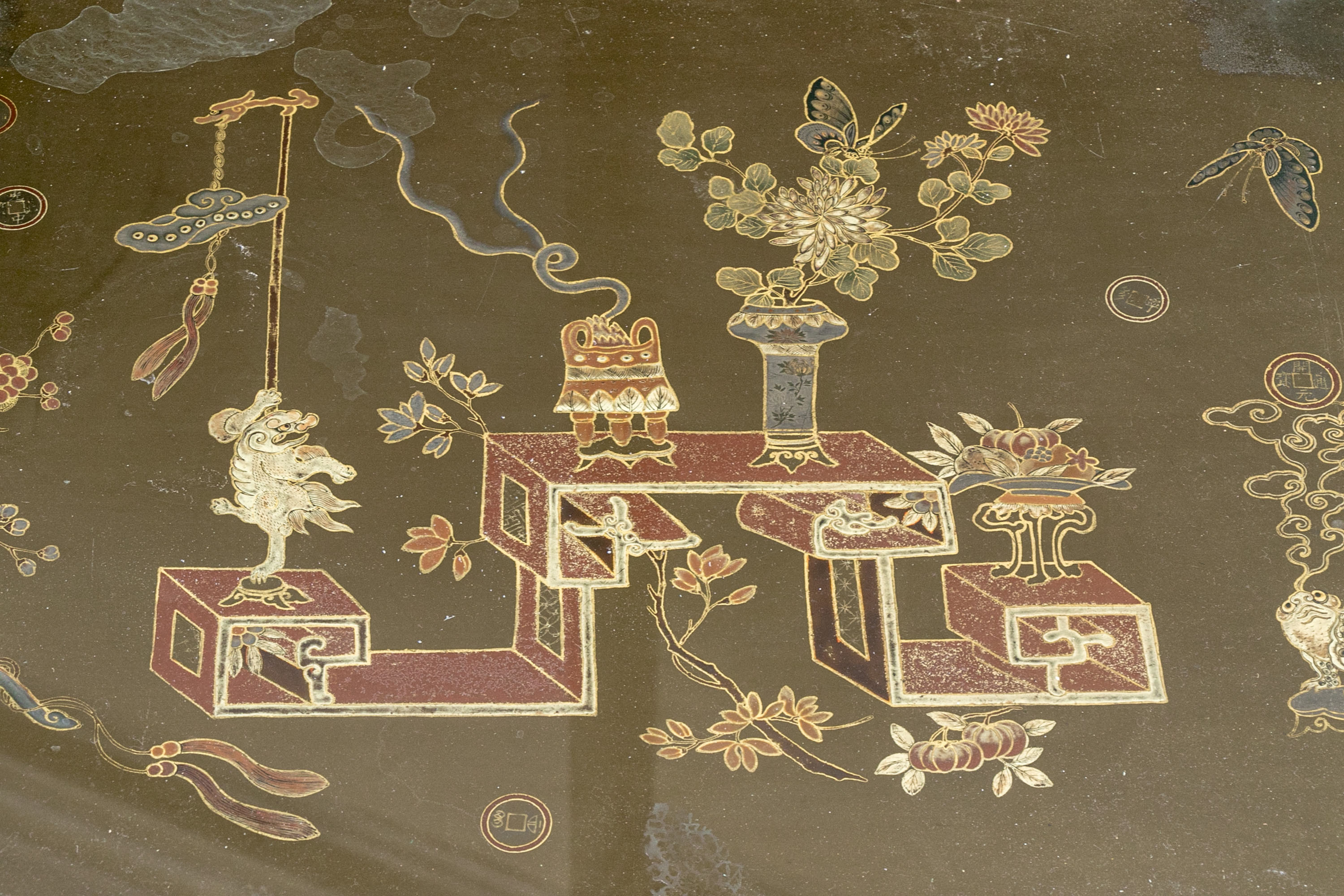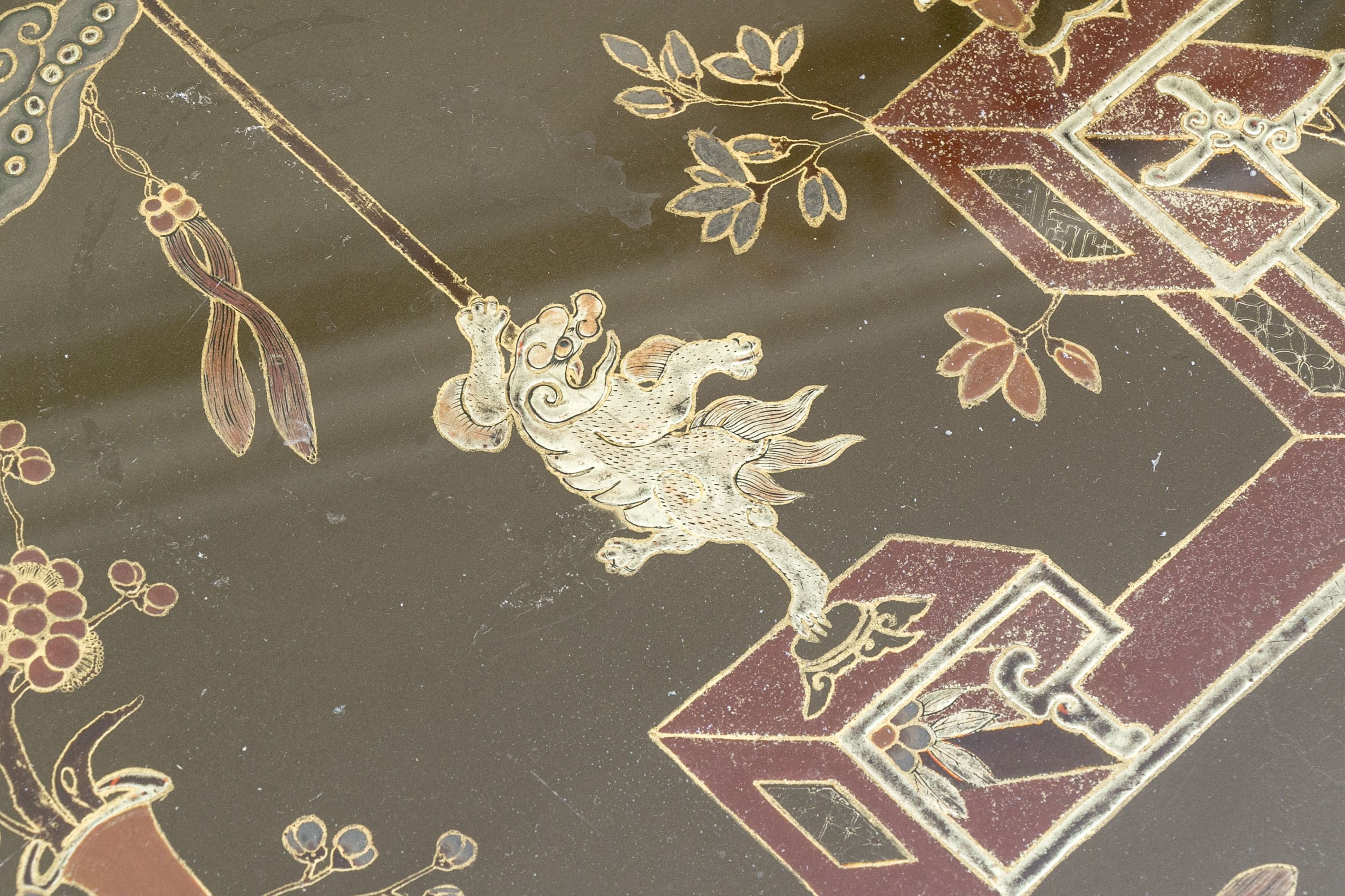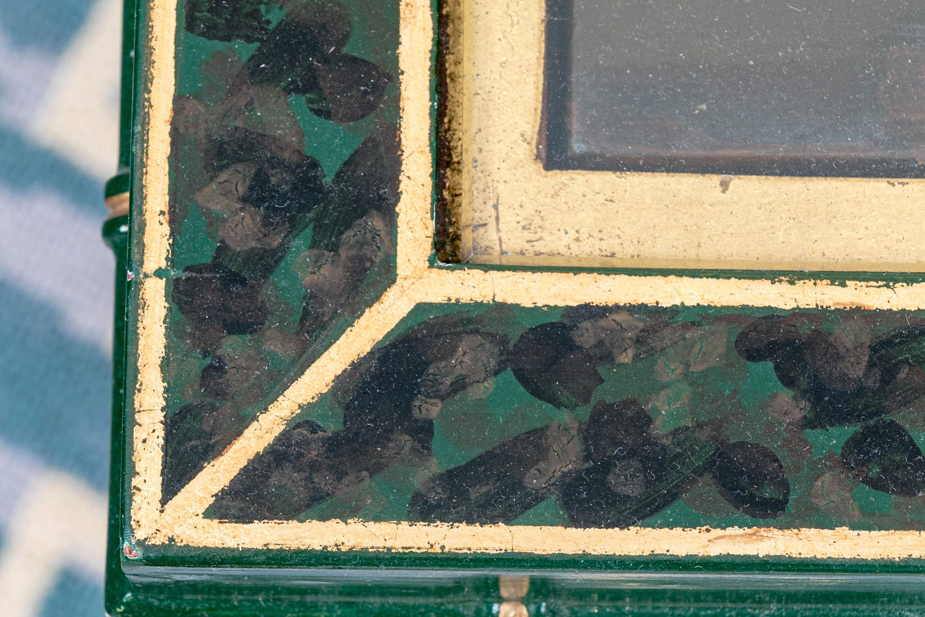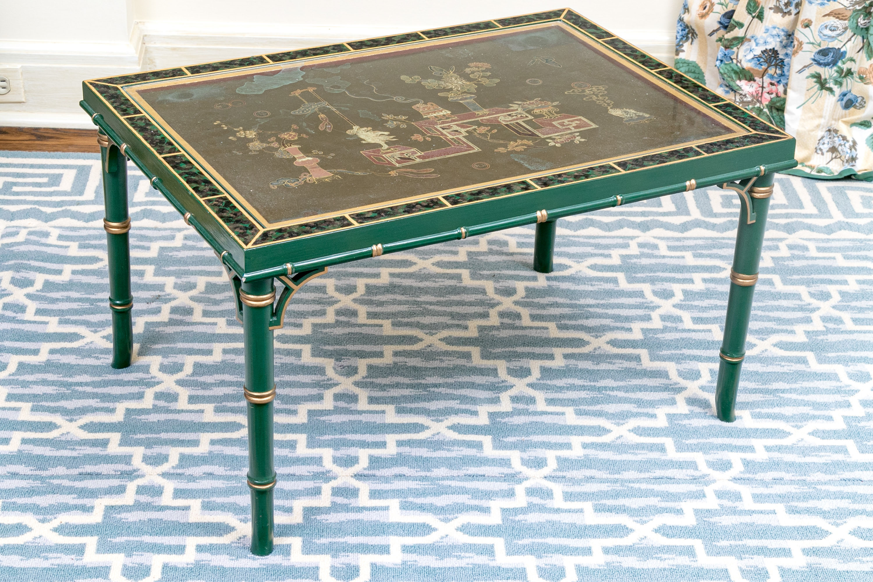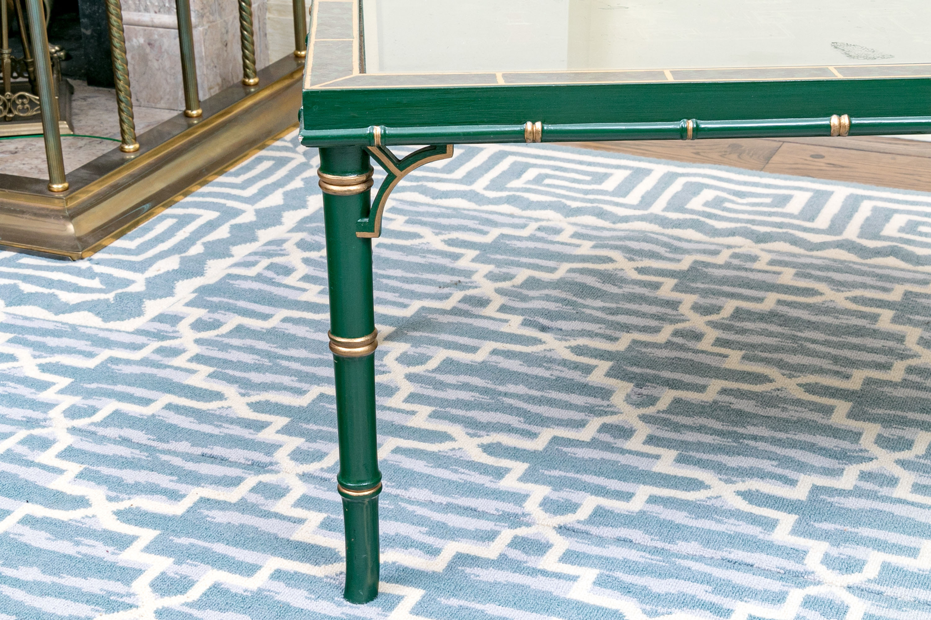 On four faux bamboo carved green and gilt finished legs supporting the table top with gilt finished brick motif around the ebonized lacquered ground with ornate scene to table top with glass panel.