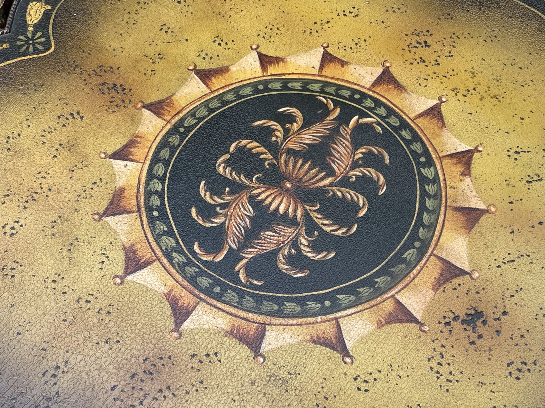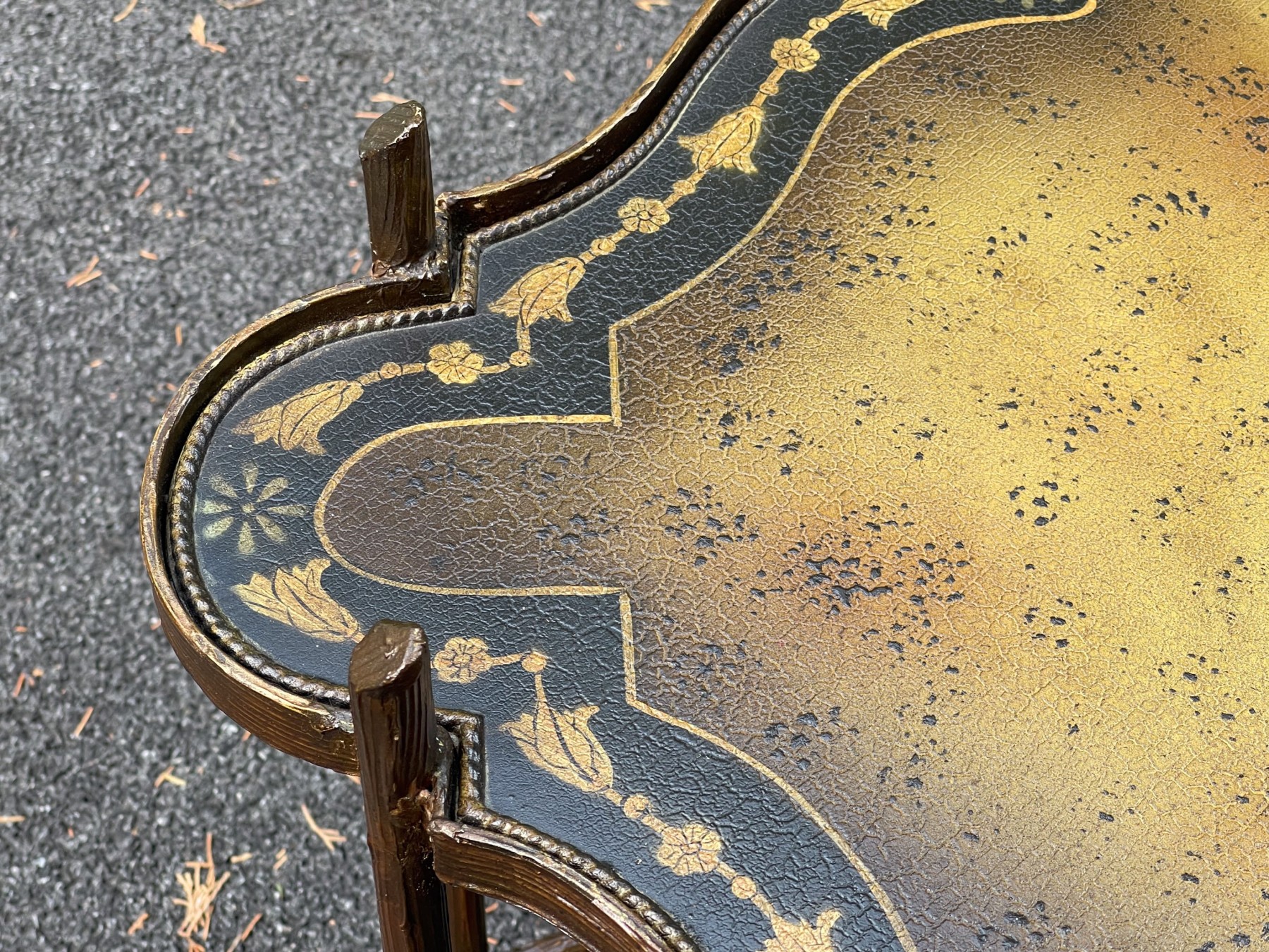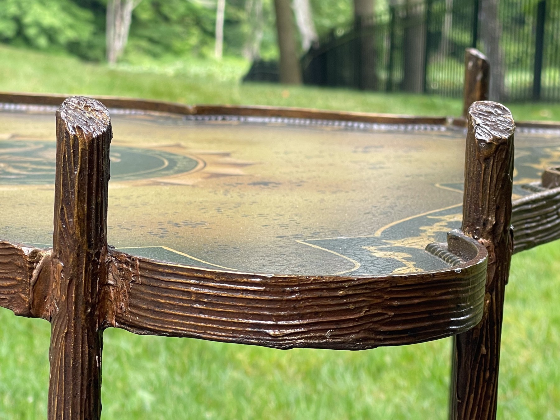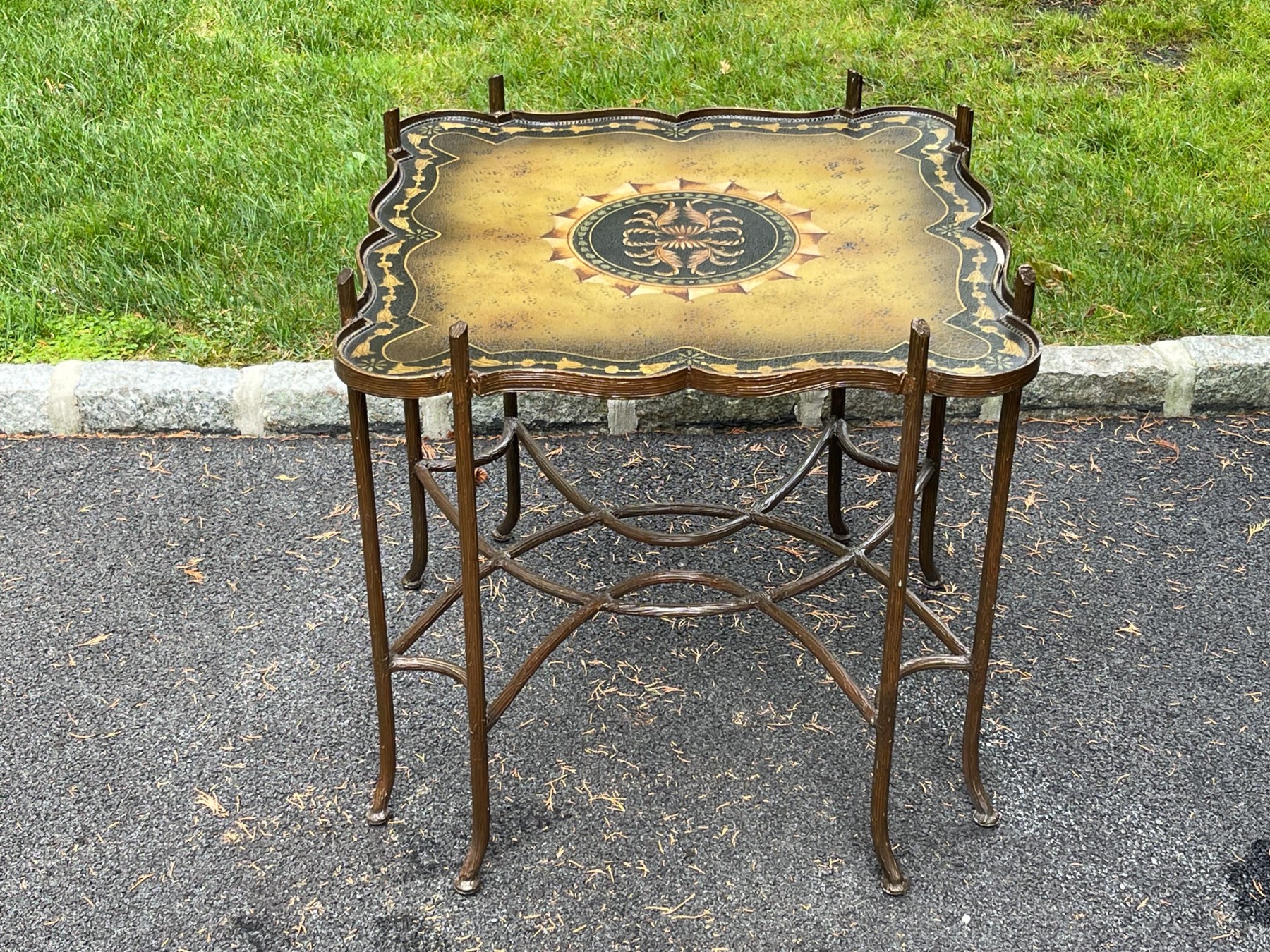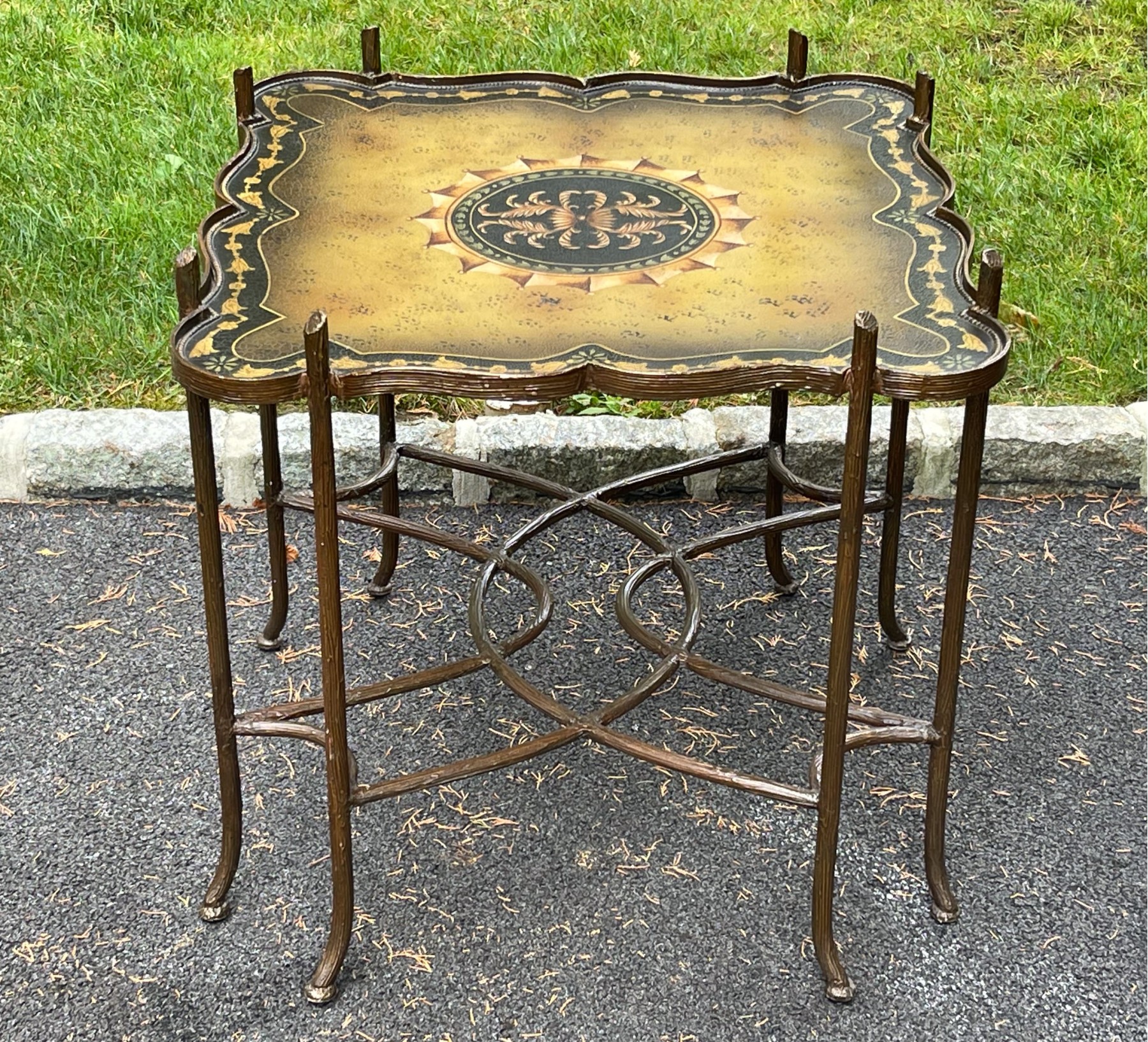 A fabulous quality cocktail table, likely Maitland-Smith, incorporating Chinoiserie and Hollywood Regency influences. Features a subtle crackle textured serpentine square top ornately tole with a symmetrical foliate flourish motif at the center surrounded by yellow and black borders. Raised on a striking faux bois gilt iron base with two legs at each corner leading to a decorative swooping X-form stretcher with curving lines.