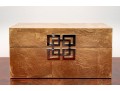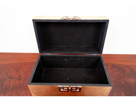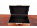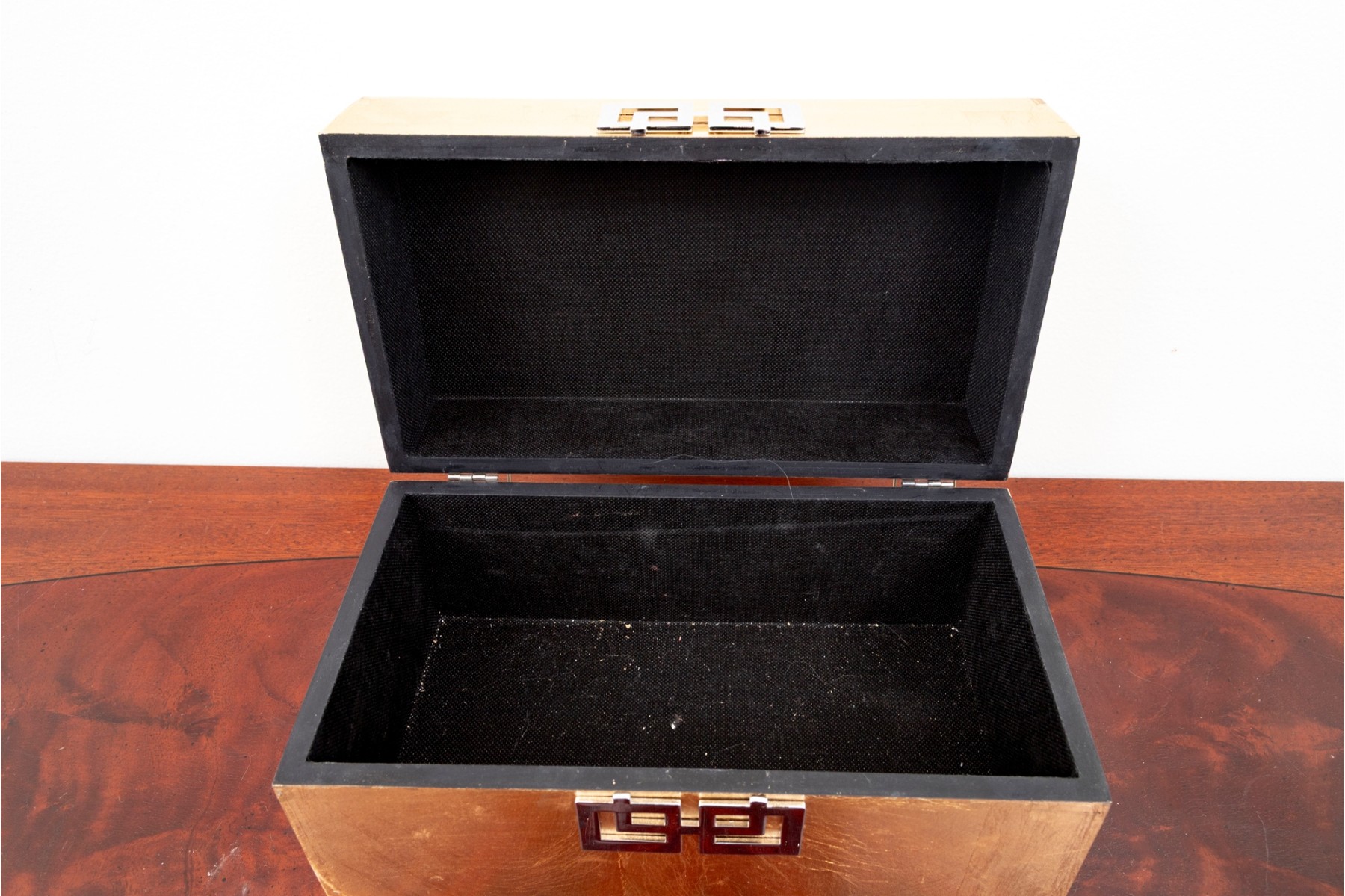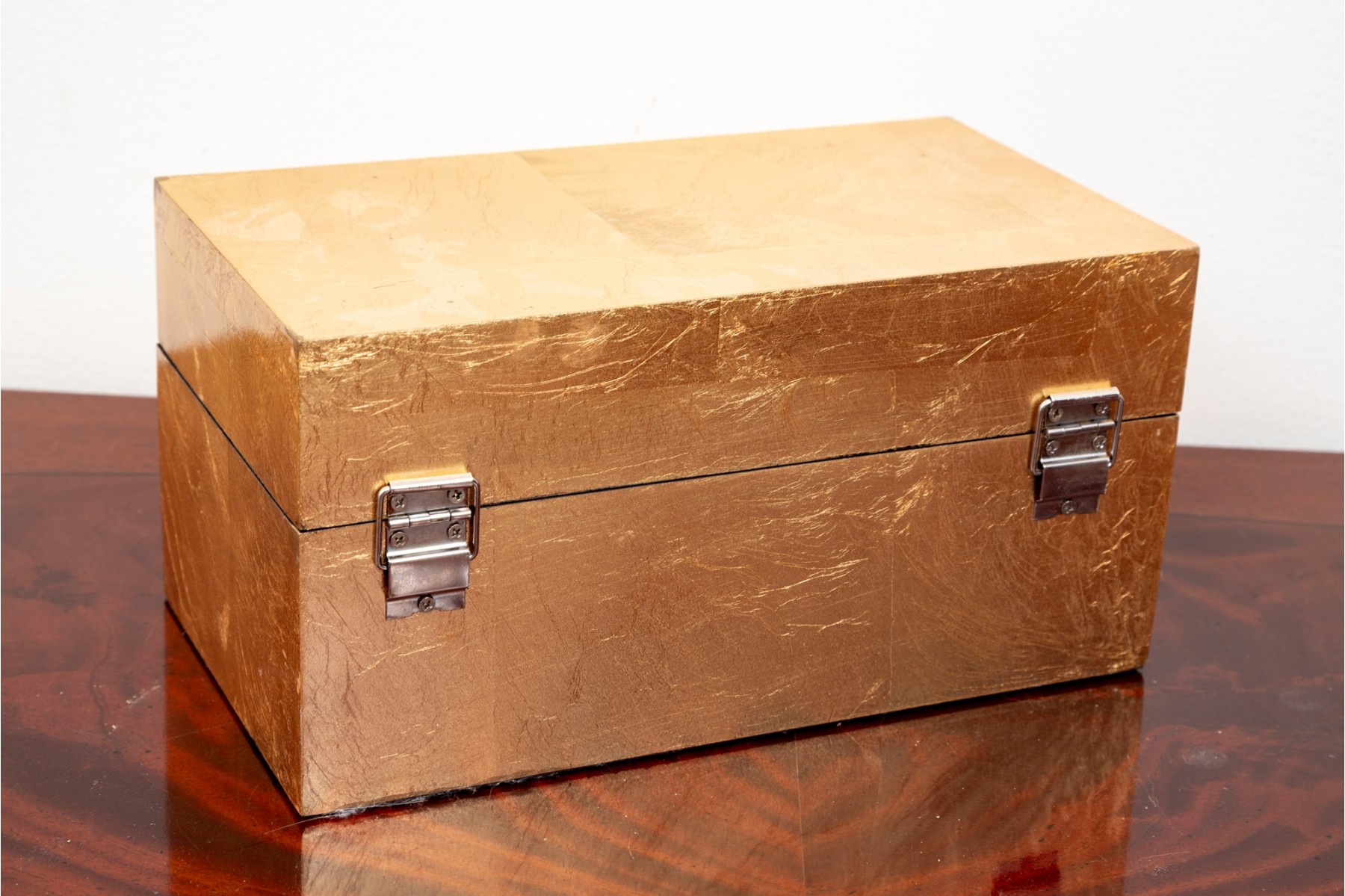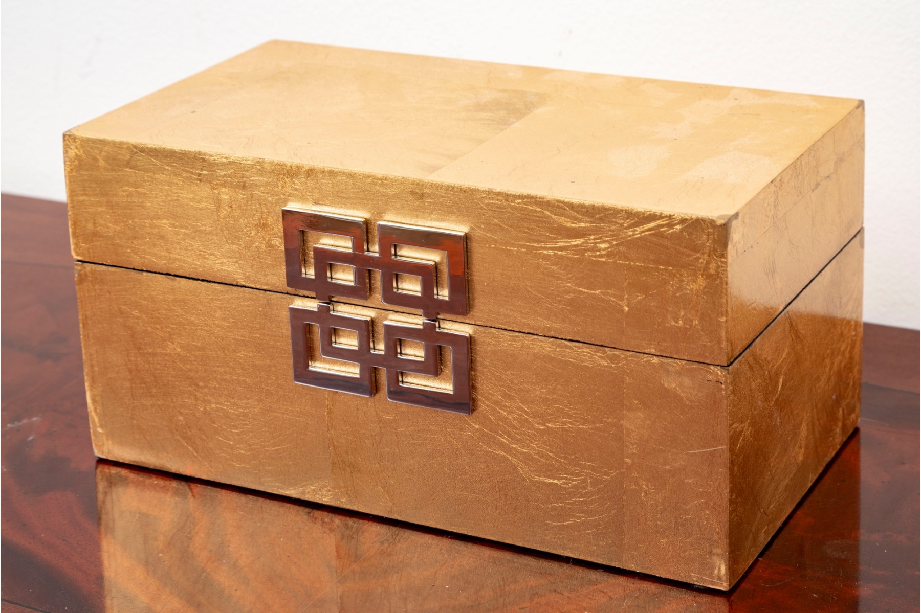 A chinoiserie trinket box displaying rich gold leaf decoration on a lacquered surface. The hinged lid opens to reveal a black fabric-lined interior, ideal for storing keepsakes or jewelry.