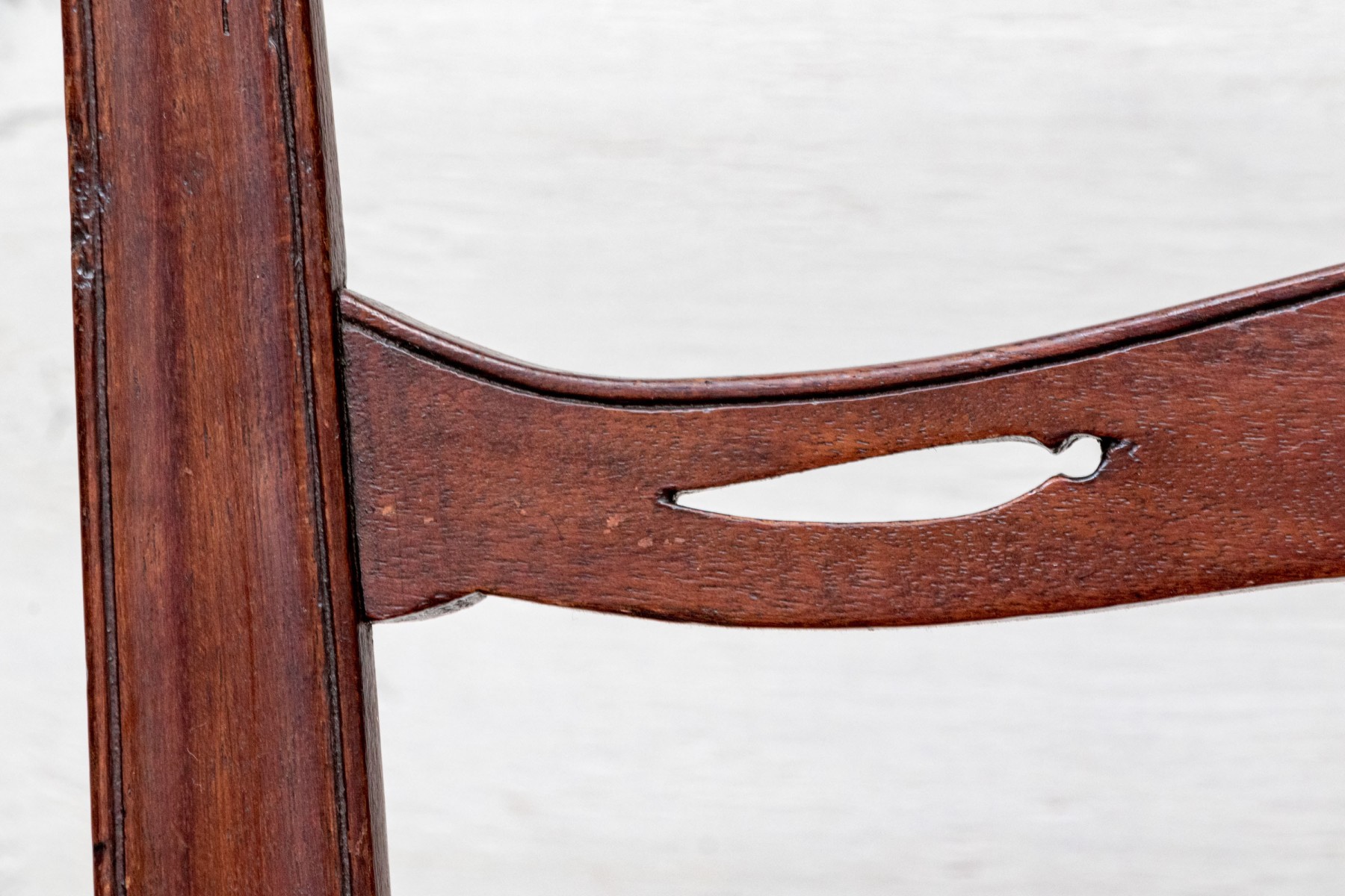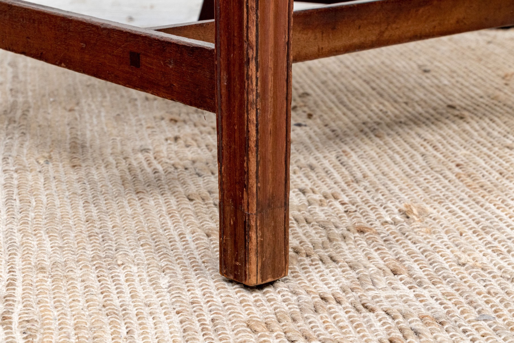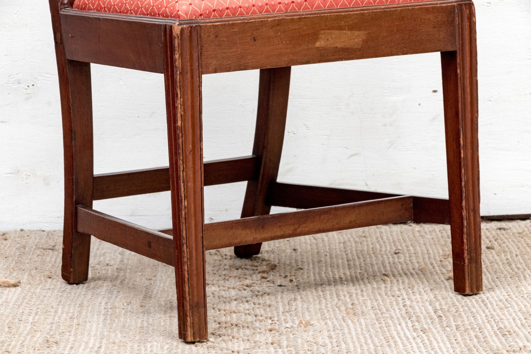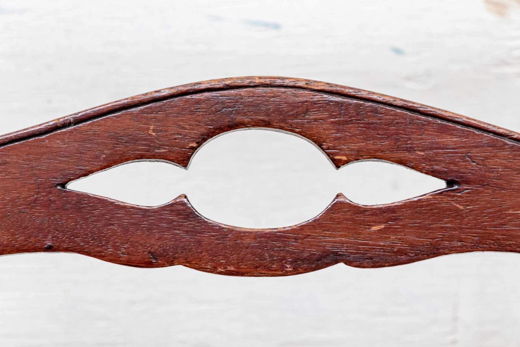 The pierced serpentine crest above three similarly pierced graduated slats and removable upholstered seat, on square tapering legs joined by stretchers.