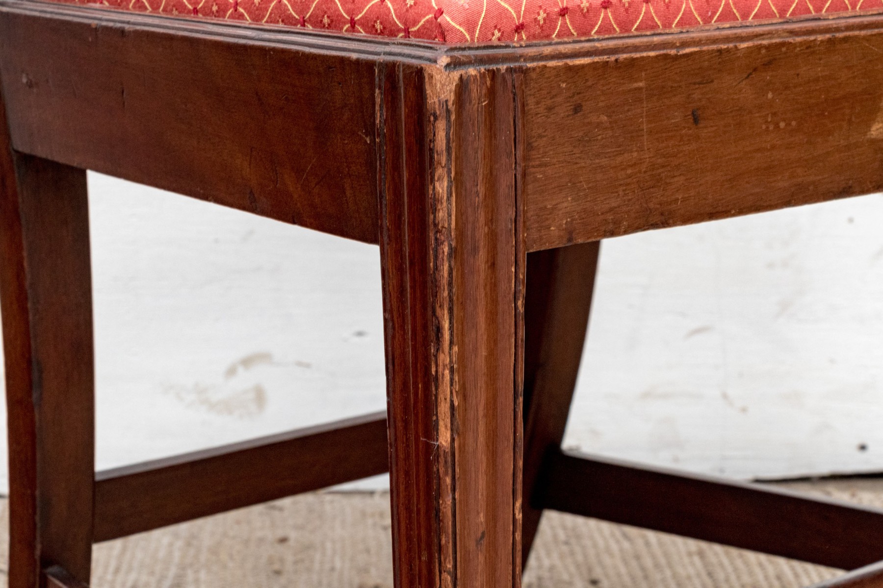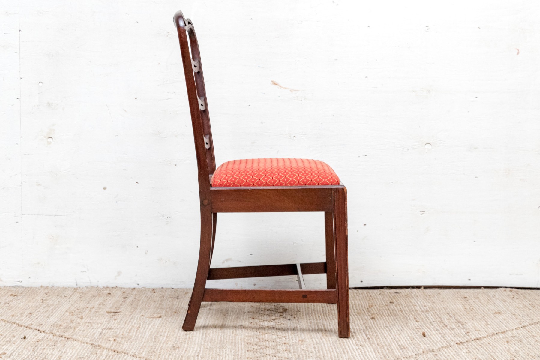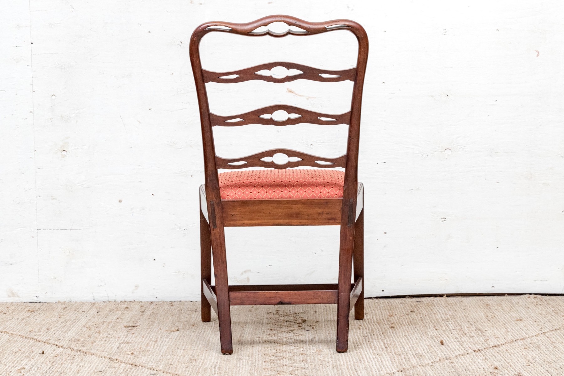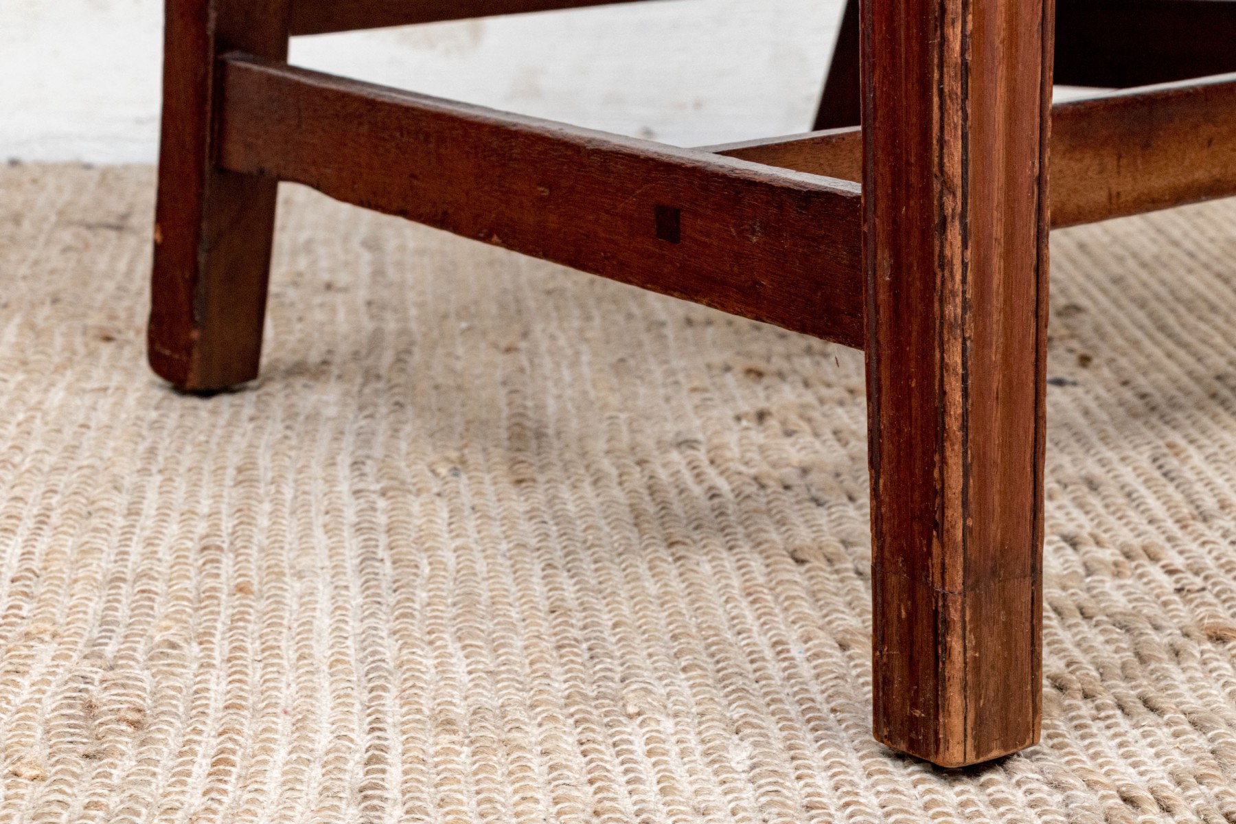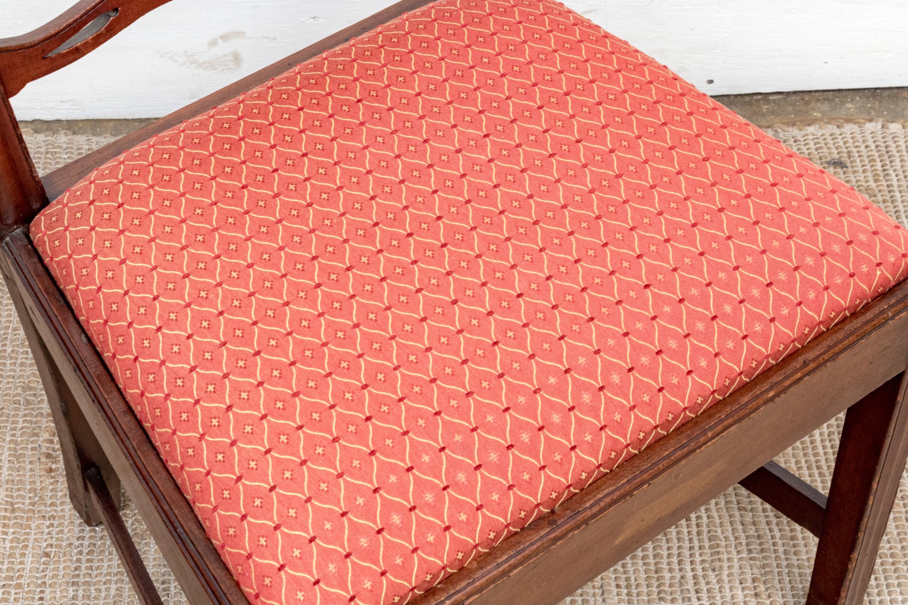 The pierced serpentine crest above three similarly pierced graduated slats and removable upholstered seat, on square tapering legs joined by stretchers.
