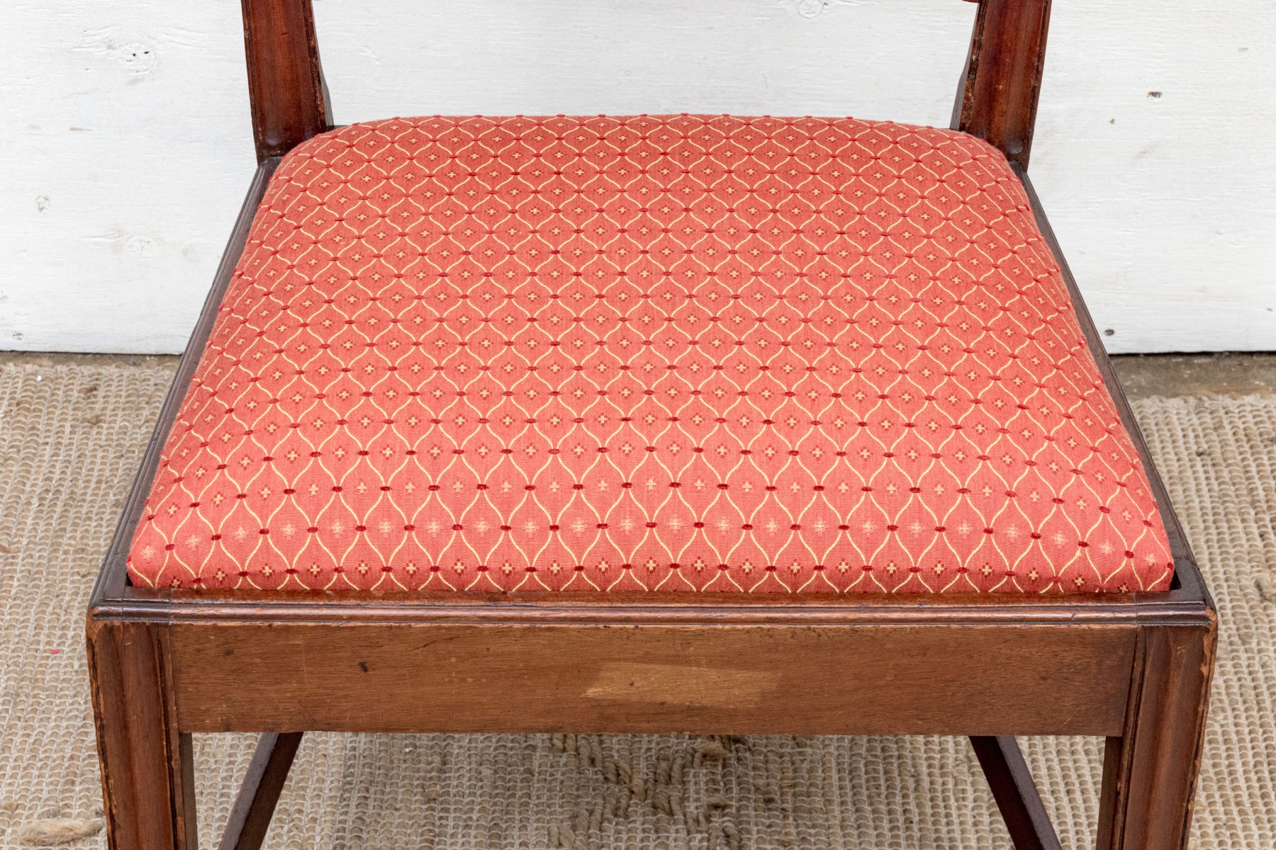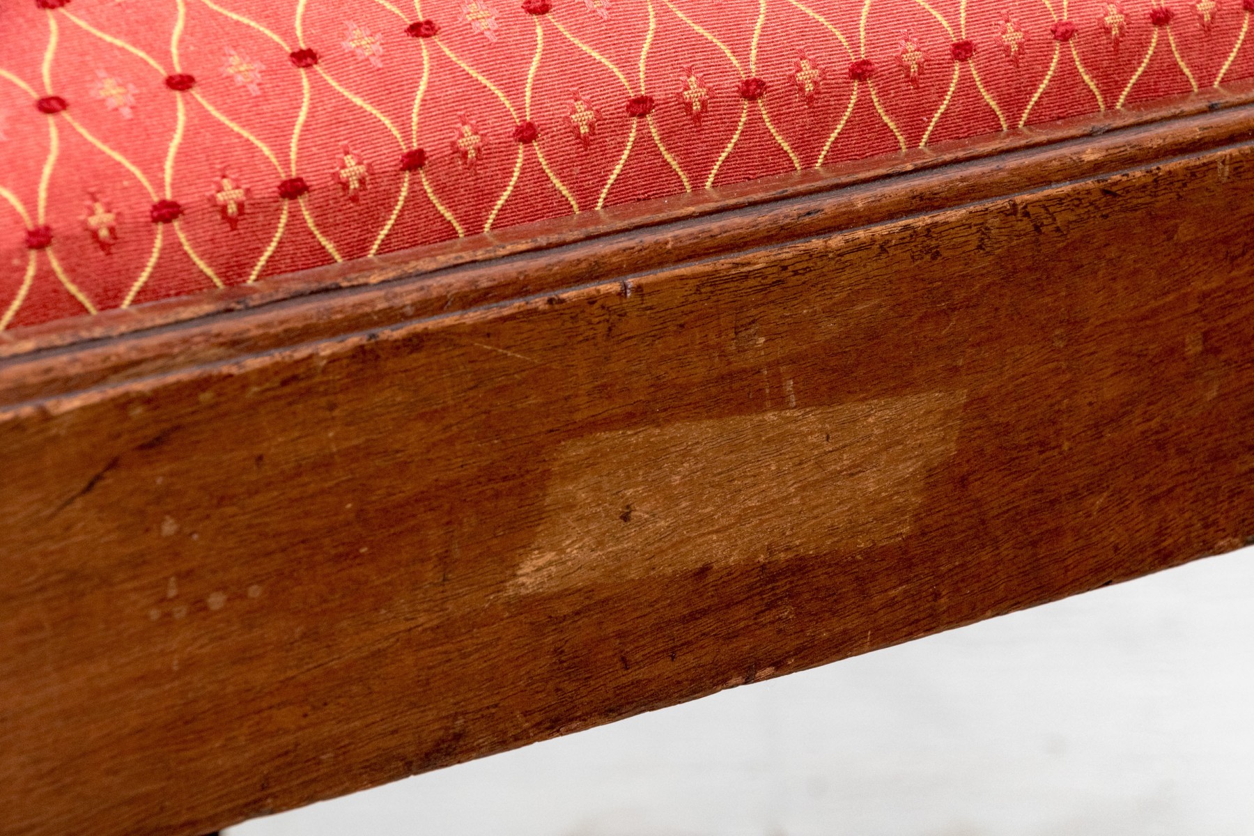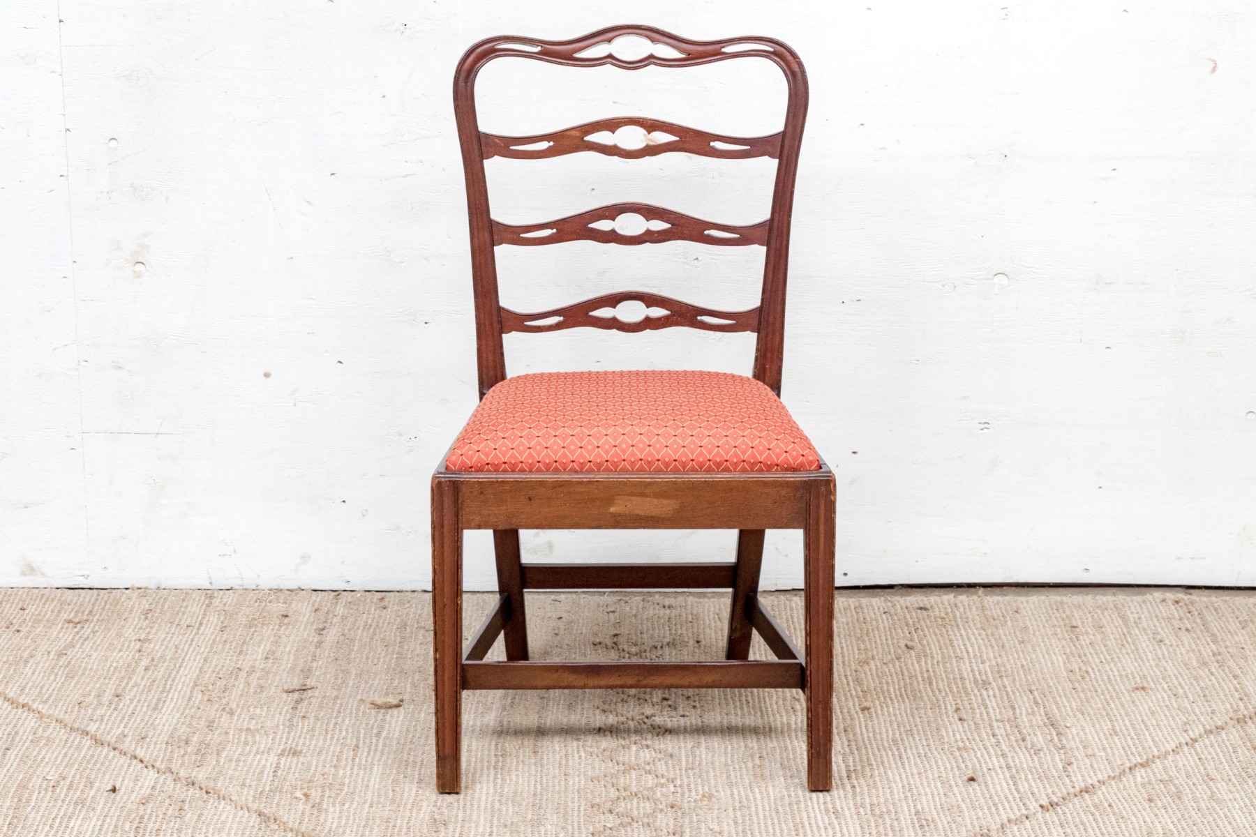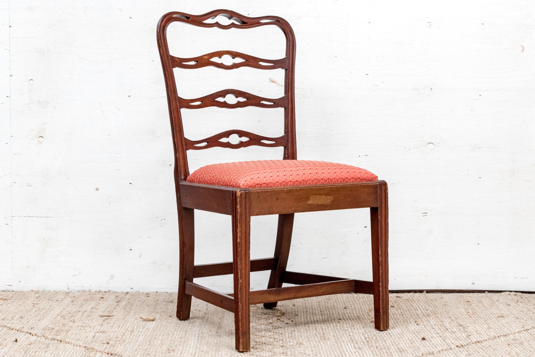 The pierced serpentine crest above three similarly pierced graduated slats and removable upholstered seat, on square tapering legs joined by stretchers.