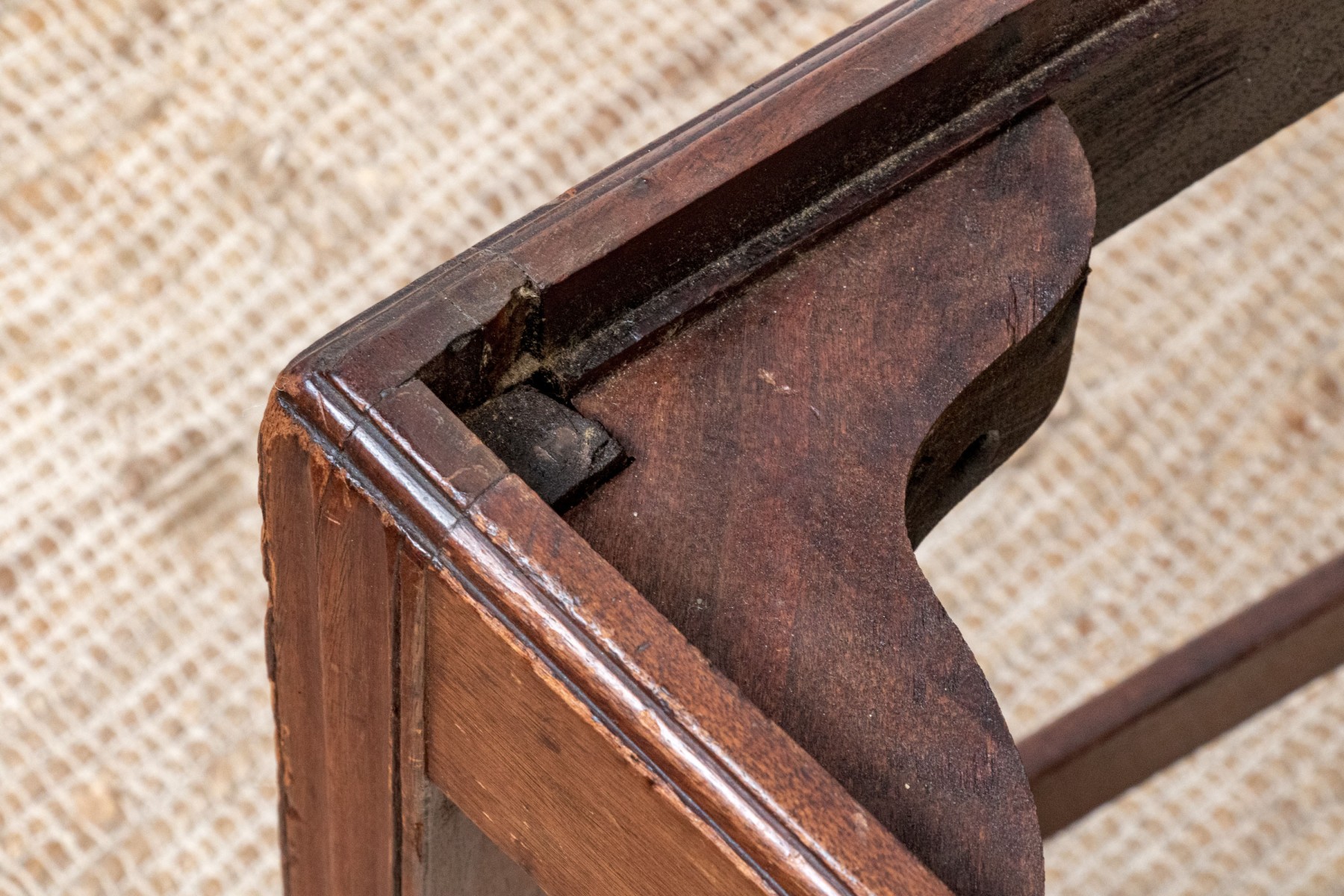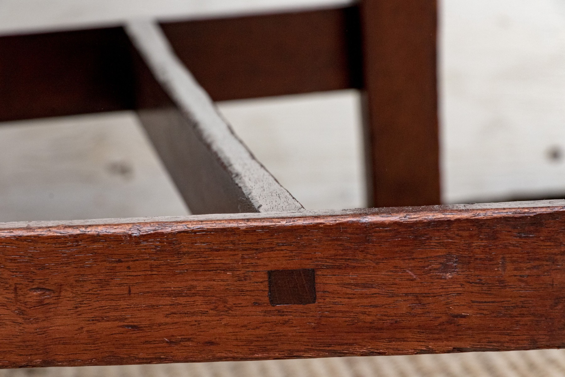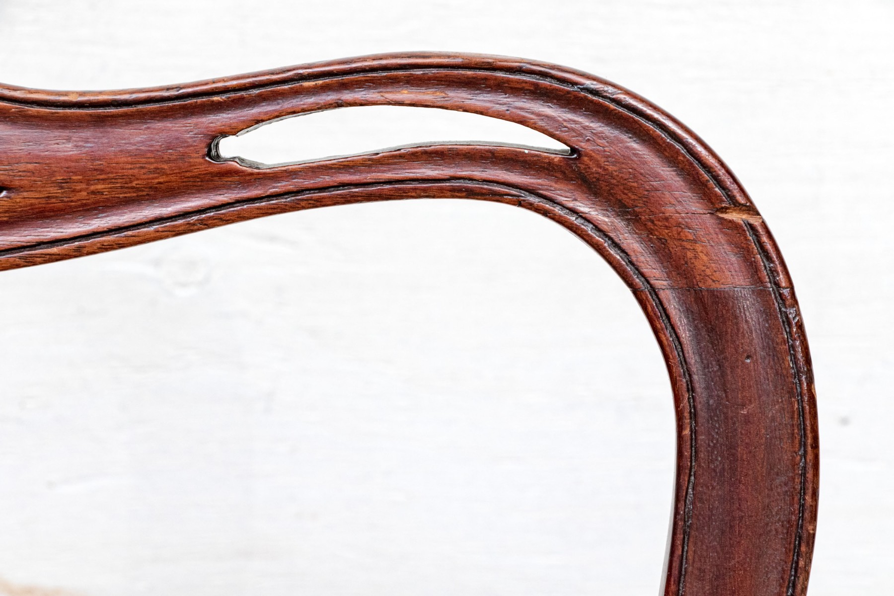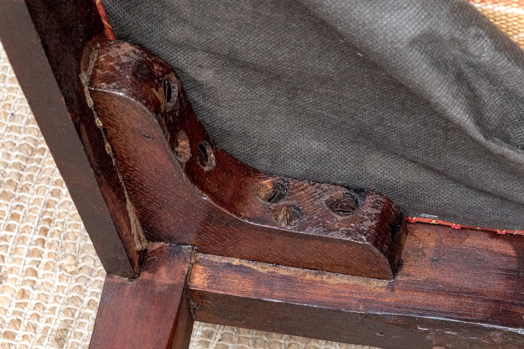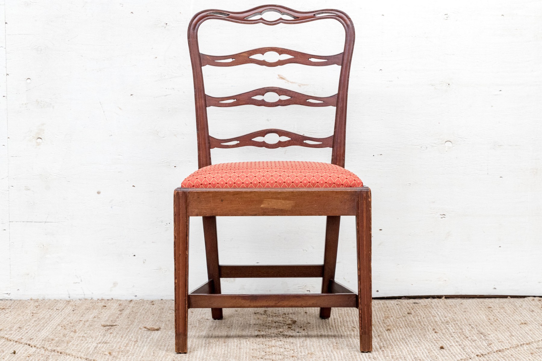 The pierced serpentine crest above three similarly pierced graduated slats and removable upholstered seat, on square tapering legs joined by stretchers.