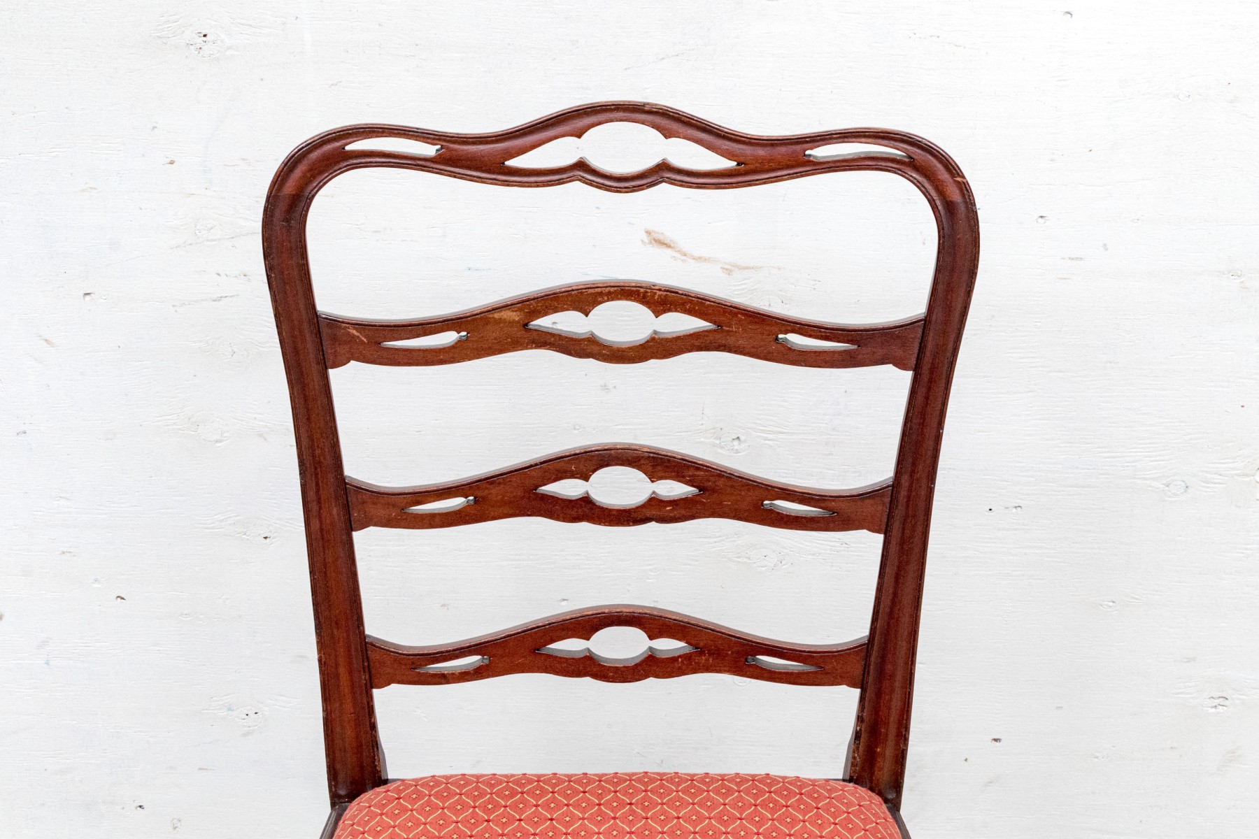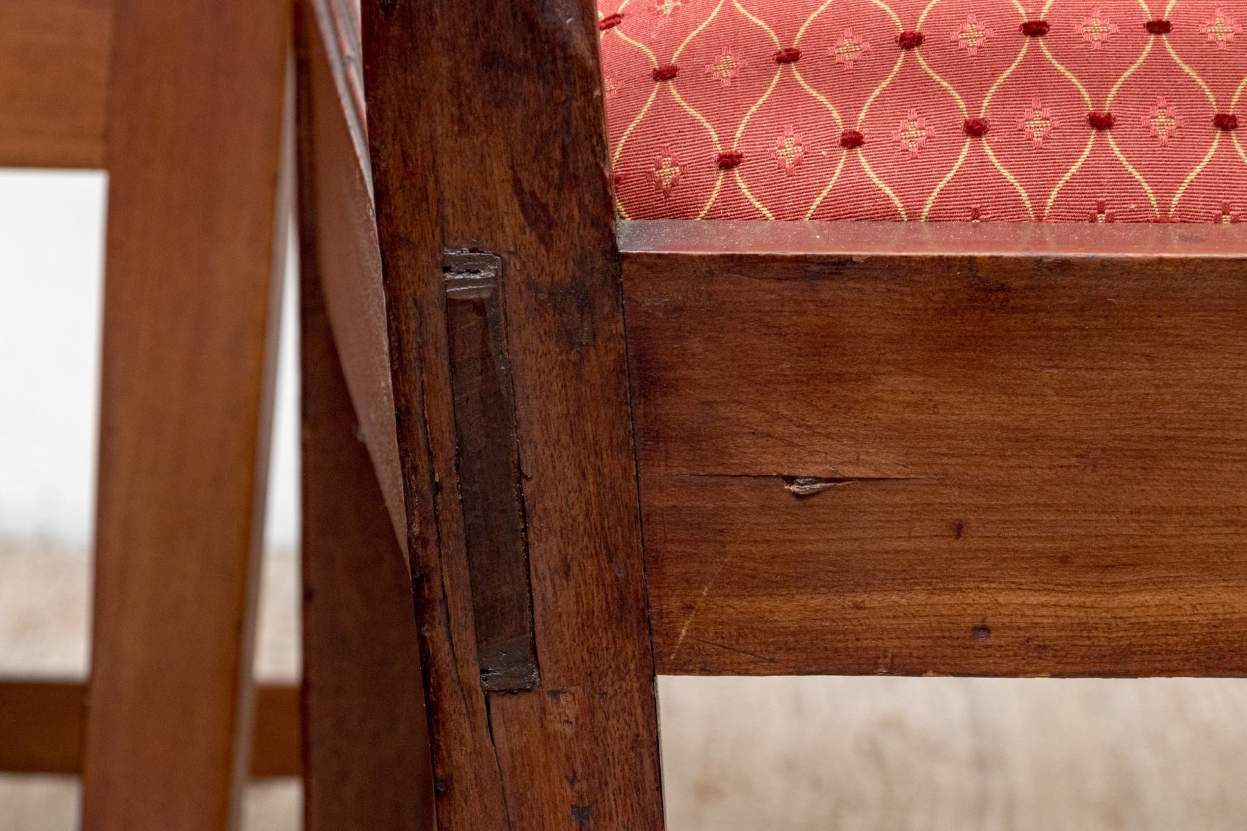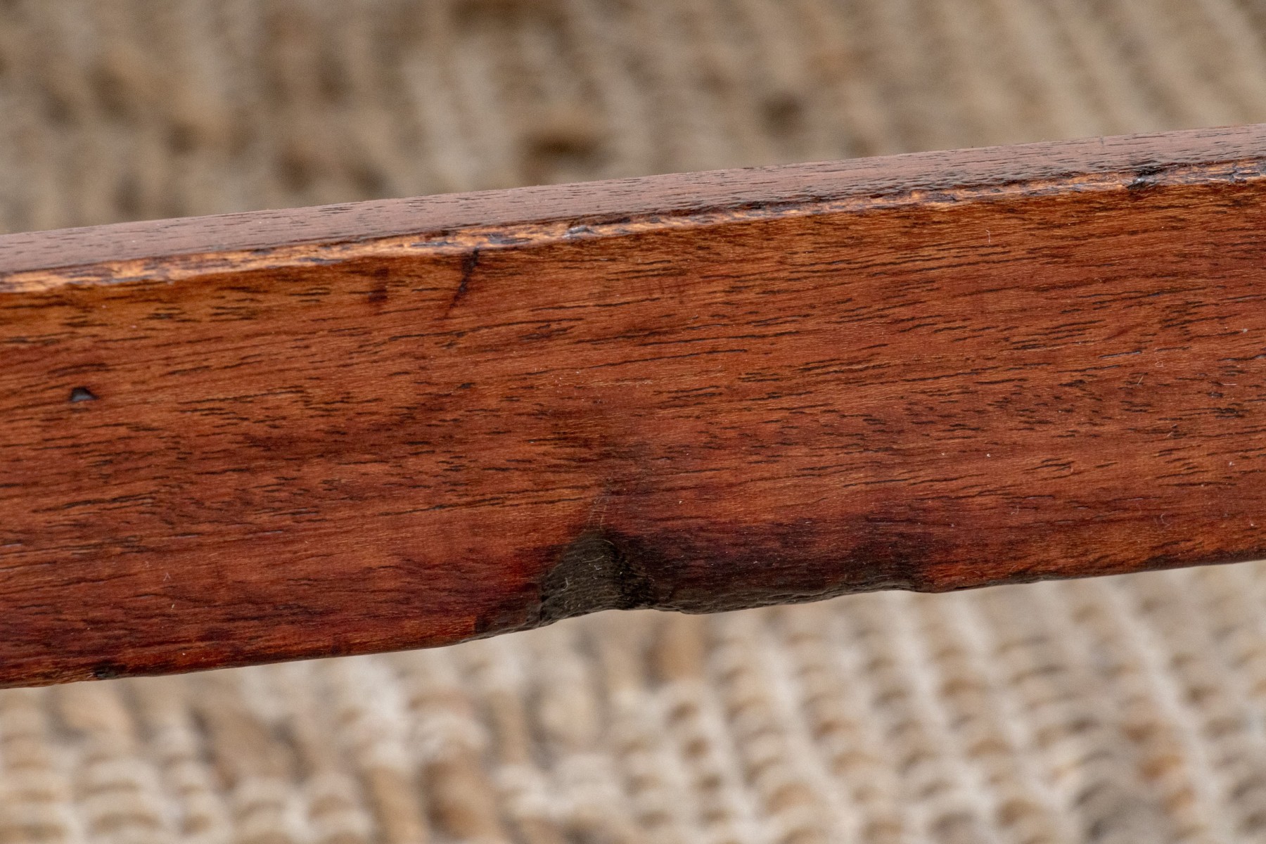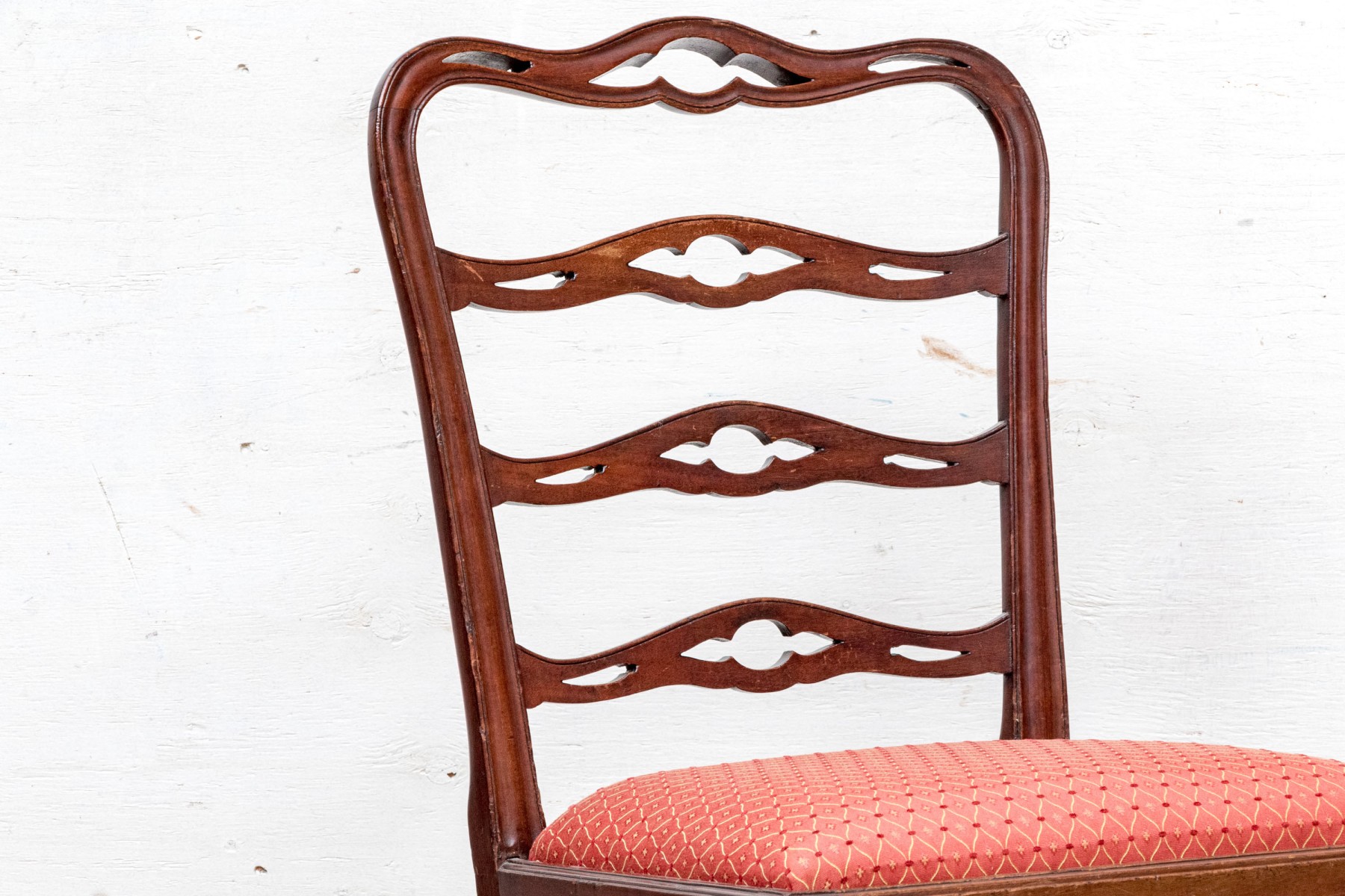 The pierced serpentine crest above three similarly pierced graduated slats and removable upholstered seat, on square tapering legs joined by stretchers.