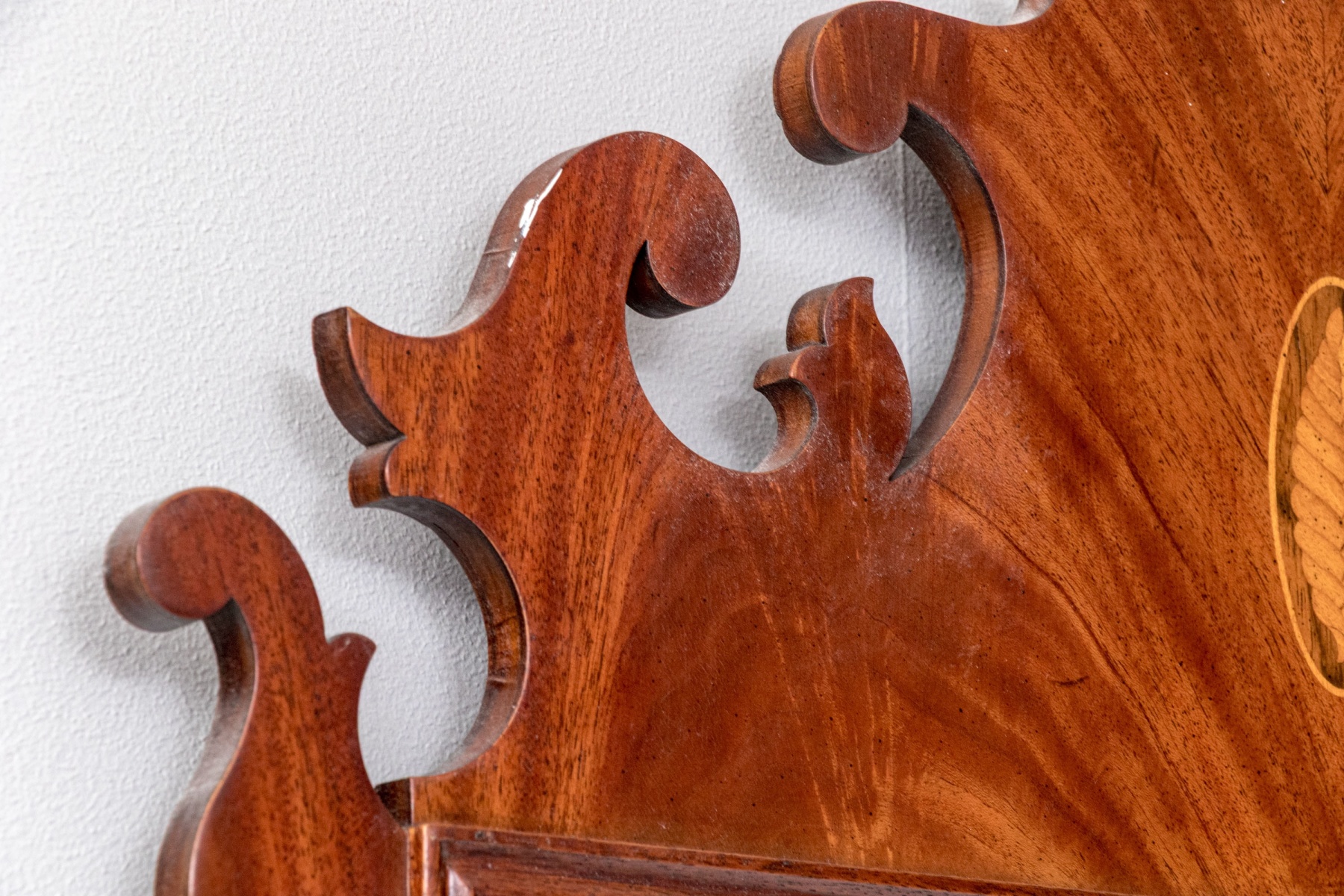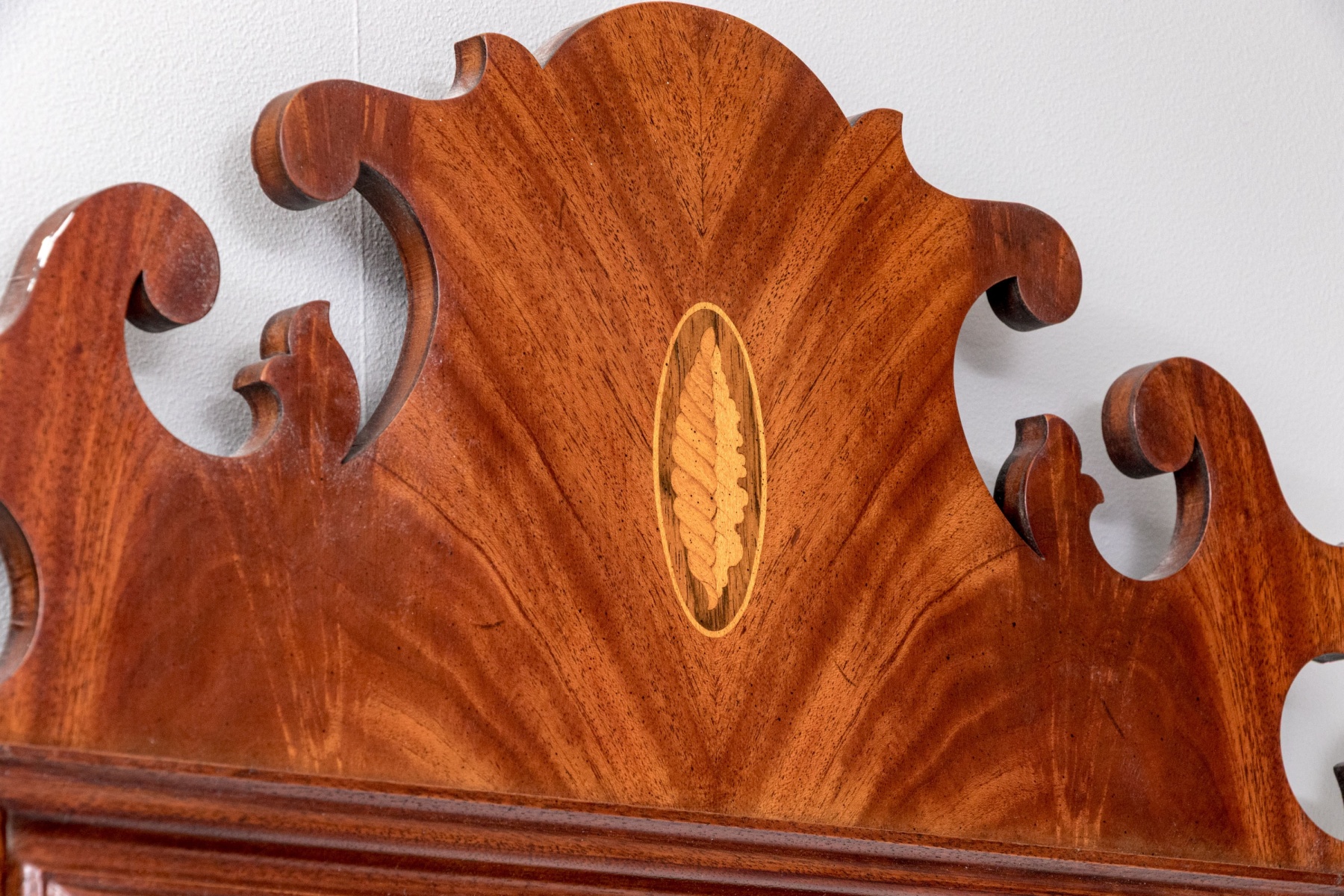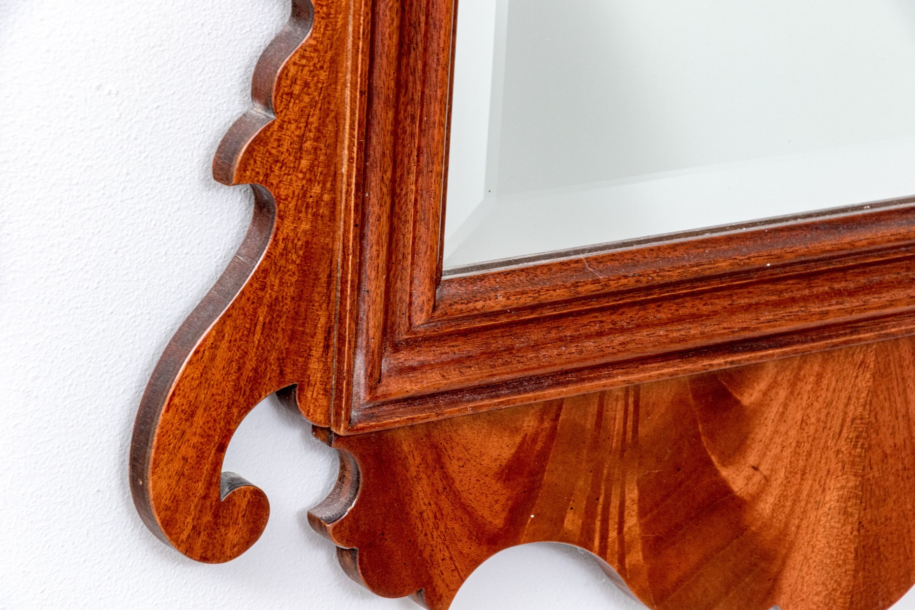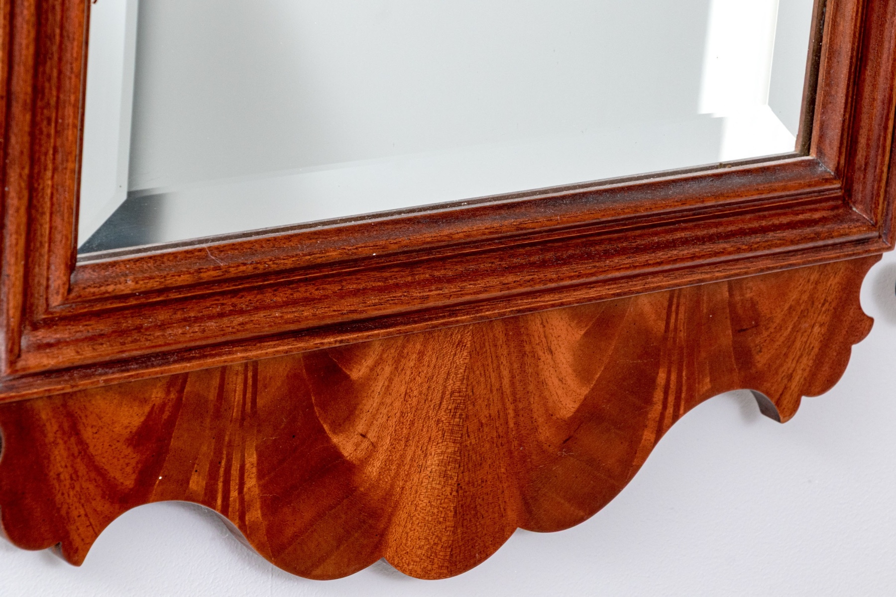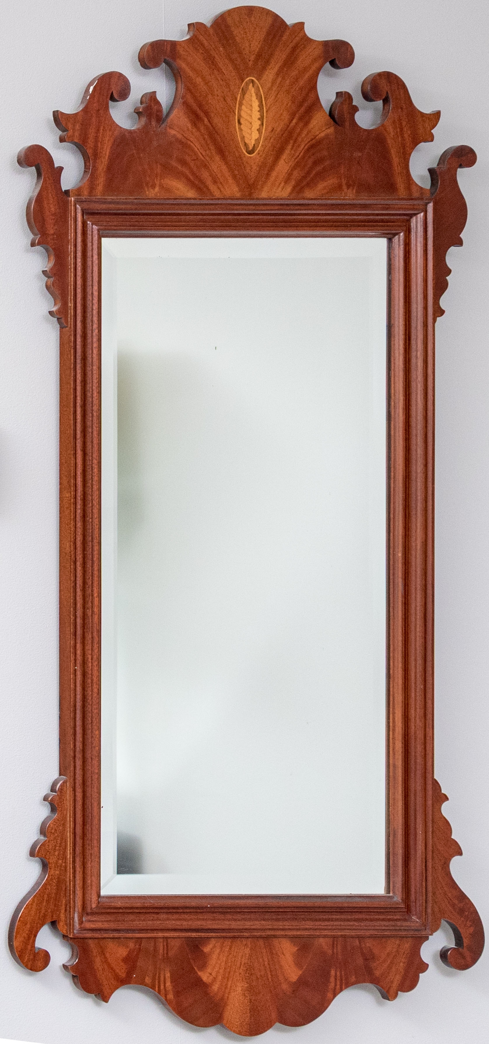 A gorgeous mirror, possibly Henredon, designed in classic Chippendale style with a rectangular beveled plate in a banded frame surrounded with elegantly scrolled an flourished details along the top and bottom crest. The frame is beautifully veneered in warm-toned medium brown mahogany and detailed with an oval marquetry medallion at the top.