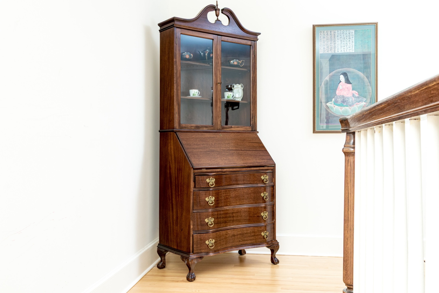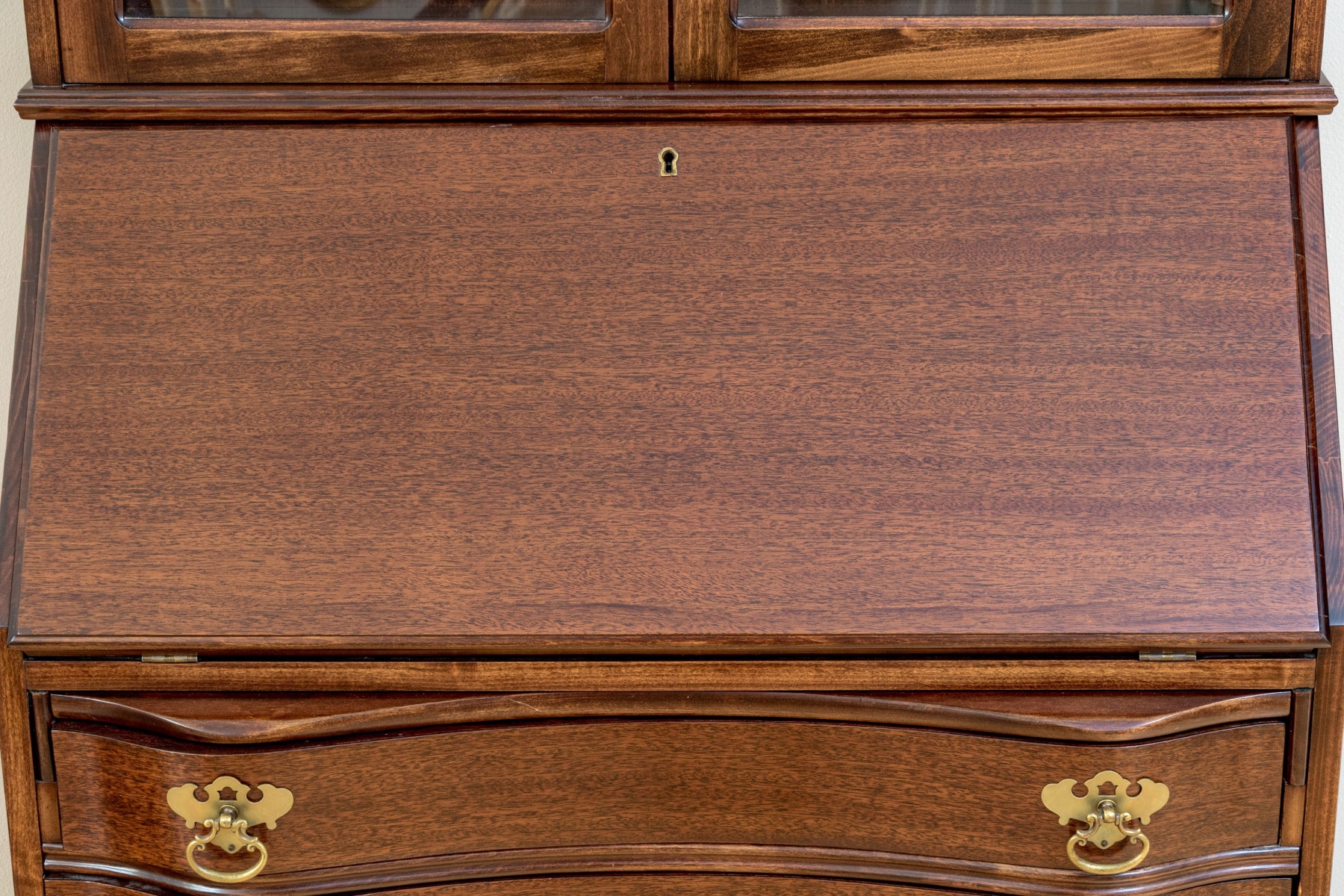 In two pieces, but top is screwed into the lower case with three screws under the pair of hinged doors. Standing on front carved cabriole legs with ball and claw feet, the lower case with fabulous serpentine front with four long drawers with pair of brass pulls for each drawer. Above the slant front desk opens up and has mechanical mechanism that as the desk comes down two recessed supports pull out to support the desk. With desk open there is an array of interior open compartments and drawers. Above are two glass paned hinged doors with two shelves and a broken arch pediment with central carved lidded urn form finial.
