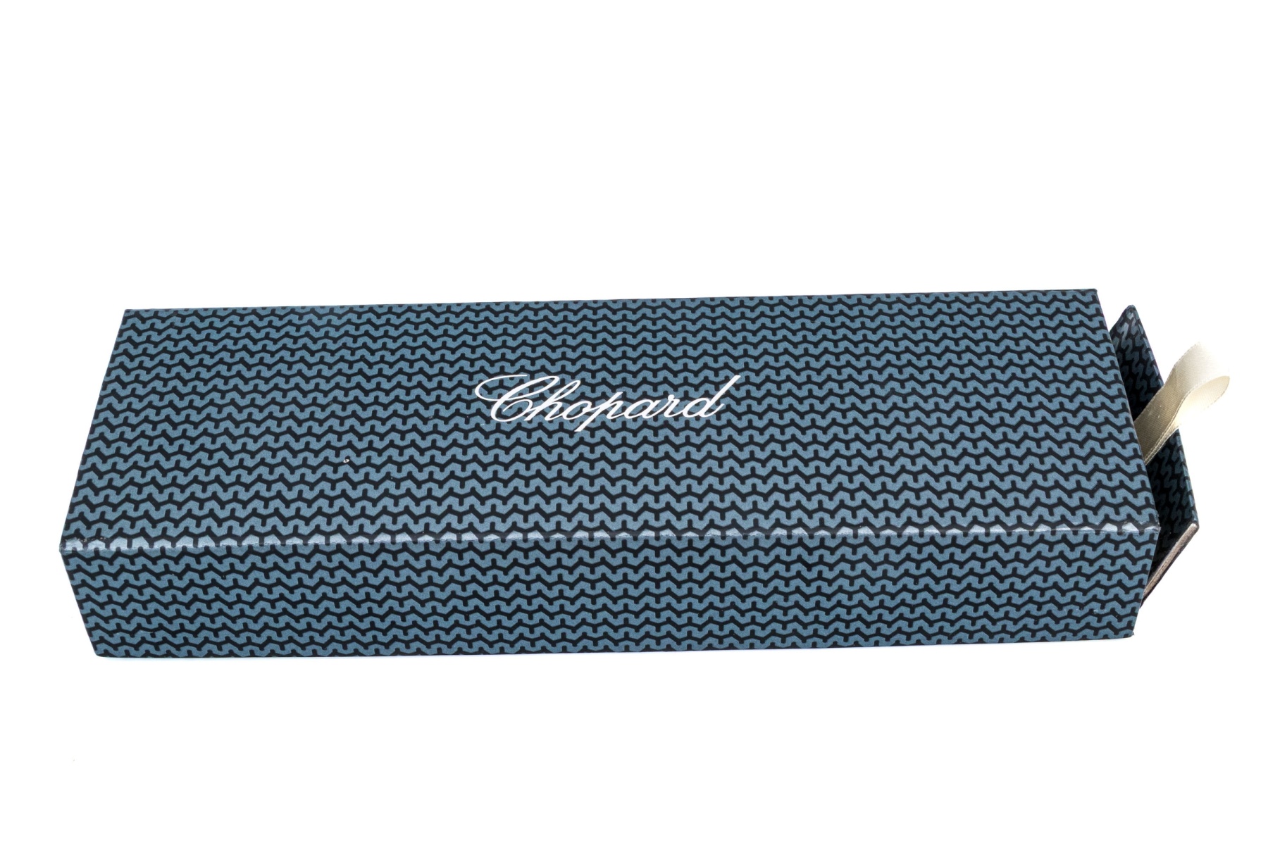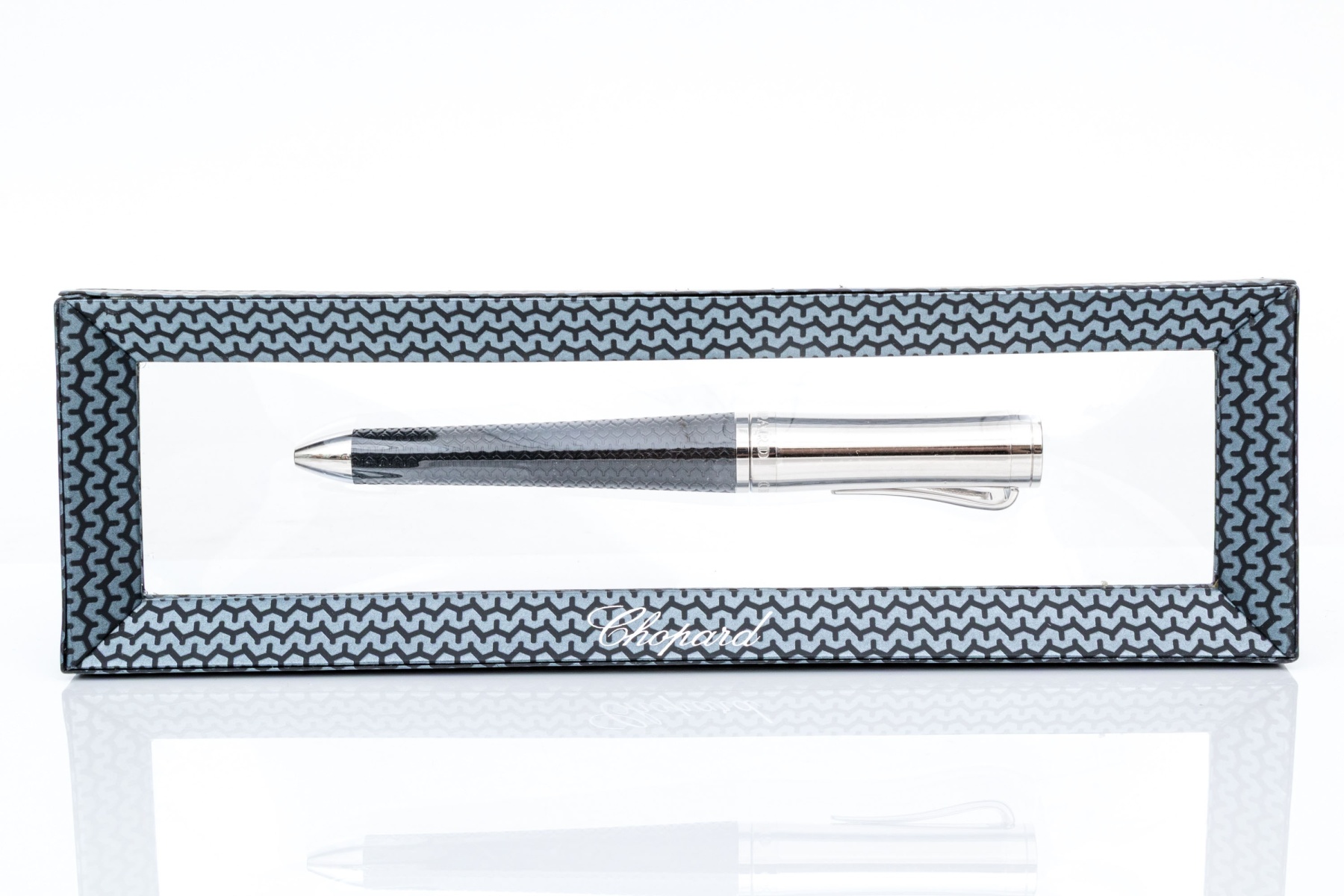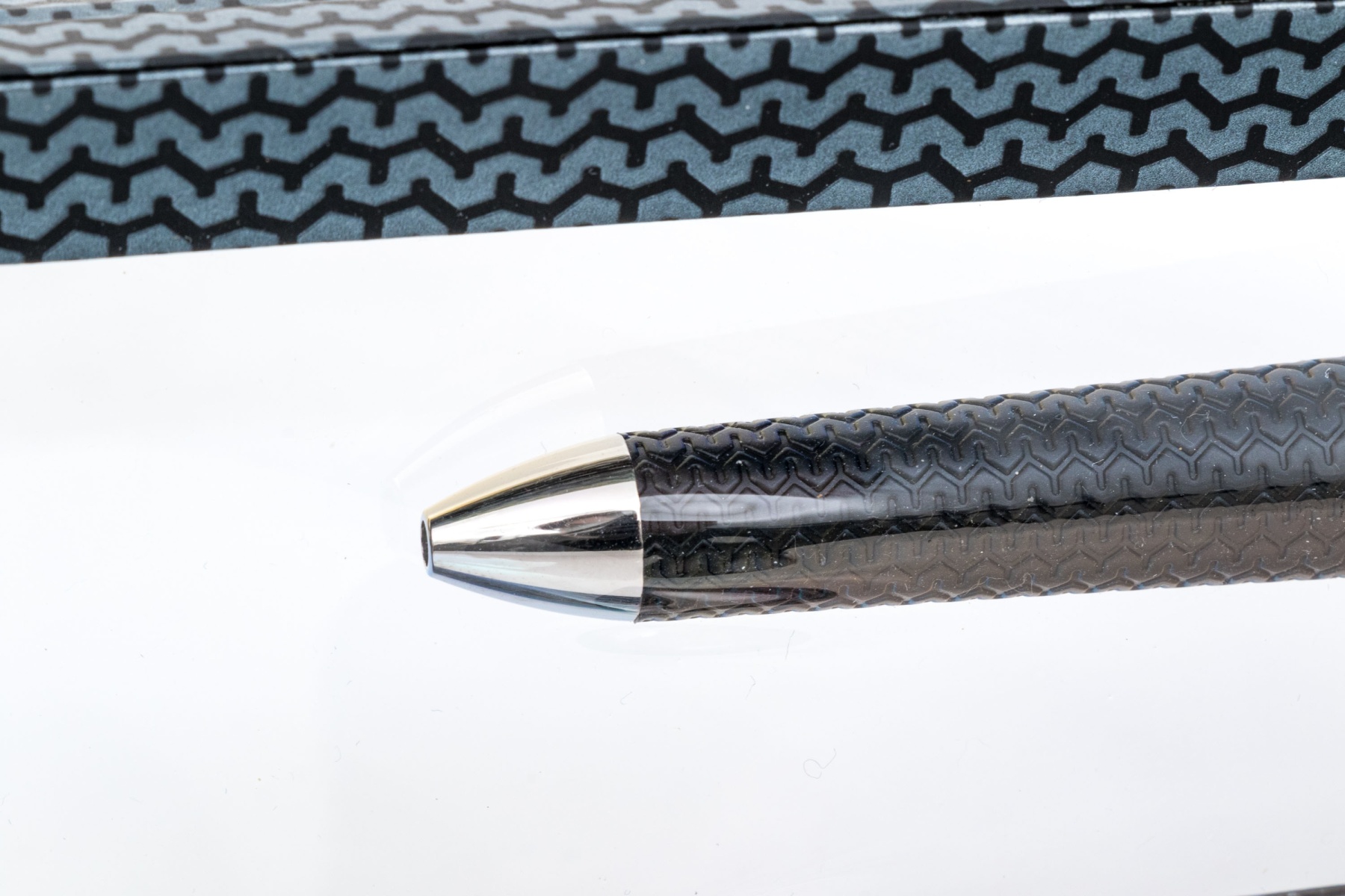 Chopard Mille Miglia classic racing ballpoint pen, with box and open papers. This fabulous steel pen is a ballpoint style, with the classic Mille MIglia rubber tread patterned racing tread bottom. With box and open papers