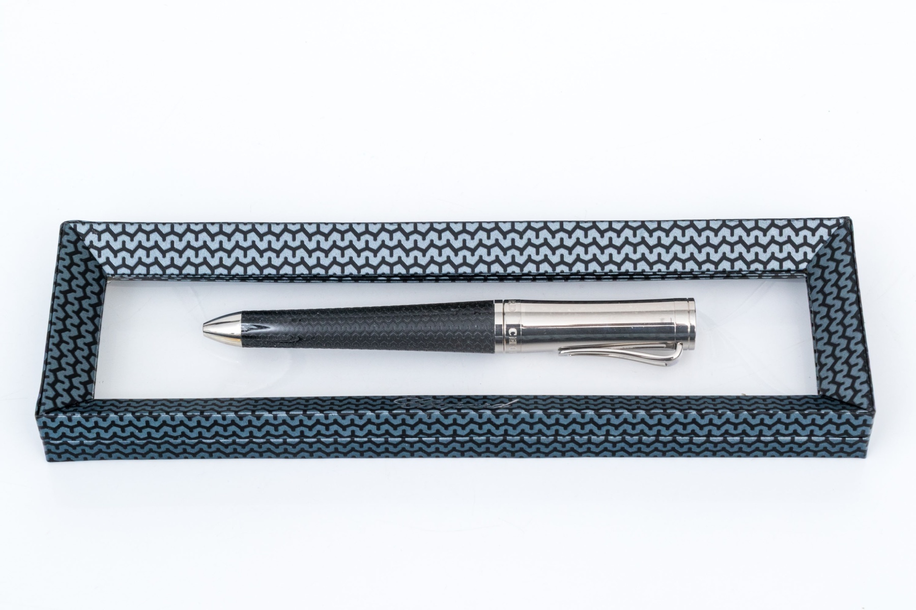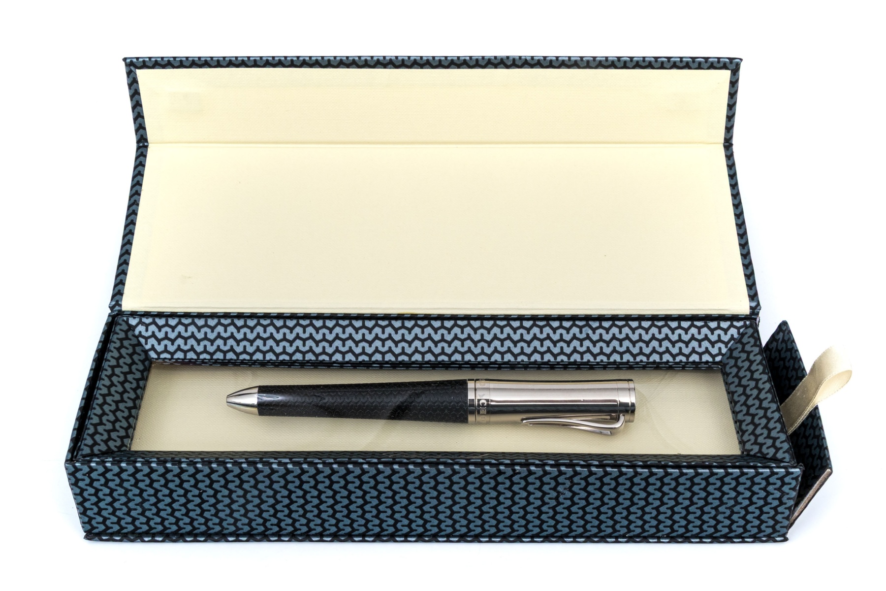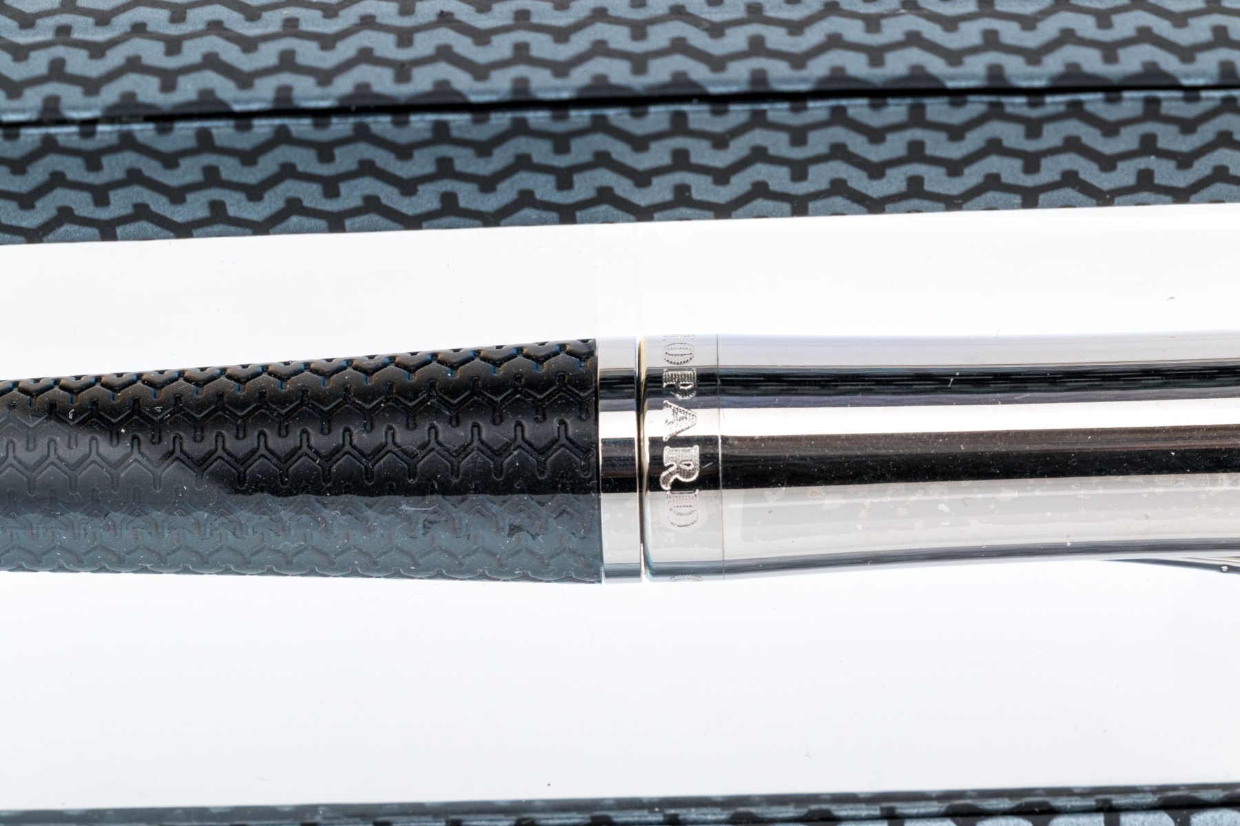 Chopard Mille Miglia classic racing ballpoint pen, with box and open papers. This fabulous steel pen is a ballpoint style, with the classic Mille MIglia rubber tread patterned racing tread bottom. With box and open papers