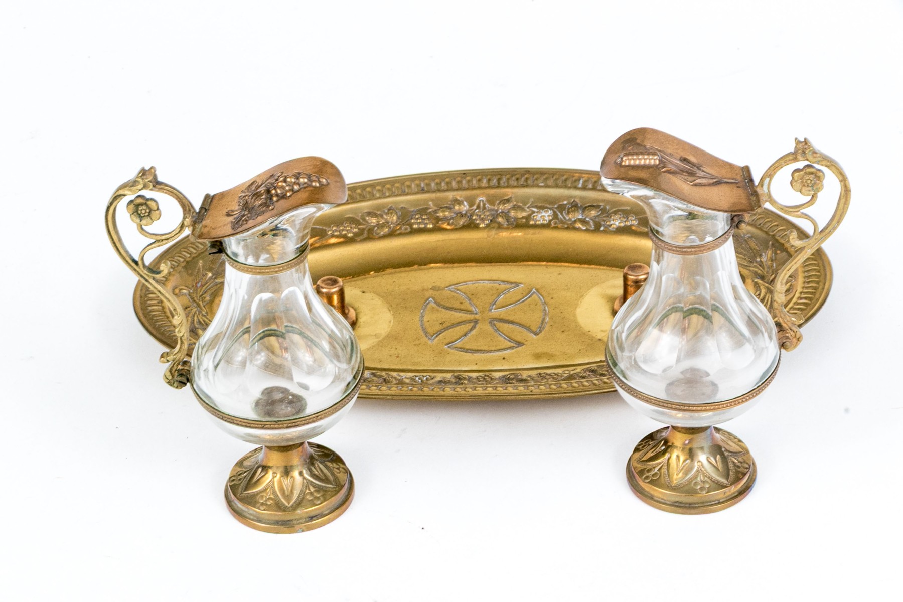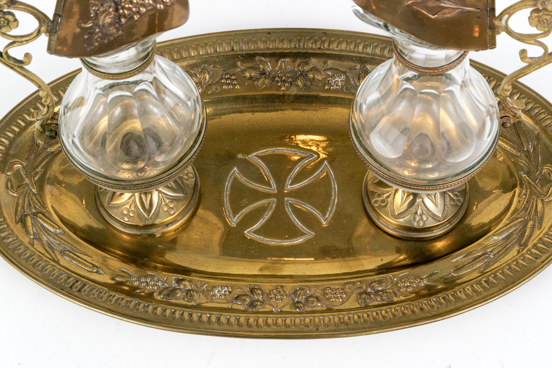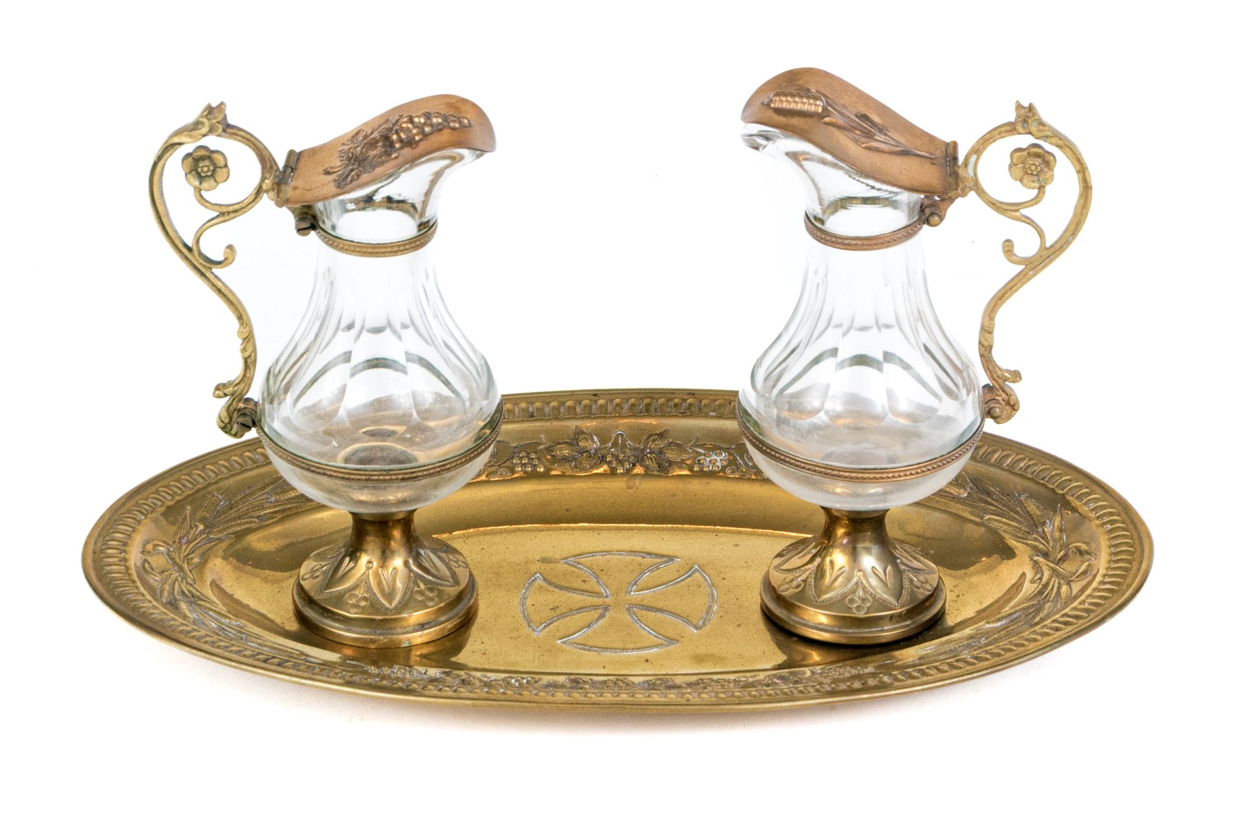 A wonderful Christian altar cruet set including two crystal decanters with hinged lids on foliage handles and circular feet. Accompanied by an oval tray with decorated grape and vine repousse and a cross at the center.