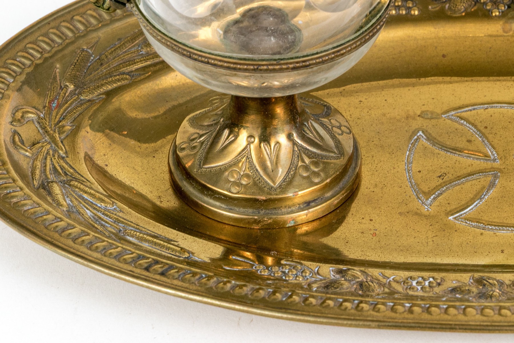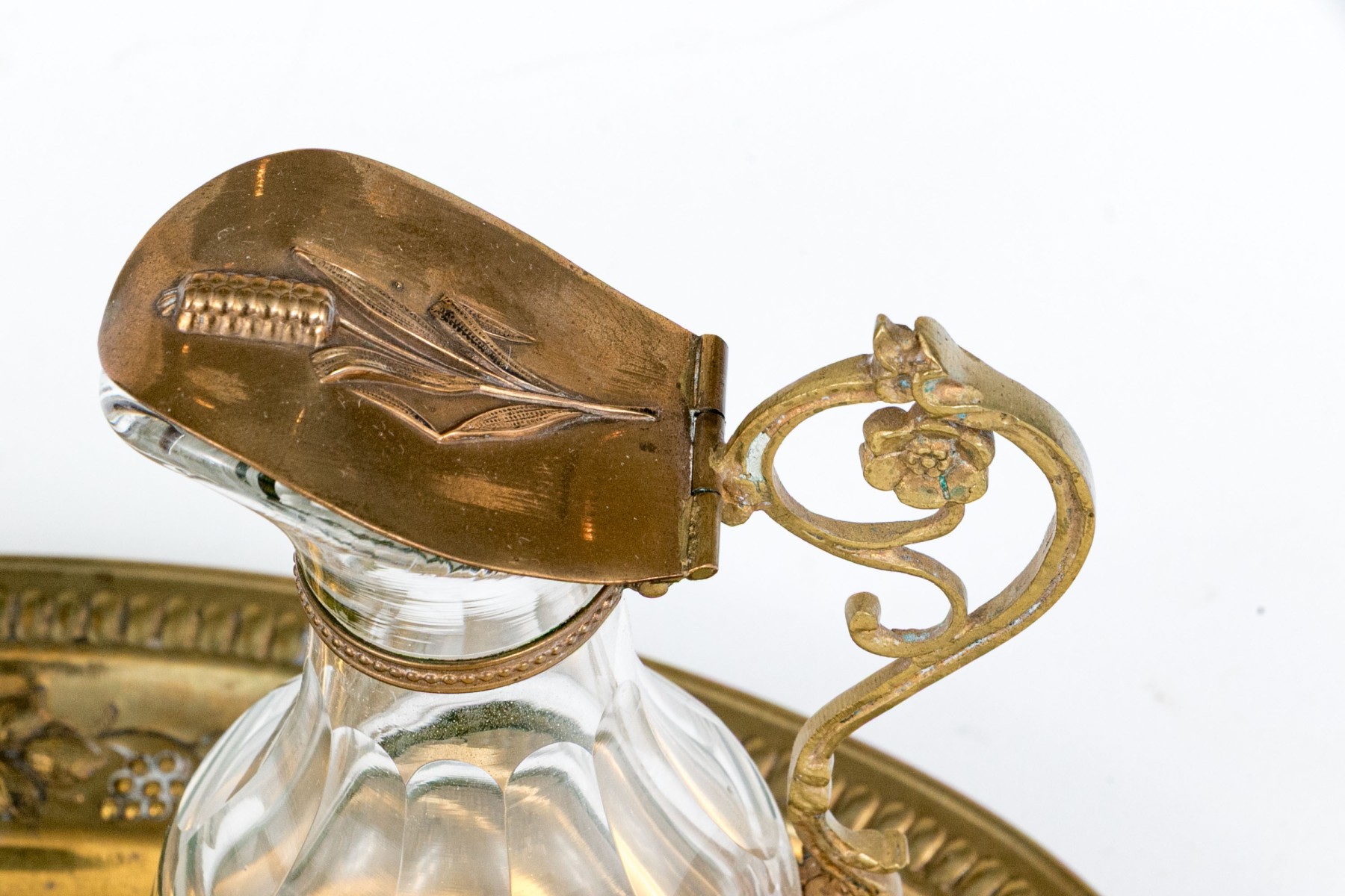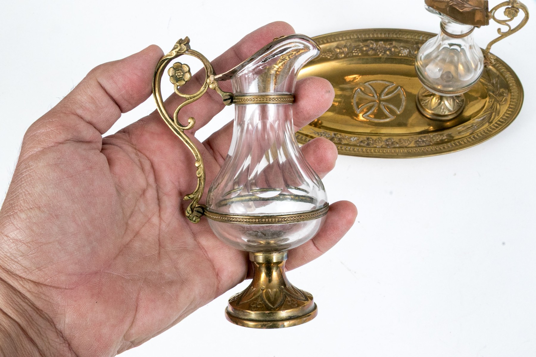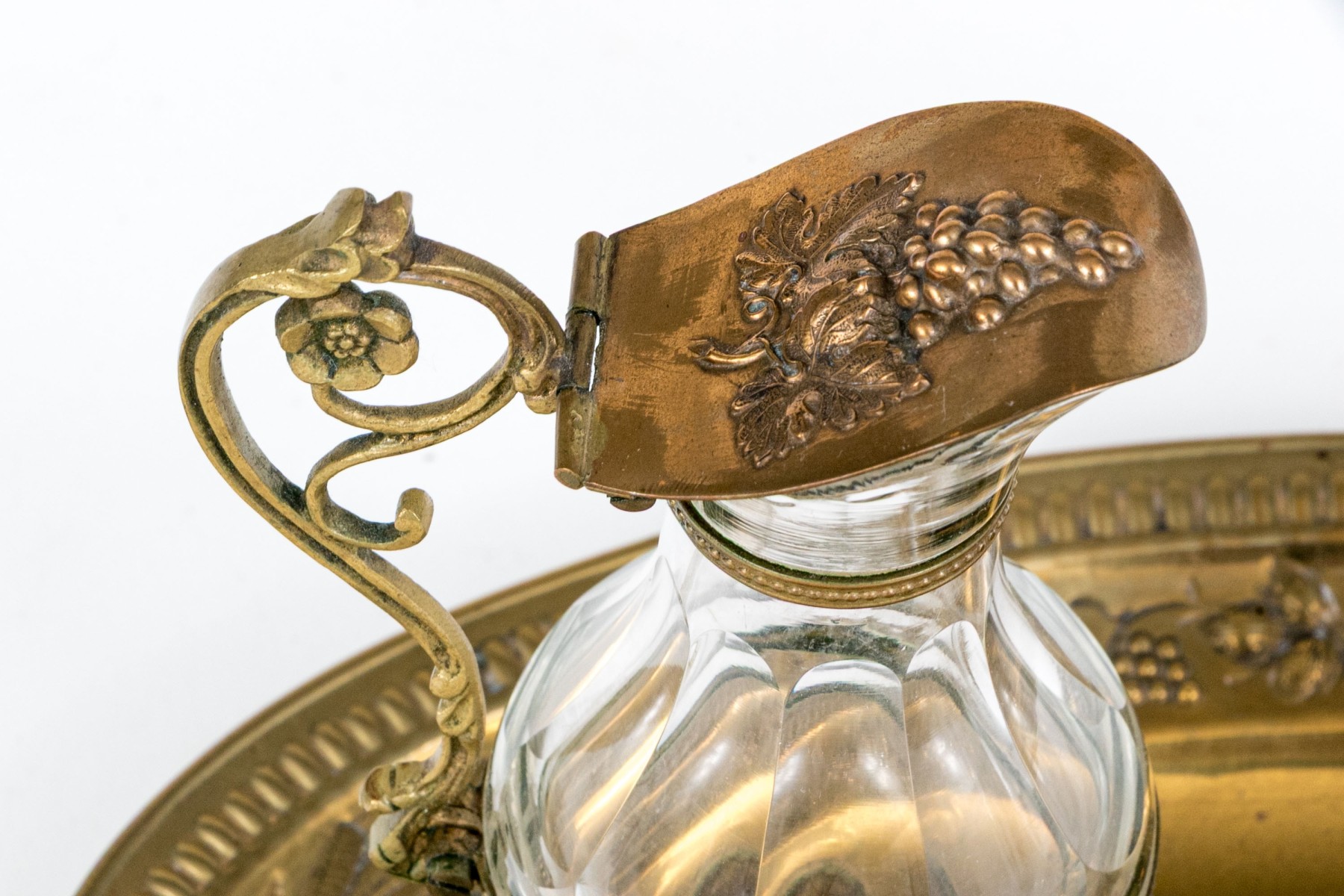 A wonderful Christian altar cruet set including two crystal decanters with hinged lids on foliage handles and circular feet. Accompanied by an oval tray with decorated grape and vine repousse and a cross at the center.
